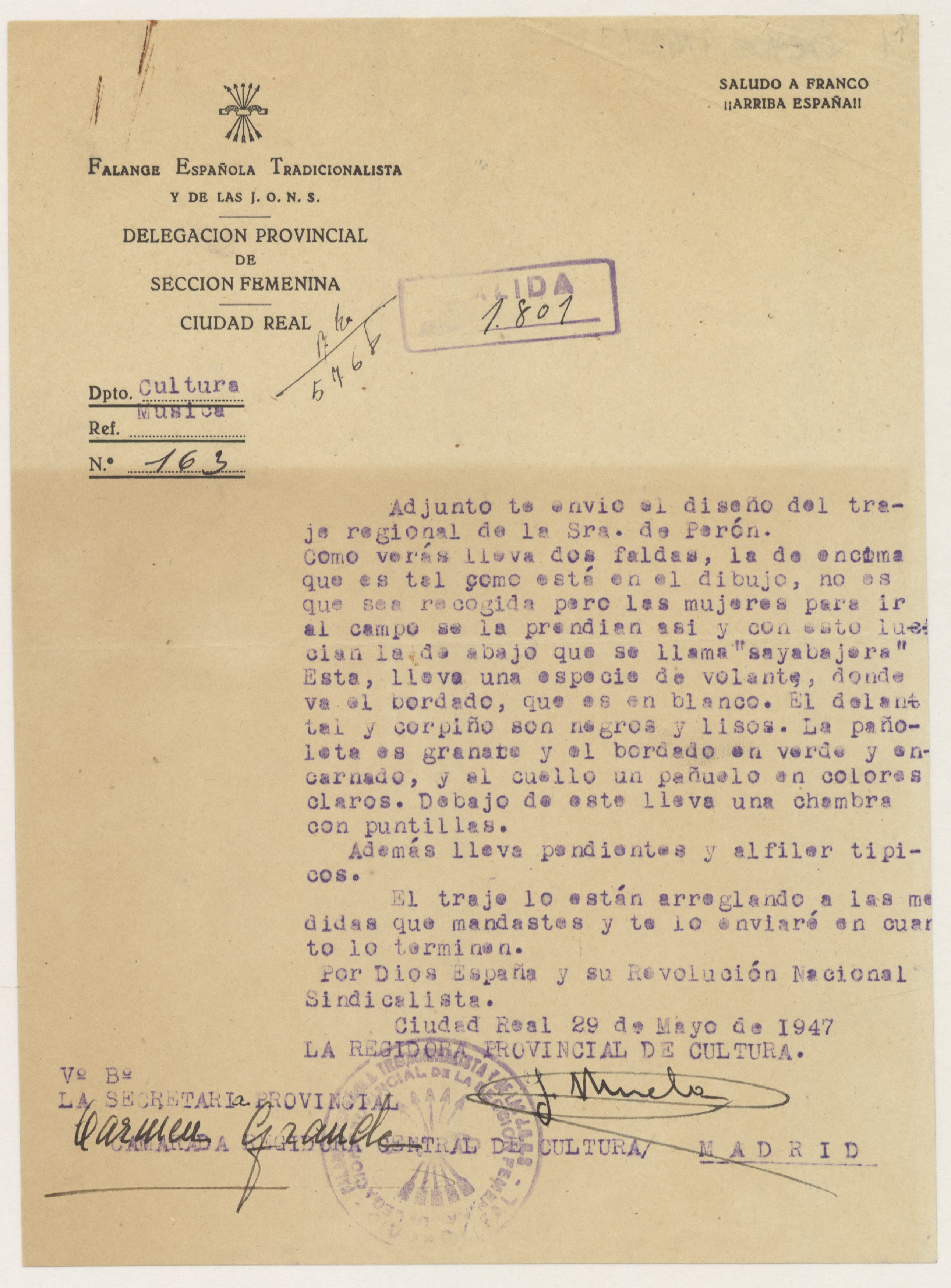 Carta de la Regidora Provincial de Cultura y de la Secretaria Provincial a la Regidora Central de Cultura adjuntando el diseño del traje regional femenino destinado a regalo para Eva Perón.