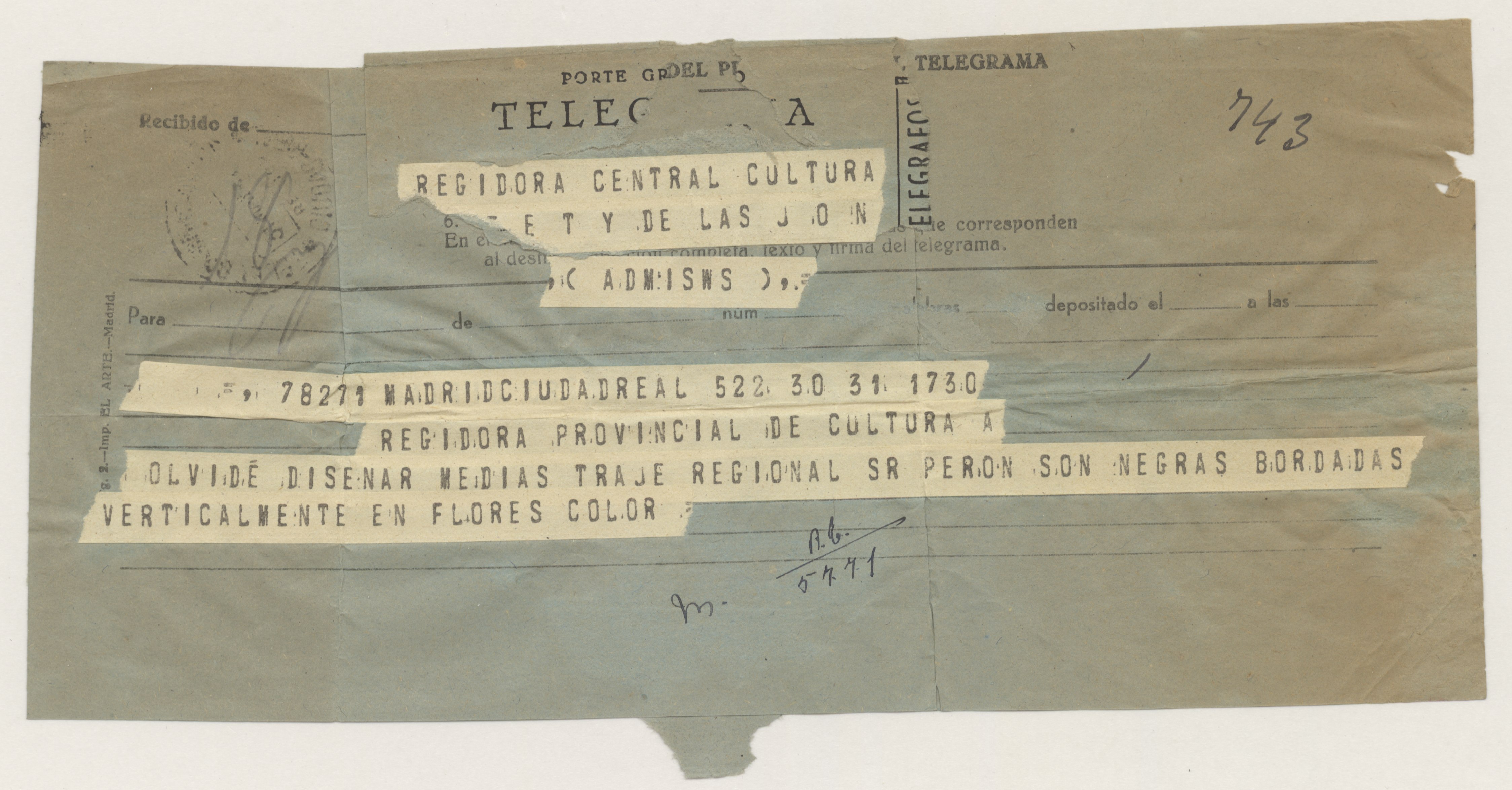 Telegrama de la Regidora Provincial de Cultura a la Regidora Central de Cultura con la descripción de las medias del traje regional femenino destinado a regalo para Eva Perón.