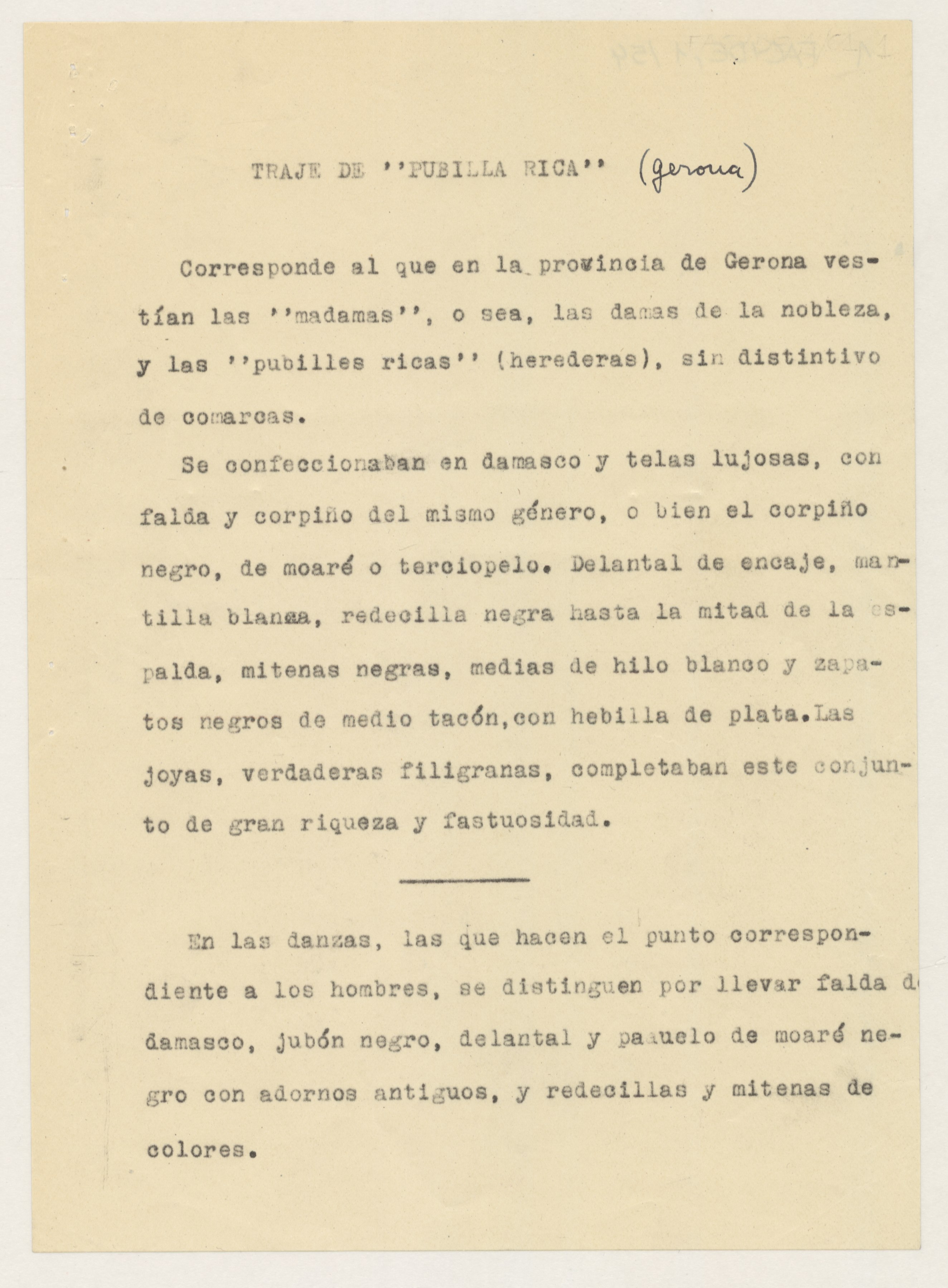 Informe sobre el traje típico de las damas de la nobleza y de las herederas ricas en la provincia de Gerona.