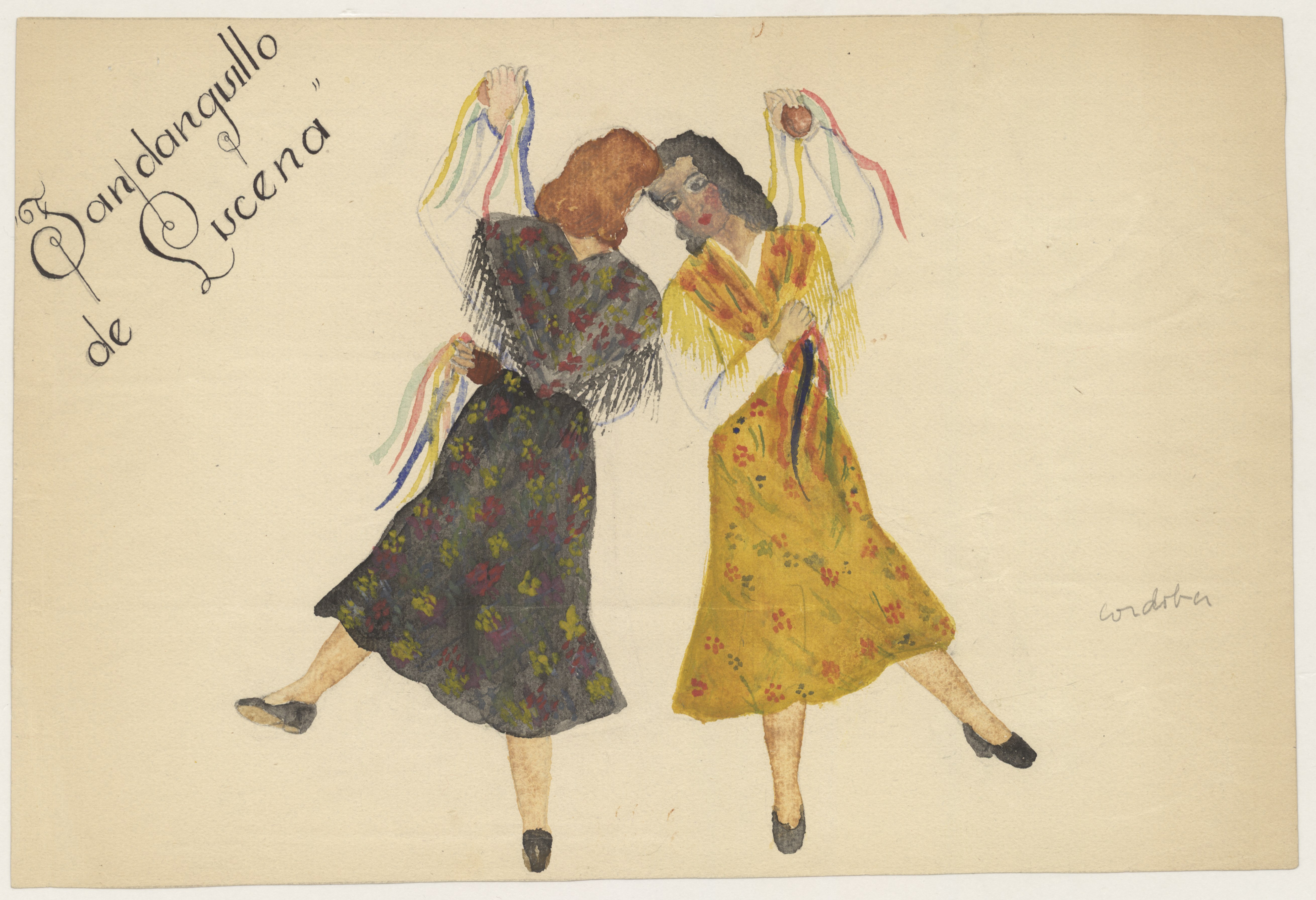 Dibujo de dos mujeres bailando vestidas con el traje típico de Lucena.