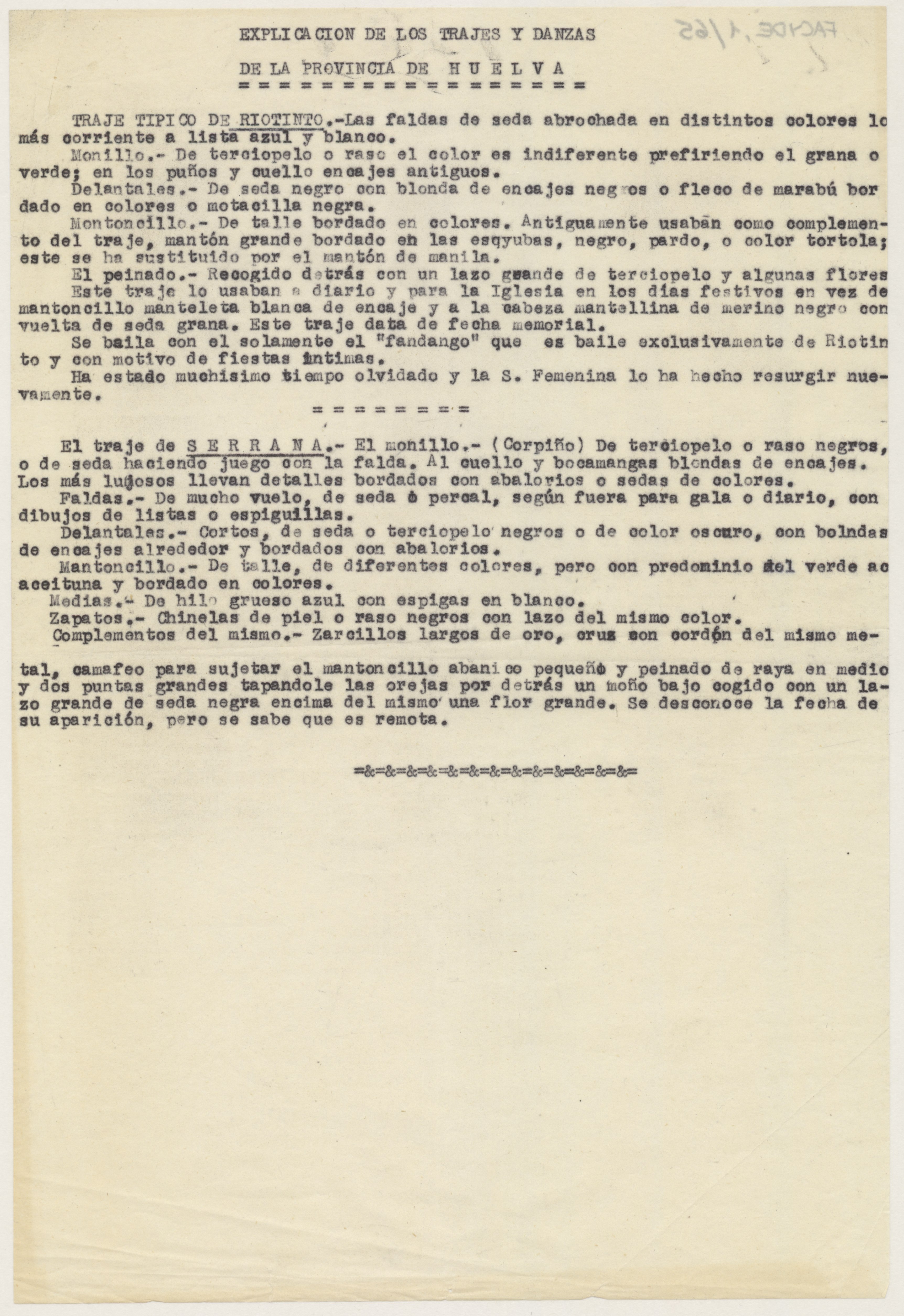 Informe con la explicación de trajes y danzas de la provincia de Huelva.