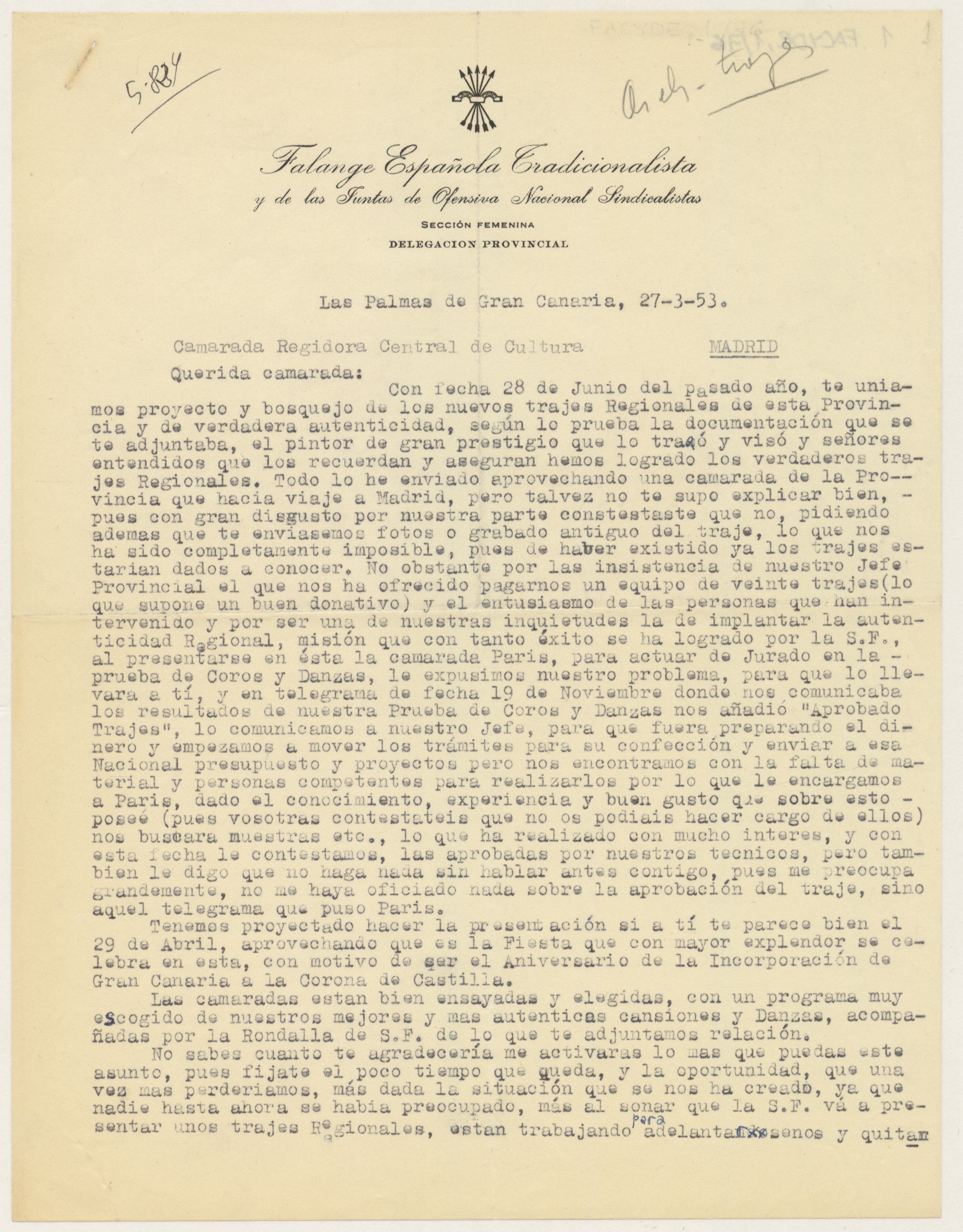 Carta de Ana Teresa Fernández, regidora provincial de Cultura, y de la Delegada Provincial de la Sección Femenina en Las Palmas a Adelaida del Pozo, regidora central de Cultura, adjuntando informe sobre la presentación del traje regional canario.