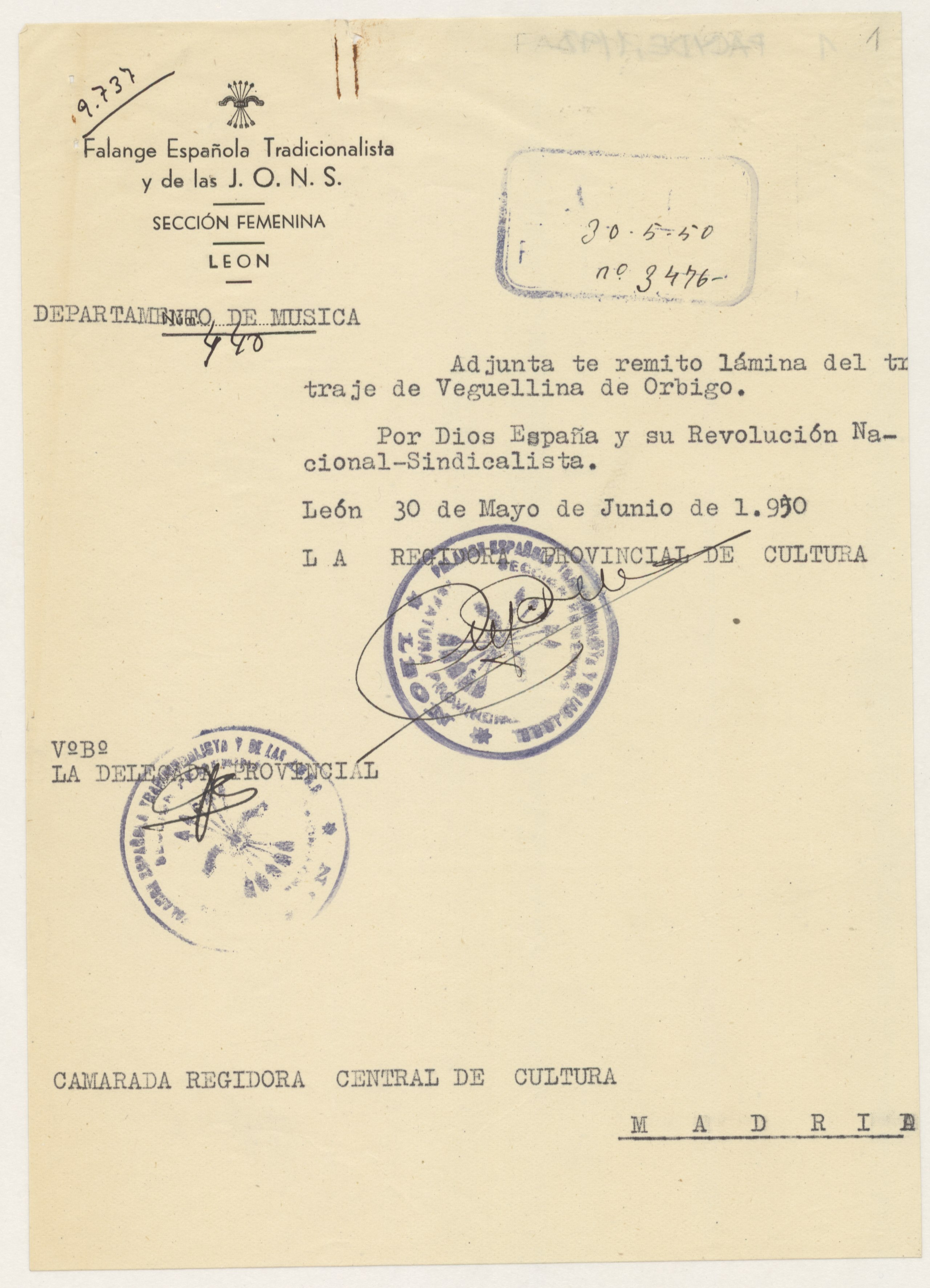 Carta de la Regidora Provincial de Cultura de la Sección Femenina en León y de la Delegada Provincial a la Regidora Central de Cultura donde le comunica que le adjunta una fotografía del traje típico de Pobladura de Pelayo García.