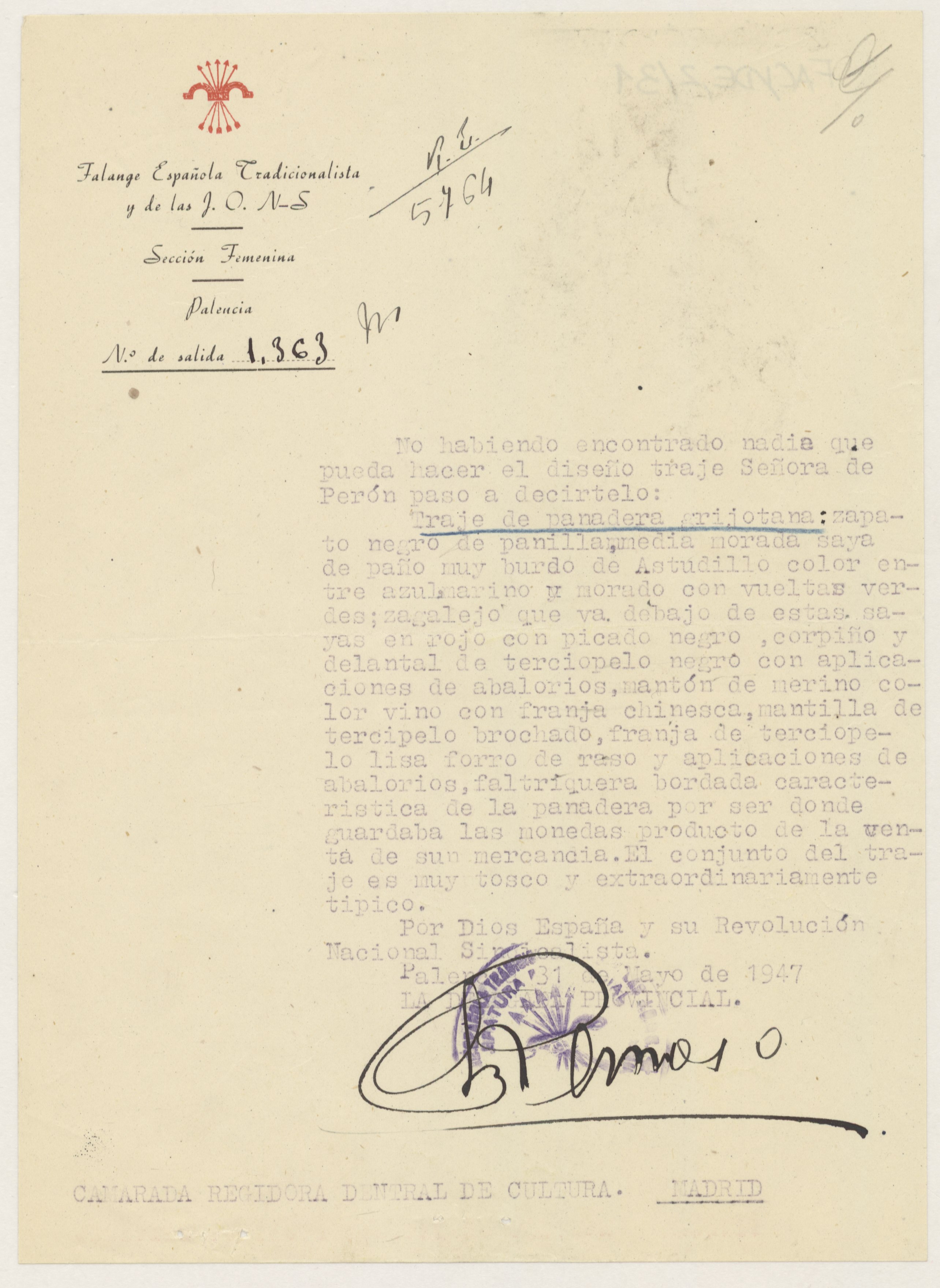 Carta de la Delegada Provincial de la Sección Femenina en Palencia a la Regidora Central de Cultura sobre el diseño del traje típico regional destinado a regalo para Eva Perón.
