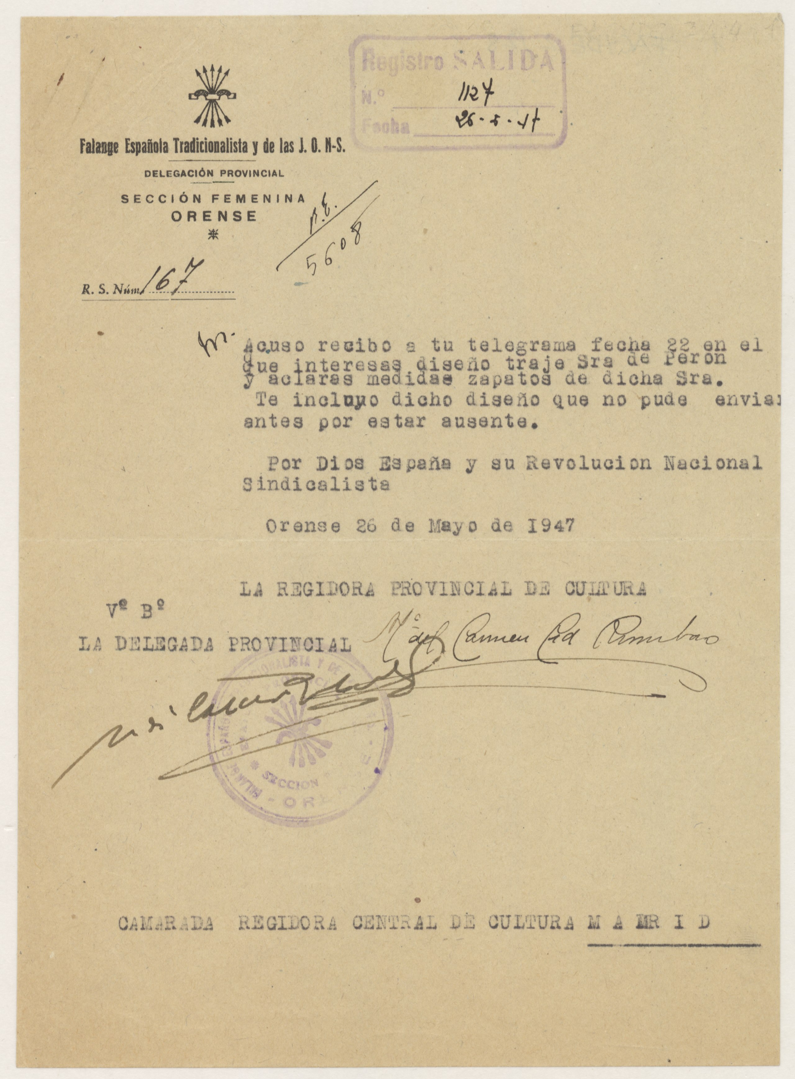 Carta de la Regidora Provincial de Cultura de la Sección Femenina en Orense y de la Delegada Provincial a la Regidora Central de Cultura sobre diseño del traje que va a ser regalado a Eva Perón.