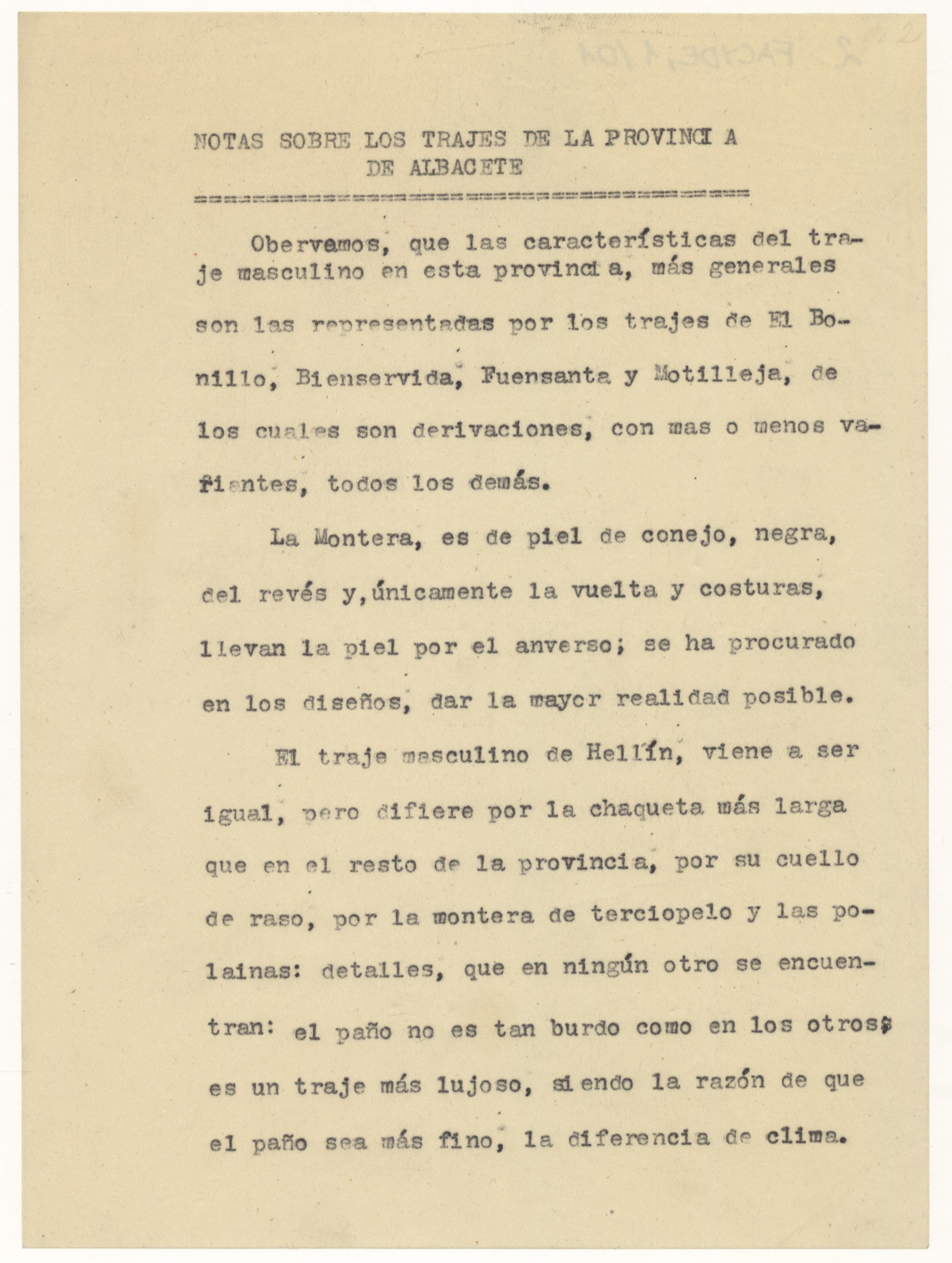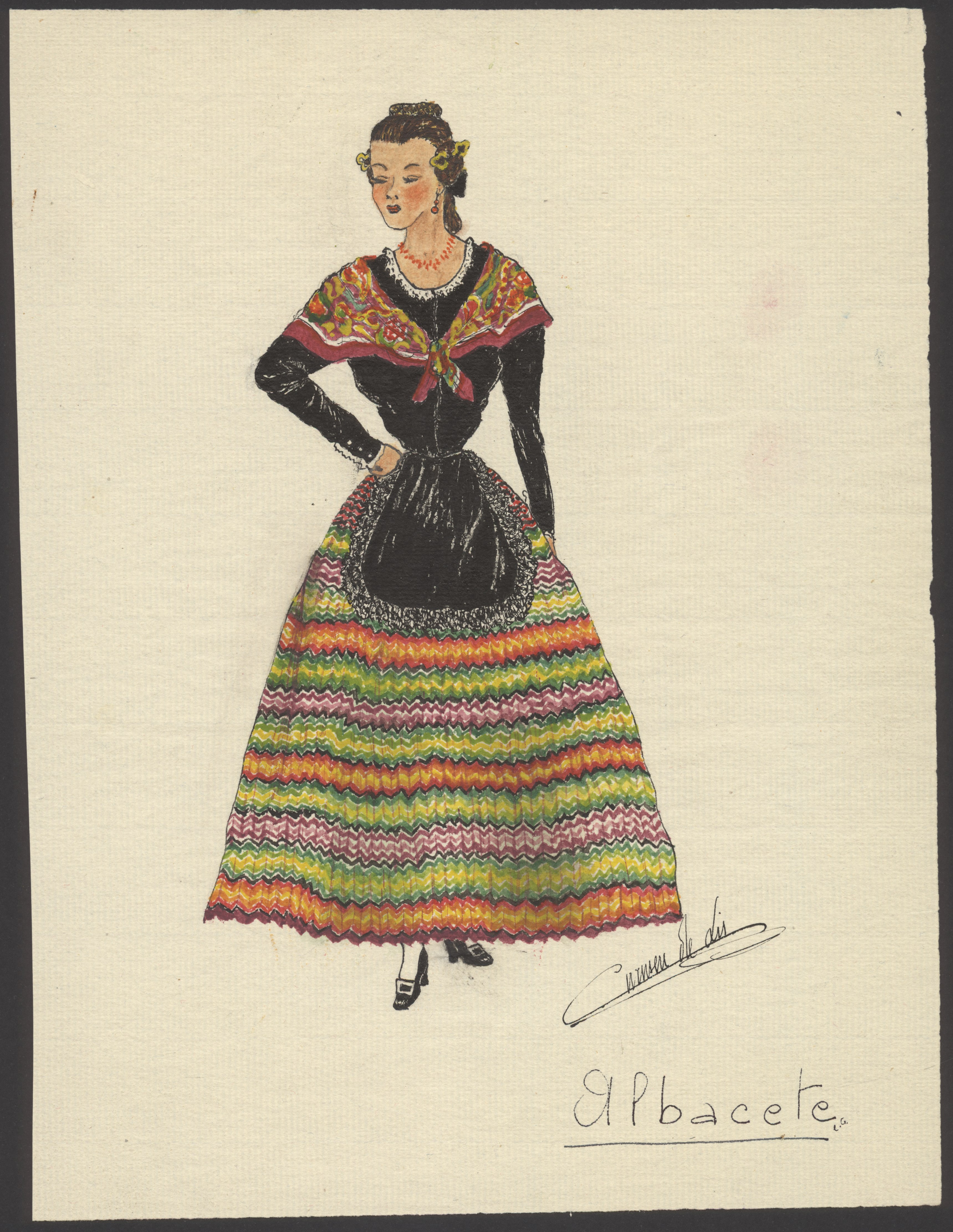 Informe sobre el traje típico de esta provincia que hace la Regidora Provincial de Cultura de la Delegación Provincial de la Sección Femenina de Falange Española Tradicionalista y de las JONS de Albacete.