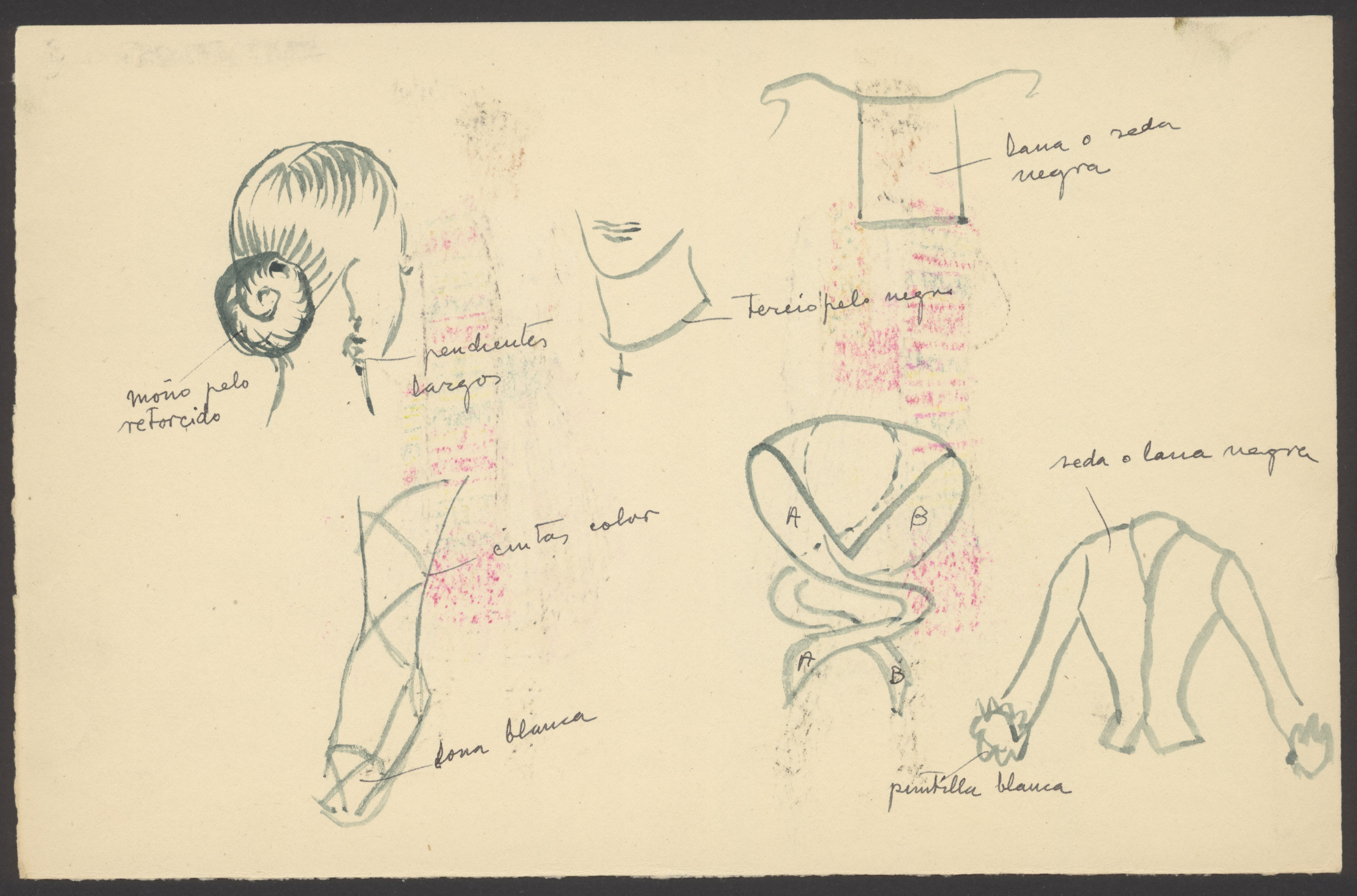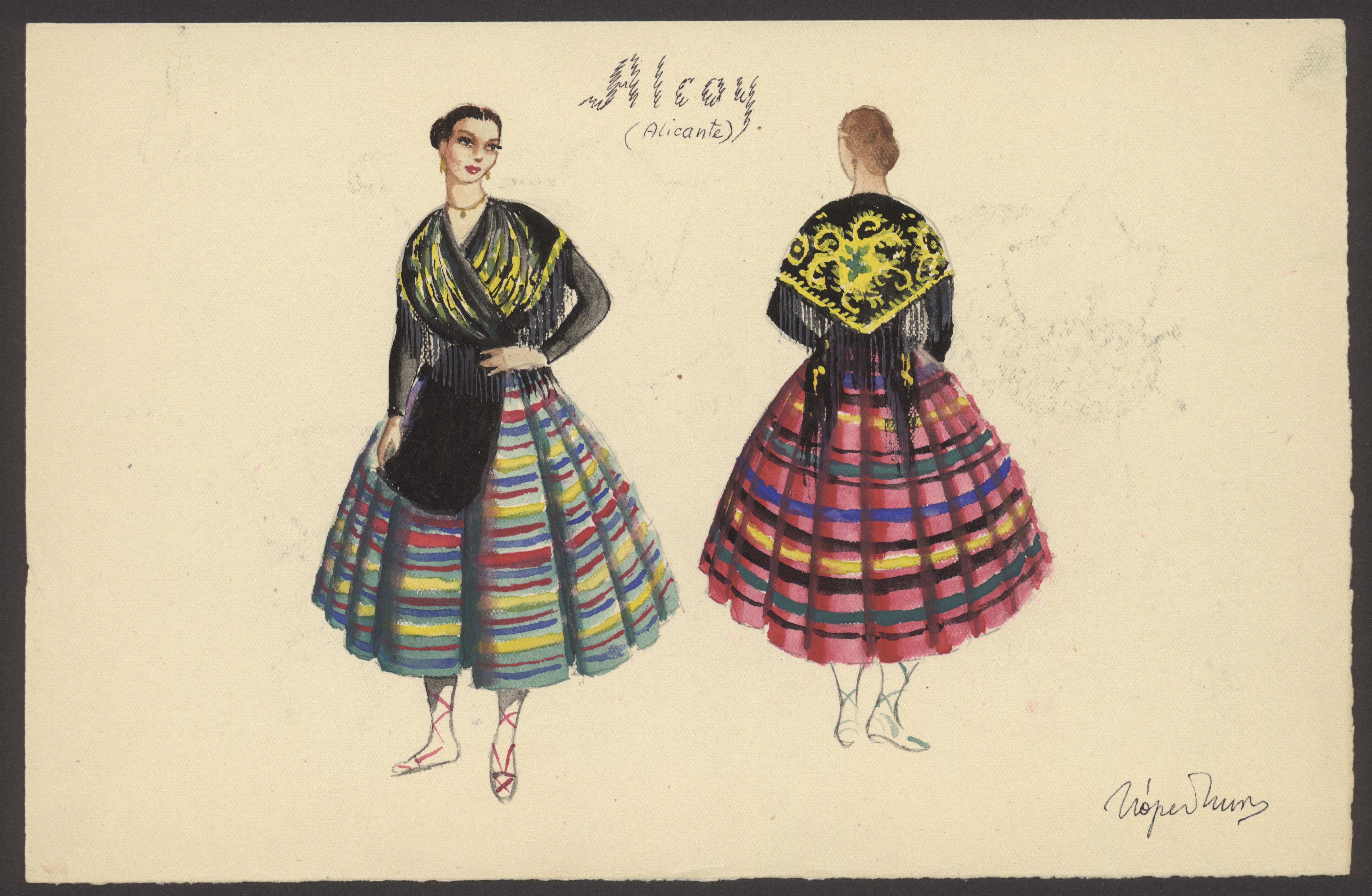 Informe realizado en papel tamaño folio, escrito por las dos caras de la hoja, firmado por la Delegada Local, Margarita Pérez, y con sello de Falange Española Tradicionalista y de las JONS de Alcoy. En el dibujo, sobre cartulina tamaño folio quedan expuestas las vistas delantera y trasera del vestido femenino, así como detalles del peinado y adornos.