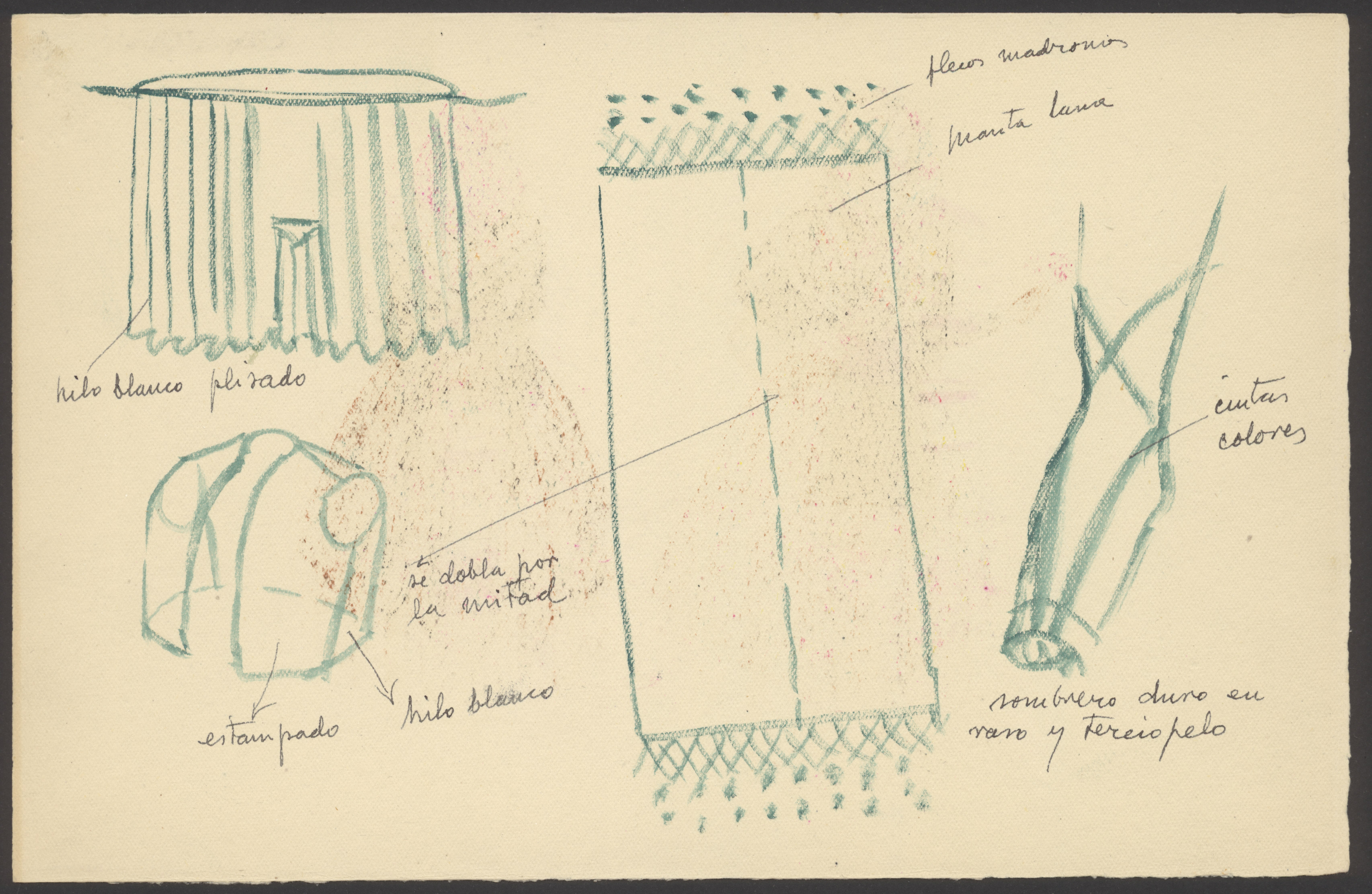 En los dibujos, realizados sobre cartulina tamaño folio, quedan expuestas las vistas delantera y trasera de ambos trajes, así como detalles de los mismos, del peinado de mujer y de los adornos.