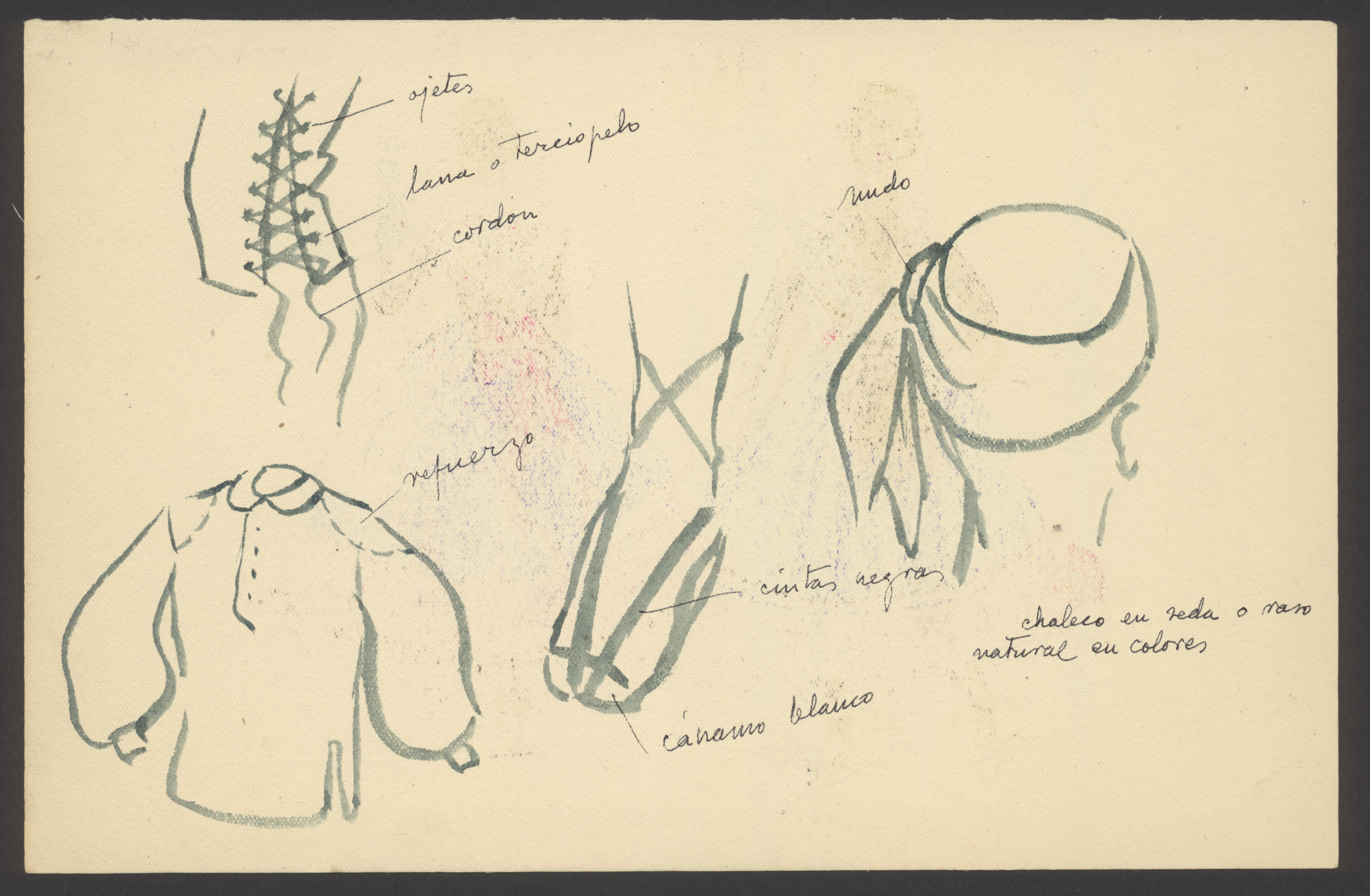 En los dibujos, realizados sobre cartulina, quedan expuestas las vistas delantera y trasera de ambos trajes, así como detalles de los mismos, del peinado de mujer y de los adornos.