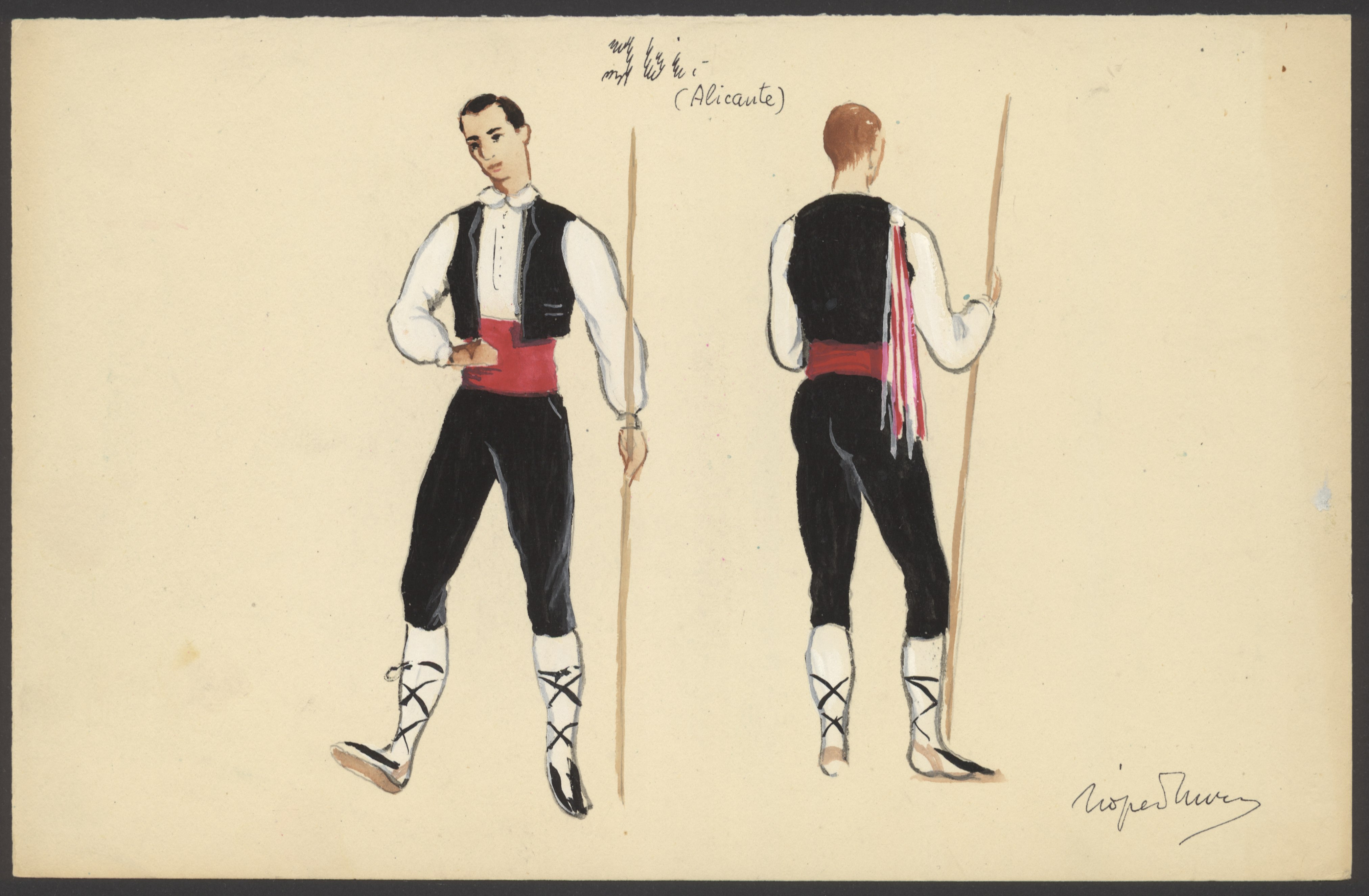 Dibujos a color de los trajes típicos de mujer y de hombre de Ibi.
