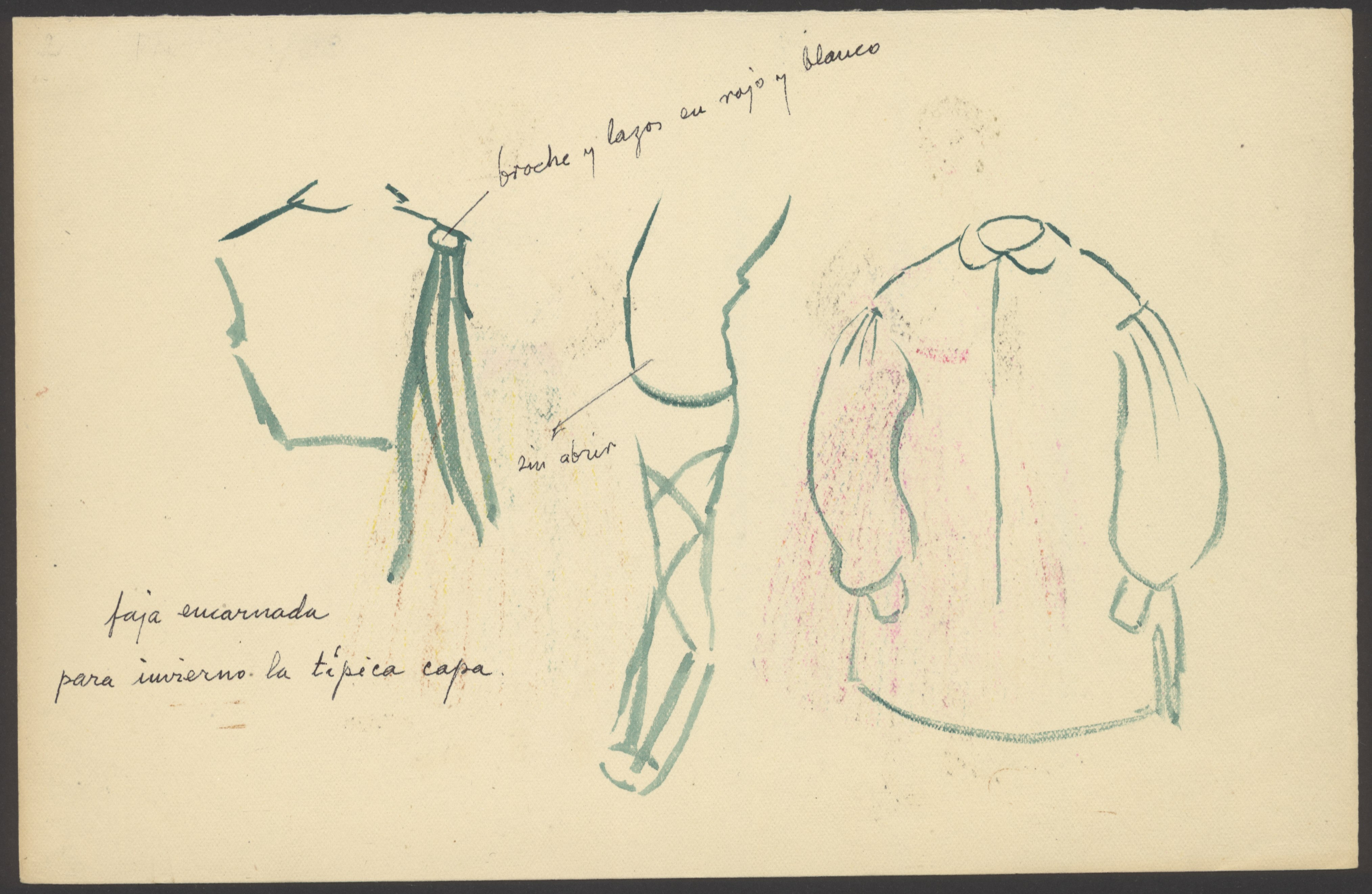 En los dibujos, realizados sobre cartulina, quedan expuestas las vistas delantera y trasera de ambos trajes, así como detalles de los mismos, del peinado de mujer y de los adornos.