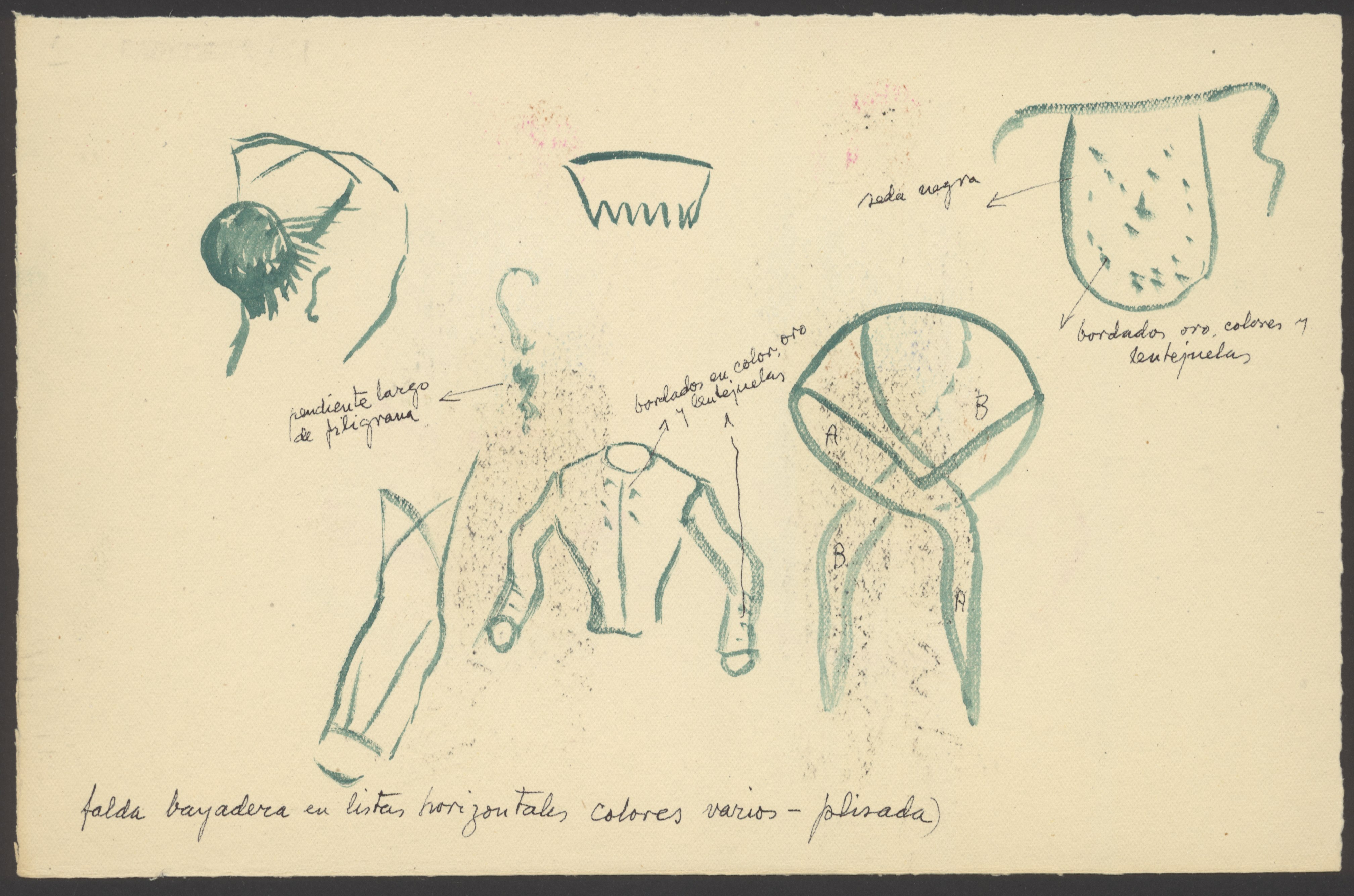 En los dibujos, realizados sobre cartulina, quedan expuestas las vistas delantera y trasera de ambos trajes, así como detalles de los mismos, del peinado de mujer y de los adornos.