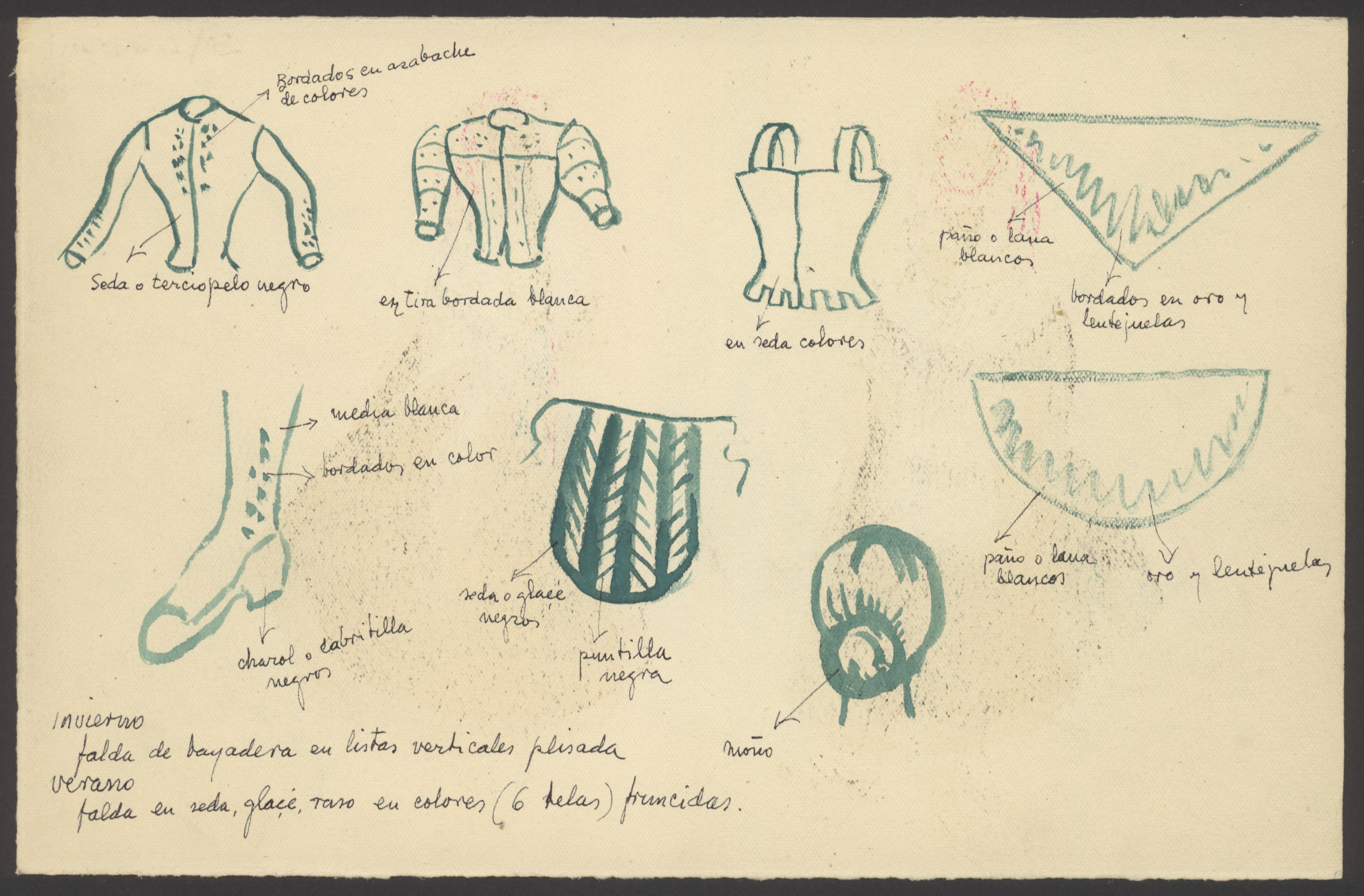 En el dibujo, sobre cartulina, quedan expuestas las vistas delantera y trasera de los vestidos de invierno y de verano, así como detalles del peinado y adornos de ambos.