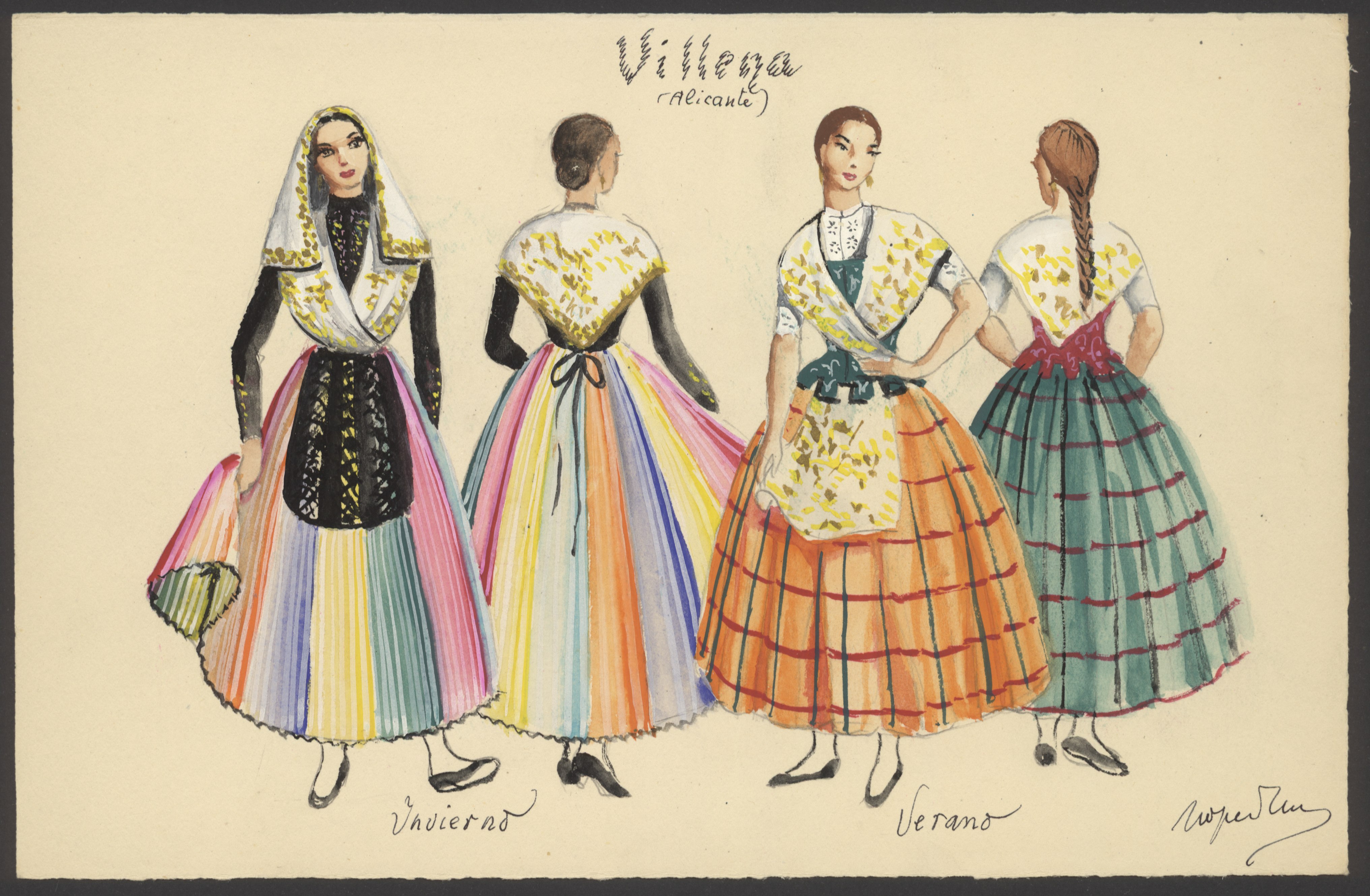 Dibujo a color de los trajes típicos de mujer de invierno y de verano de Villena.