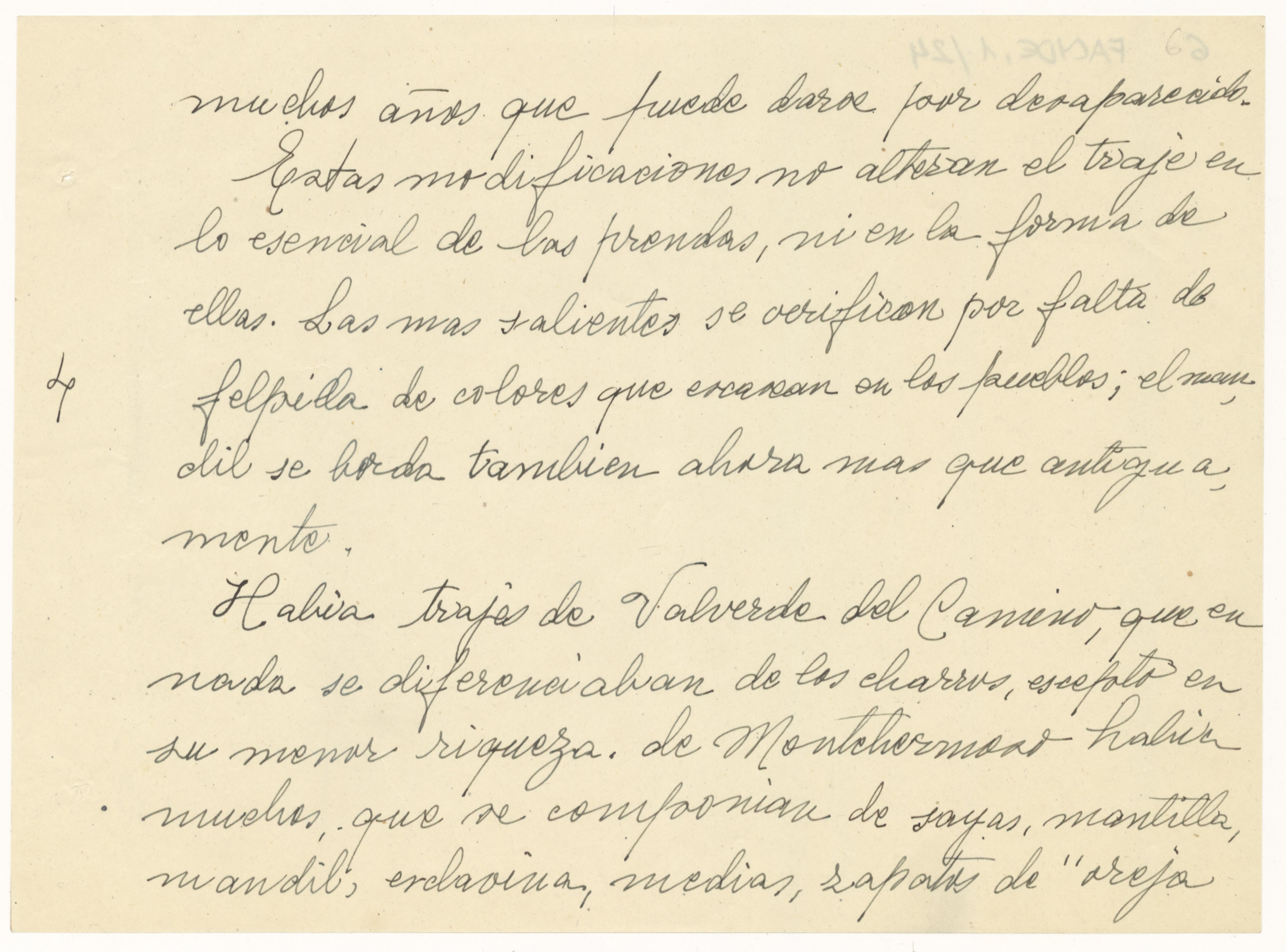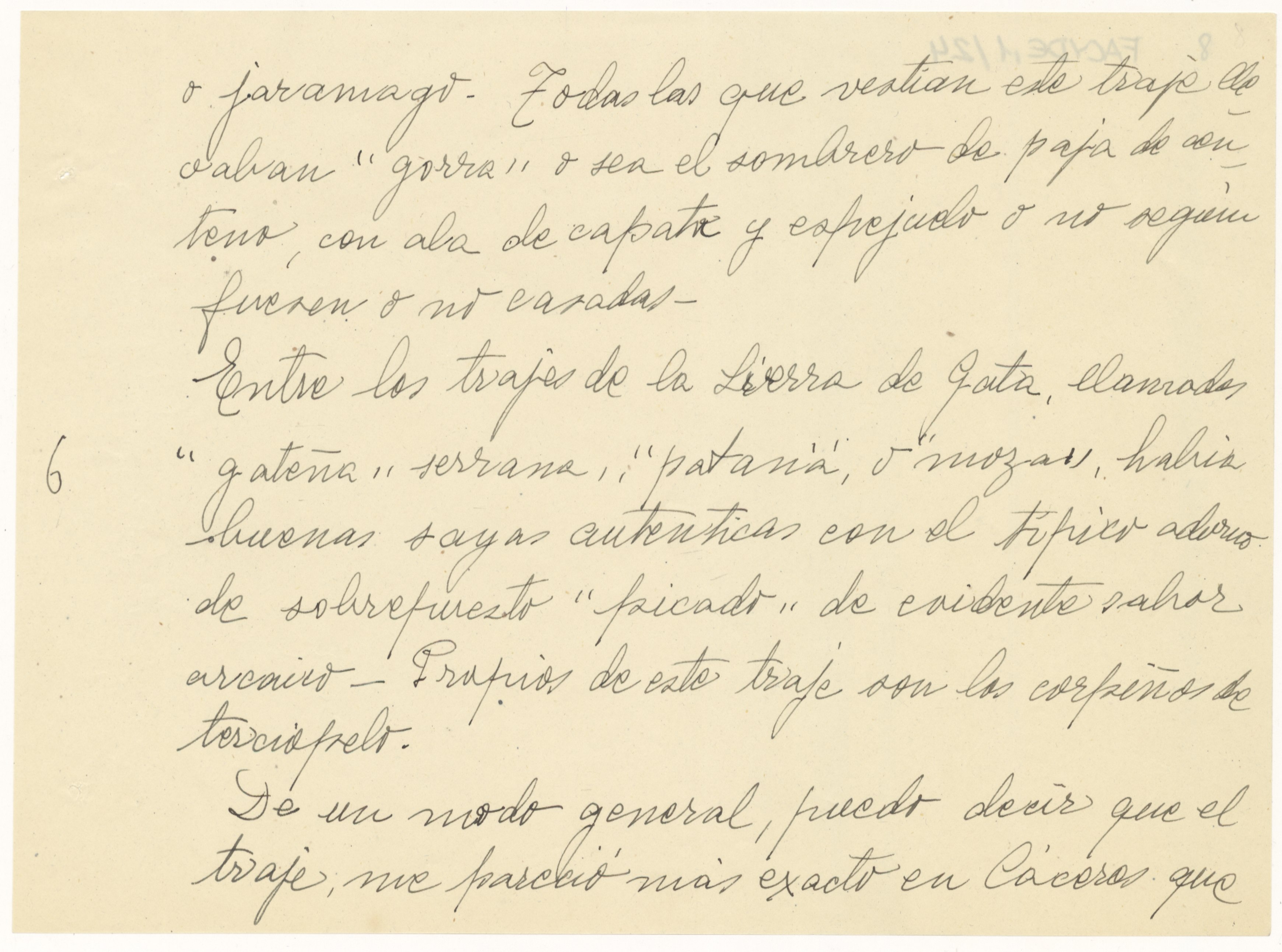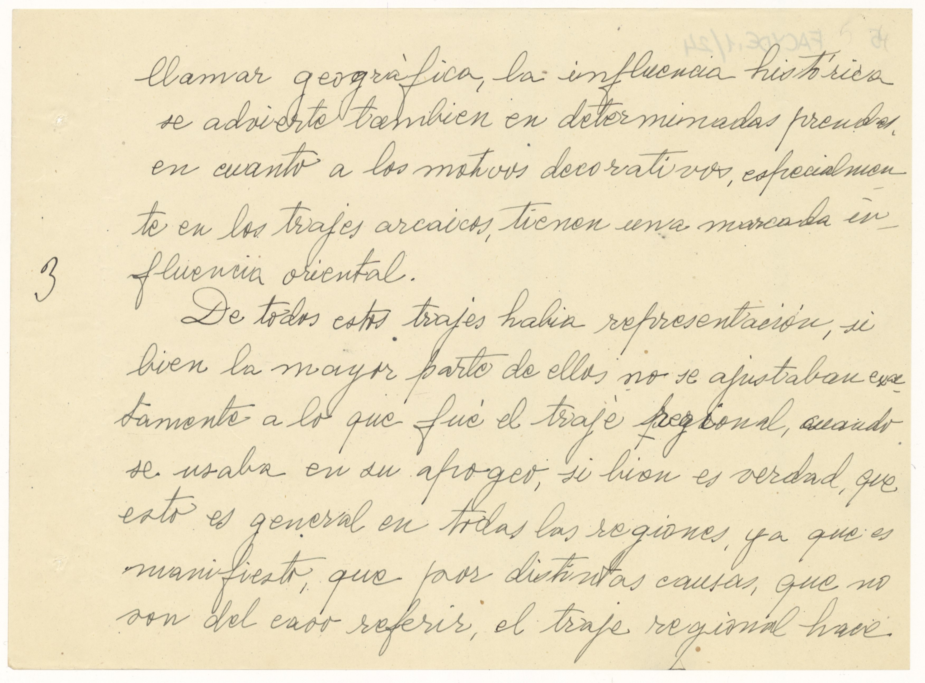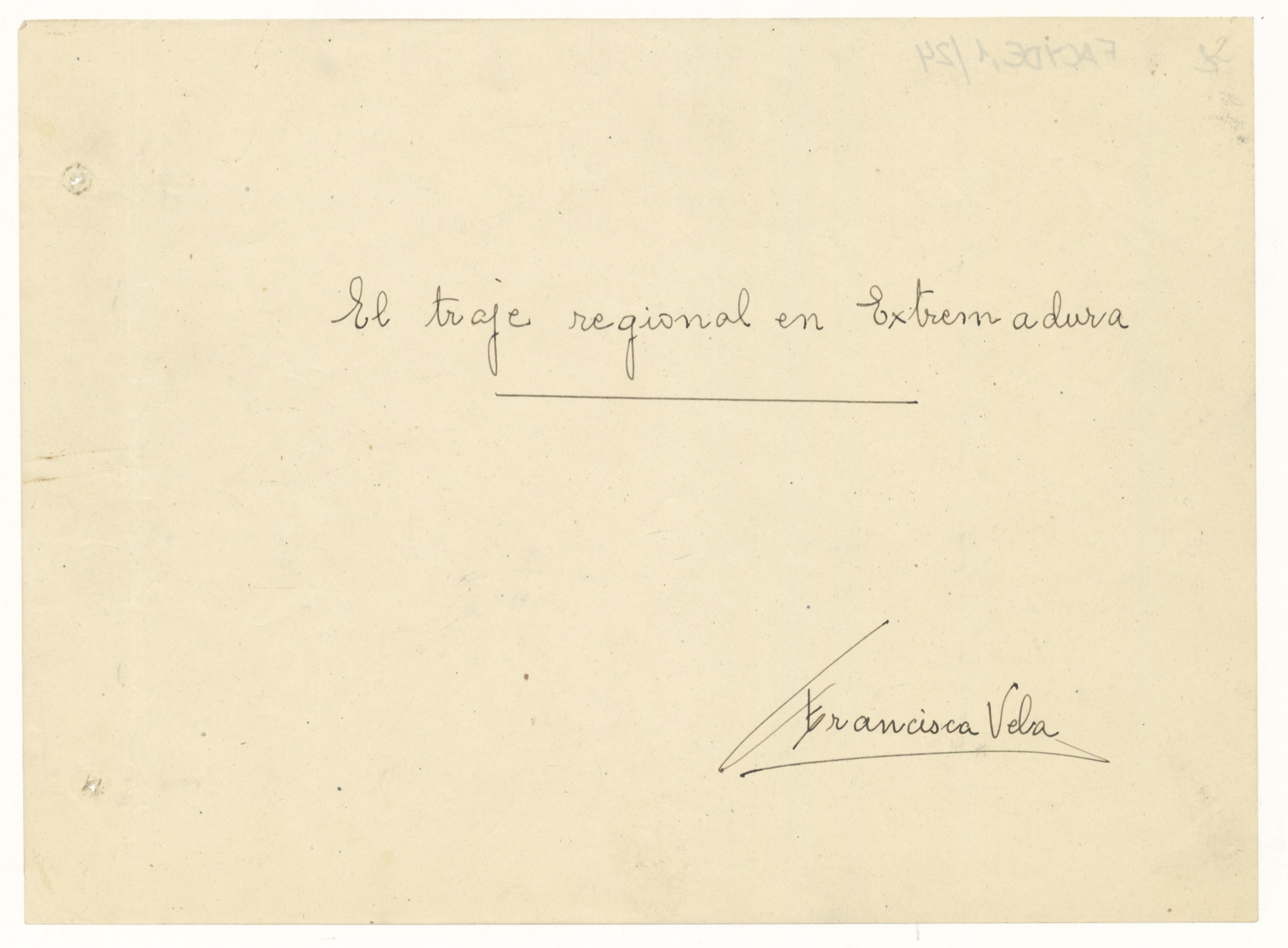 Papel tamaño cuartilla. Informe adjunto manuscrito en papel tamaño cuartilla, firmado y rubricado por Francisca Vela y titulado "El traje regional en Extremadura". Incluye dibujos en blanco y negro de esquemas del bordado y dos mapas de las zonas geográficas donde se utiliza el traje.