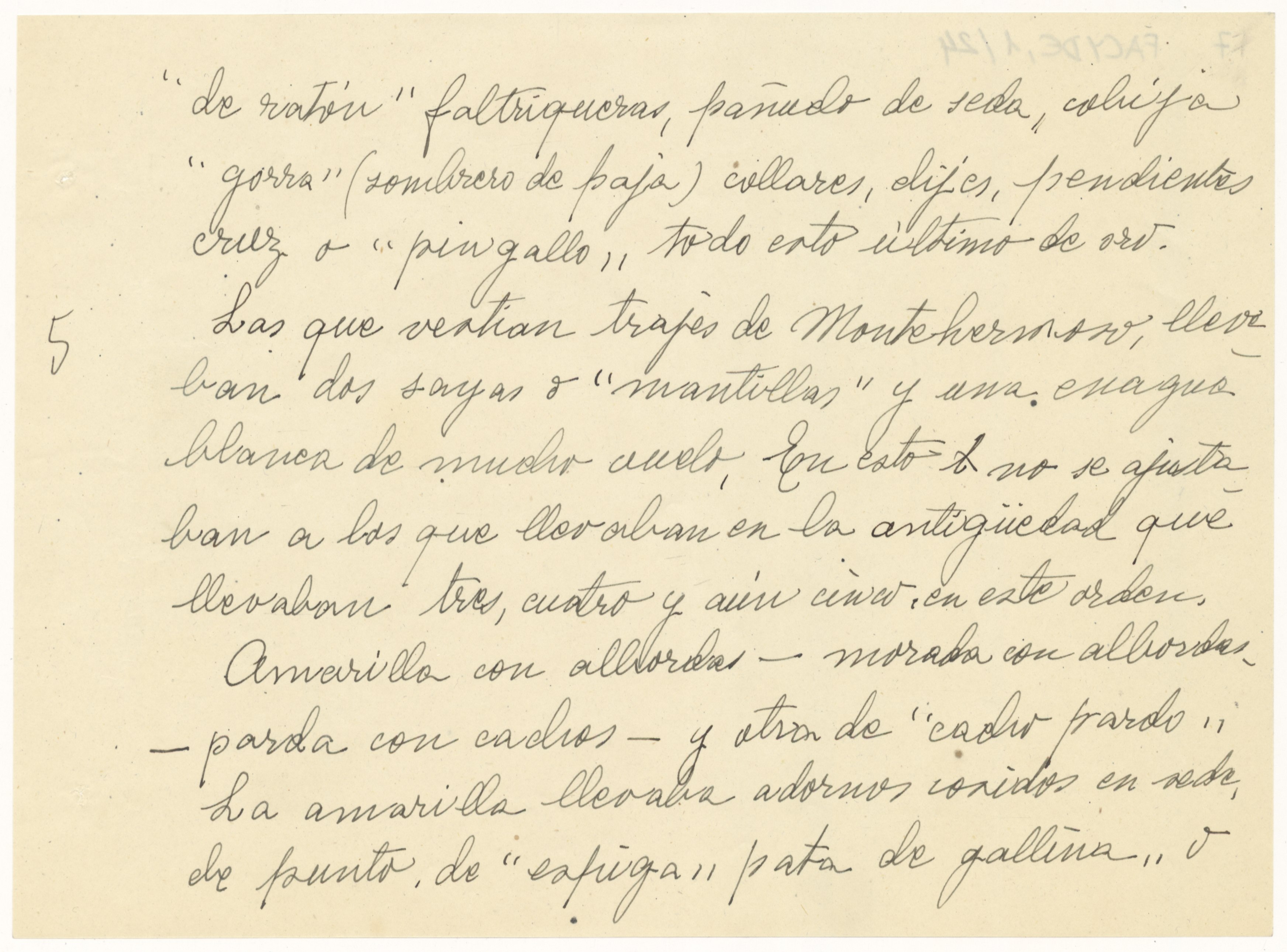 Carta de Mercedes Otero, auxiliar central de Cultura de la Sección Femenina, a la Regidora Provincial de Cultura de Badajoz adjuntando informe sobre el traje típico regional de esa provincia.