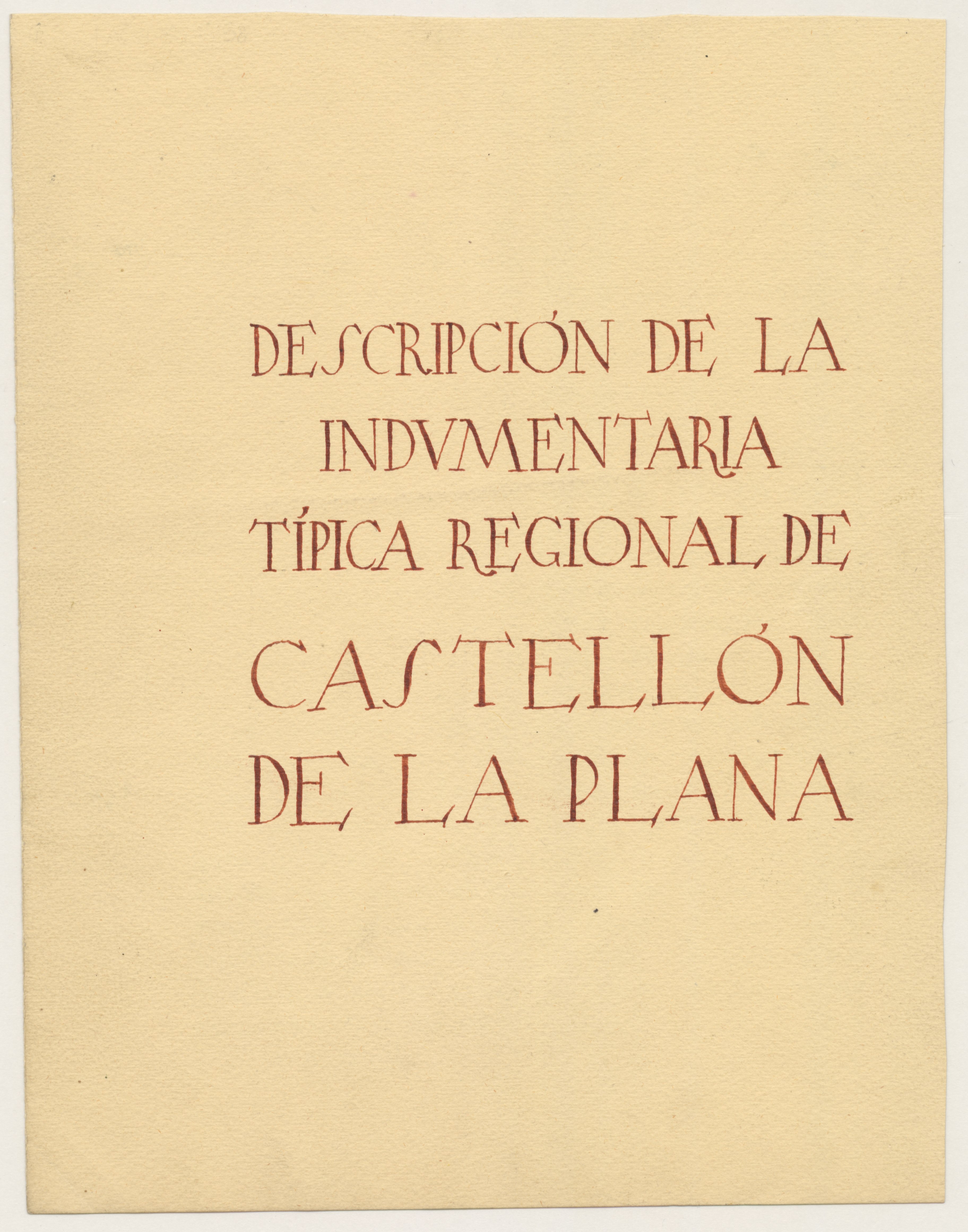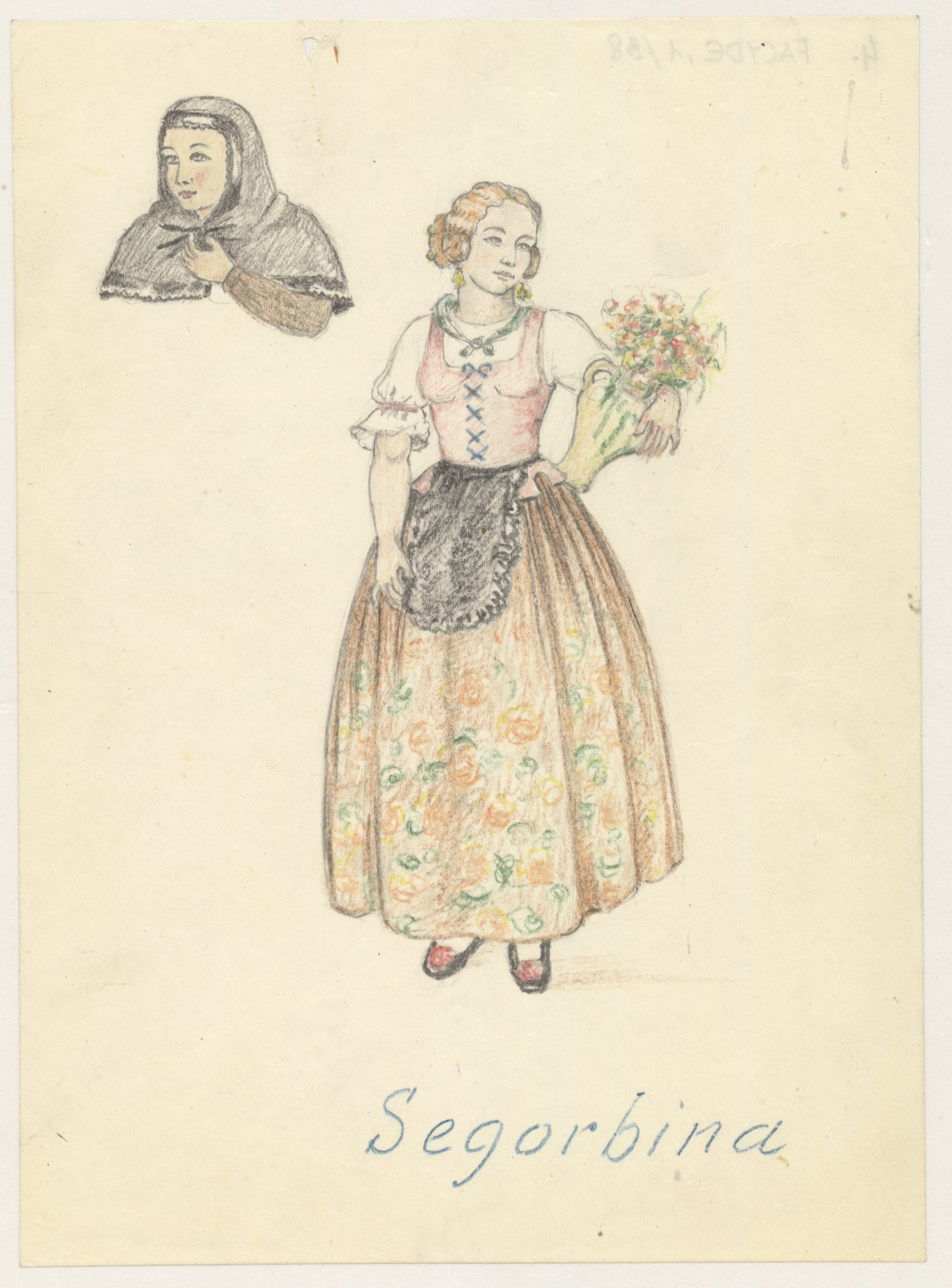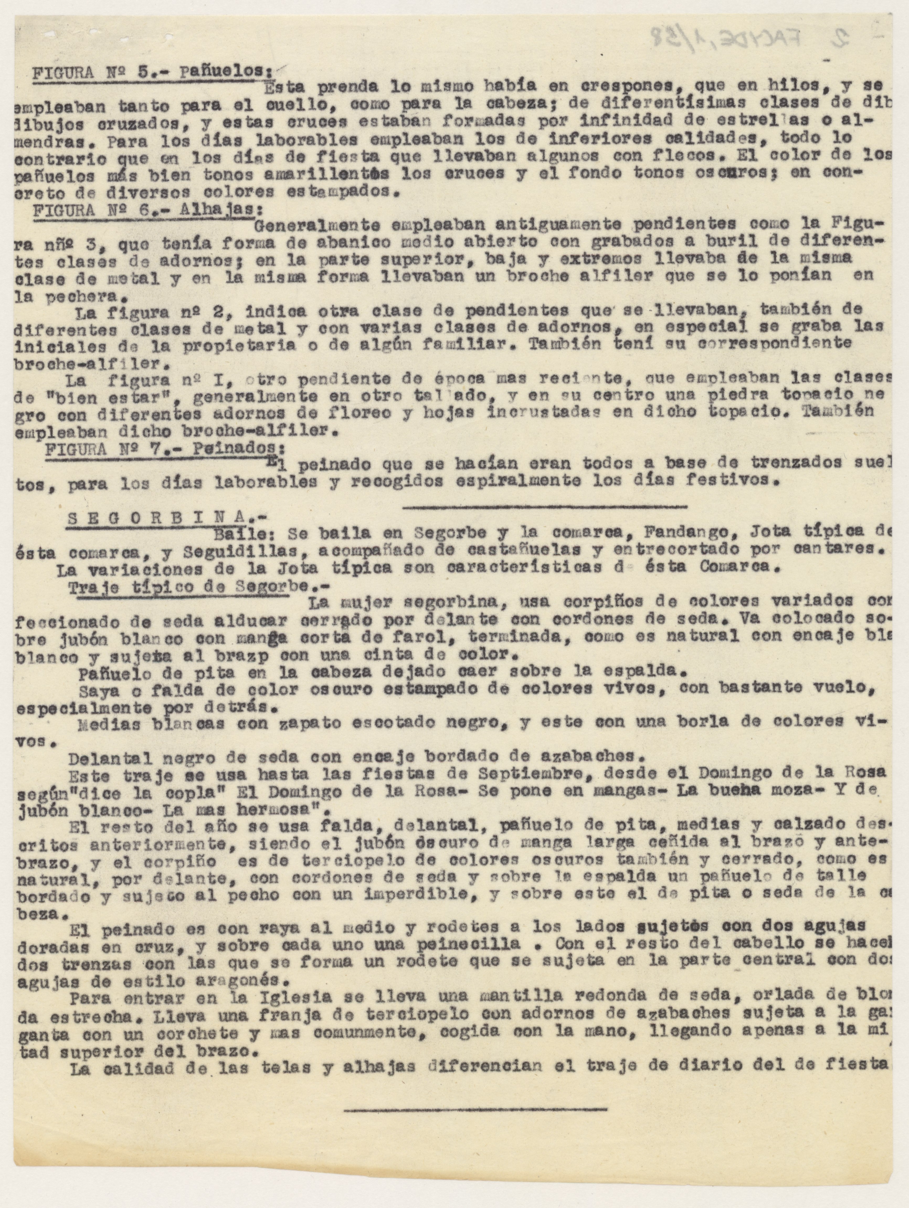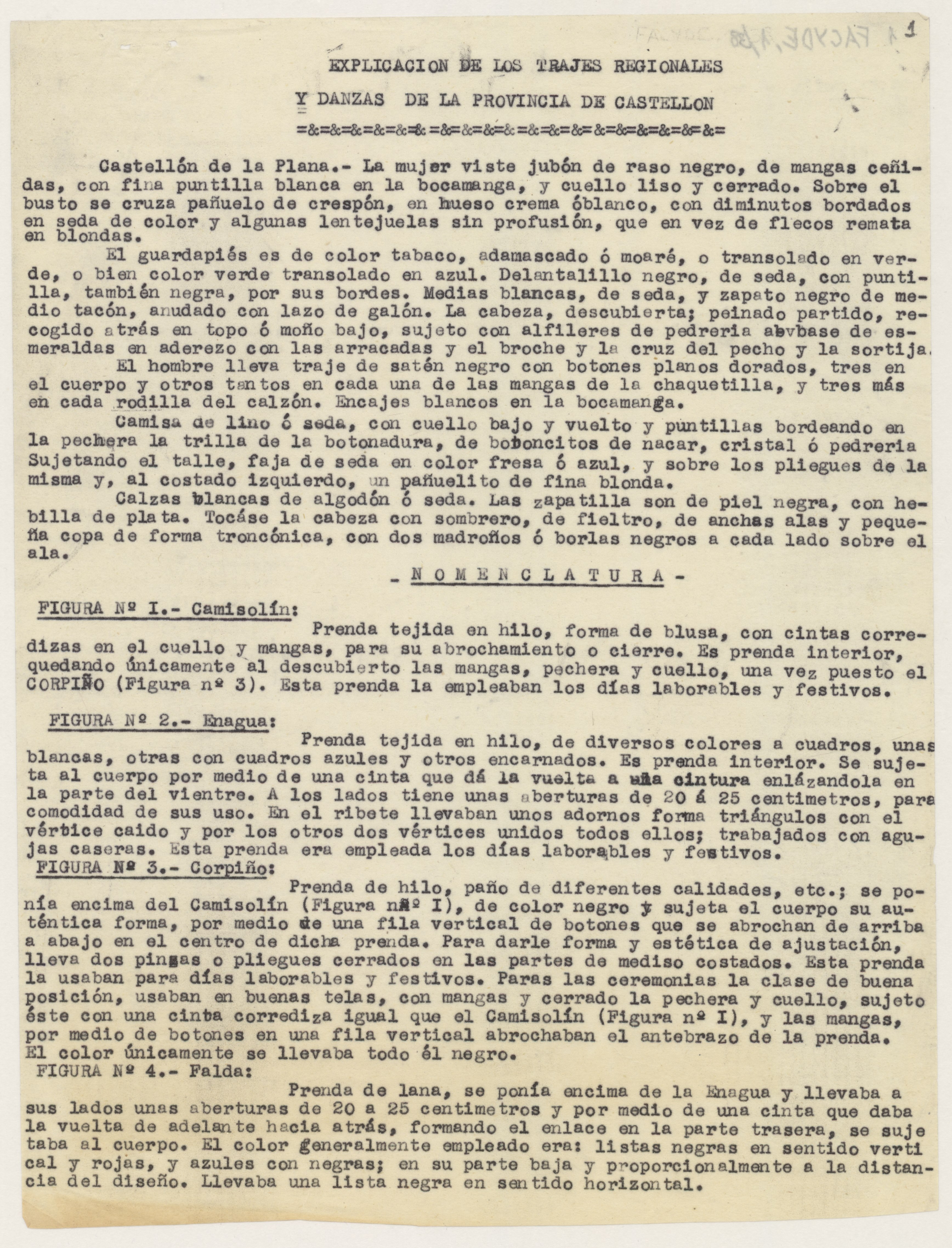 Informe en papel tamaño folio, que incluye la descripción de los trajes regionales femenino y masculino, así como de adornos y peinados, en Castellón de la Plana. Las descripciones se basan en figuras no incluidas. Describe también el baile llamado Segorbina y el traje típico de Segorbe. Parte del informe se repite en otra hoja de papel grueso tamaño folio, texto ornamentado, con título y letra manuscrita en varios colores. El dibujo está realizado en color, sobre papel tamaño cuartilla y representa el traje femenino utilizado en Segorbe, con y sin pañuelo en la cabeza.