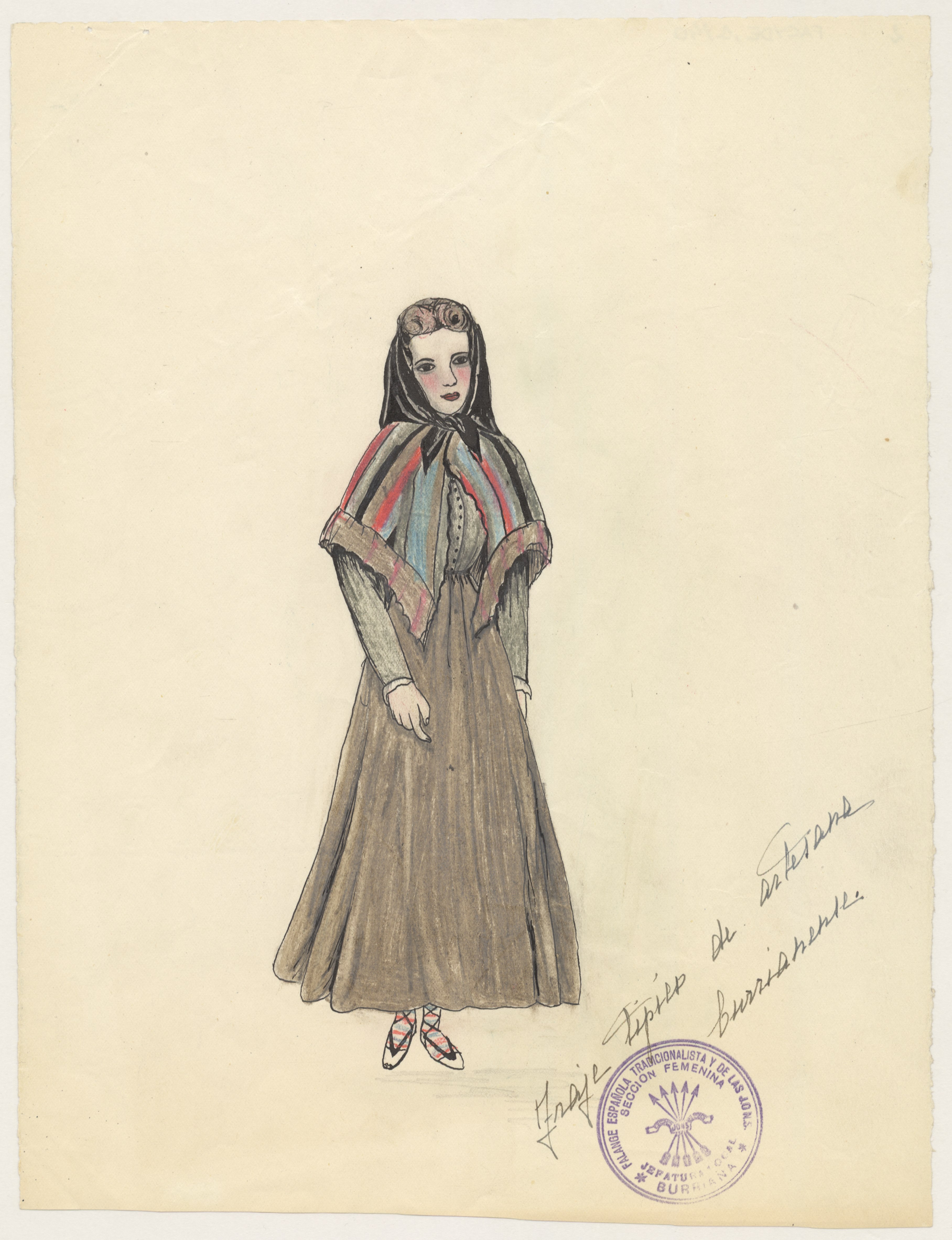 Informe en papel tamaño cuartilla con las descripciones de cada parte del vestido. Dibujo a color realizado en papel grueso tamaño folio con anotaciones manuscritas al margen y sello de Falange Española Tradicionalista y de las JONS, Sección Femenina, Jefatura Local de Burriana.