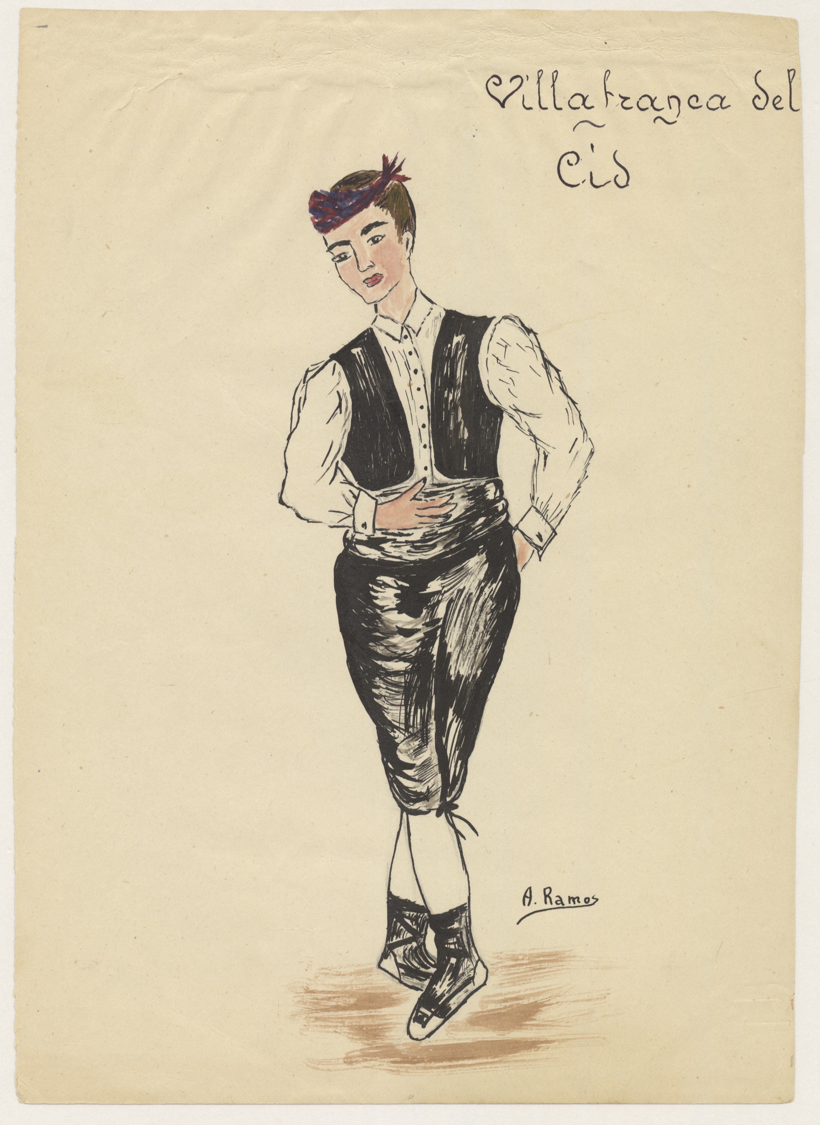 Dibujos a color de los trajes típicos de hombre y mujer de Villafranca del Cid.