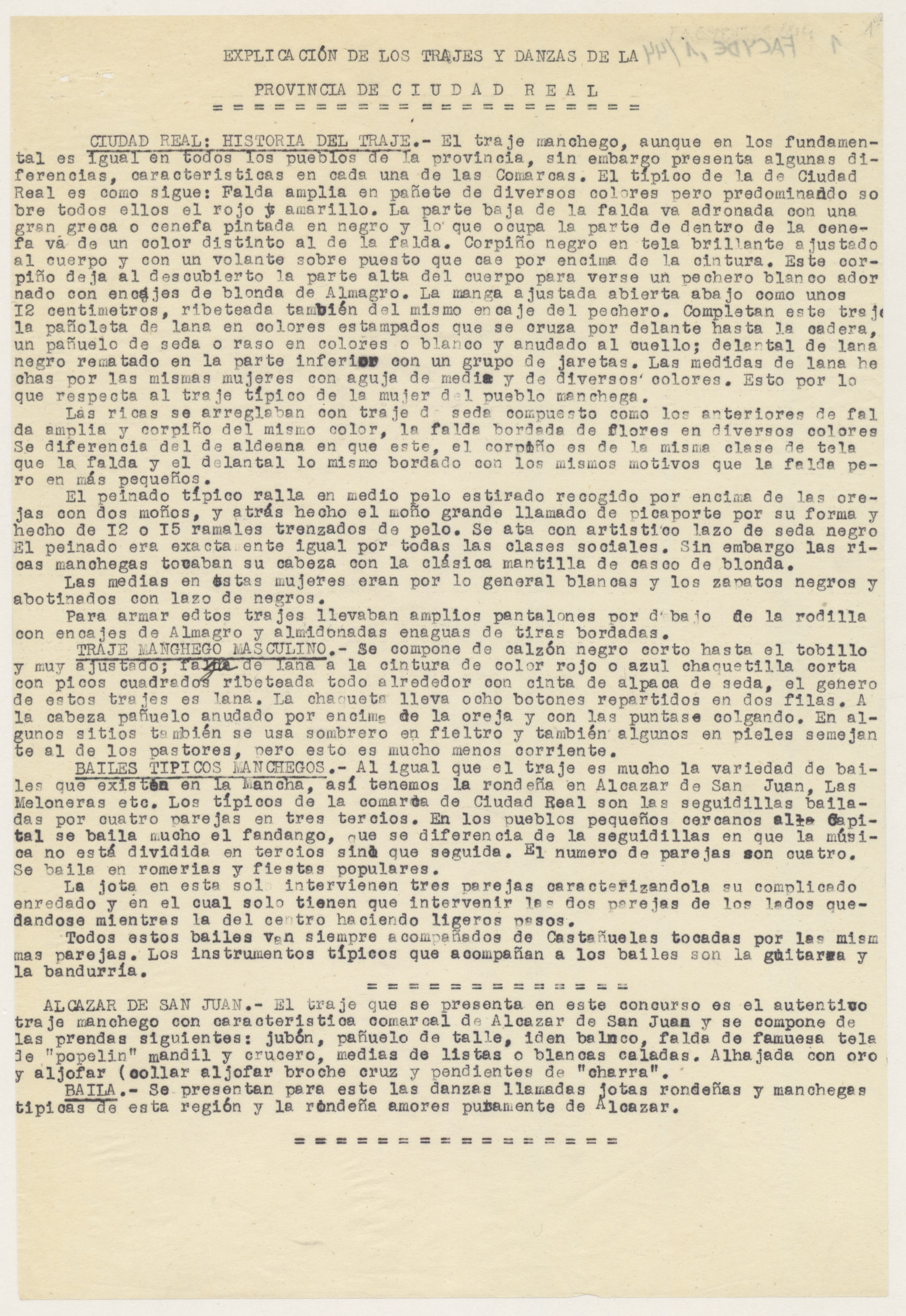 Informe explicativo de los trajes y danzas de la provincia de Ciudad Real.