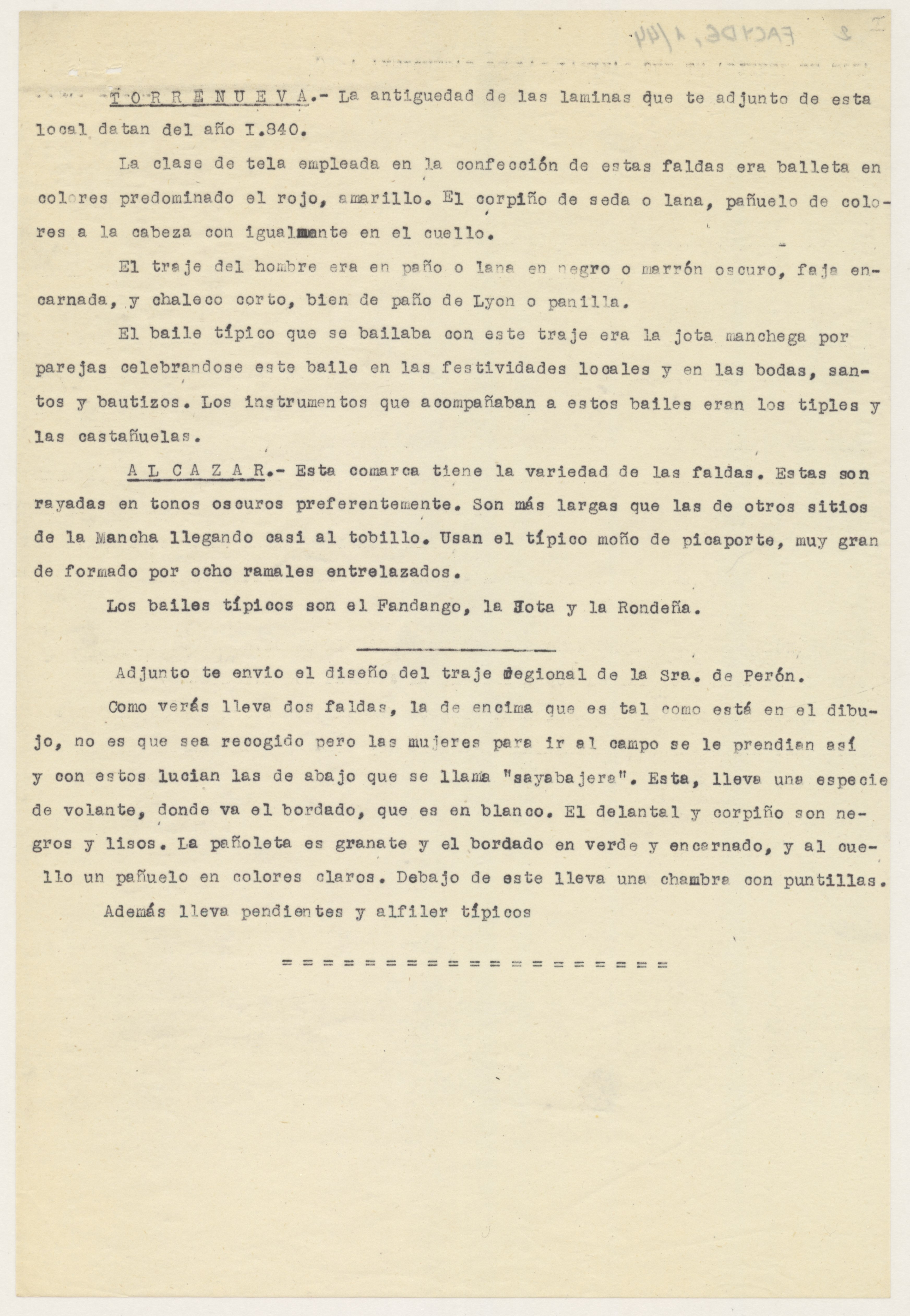 Informe redactado en papel tamaño folio, sin firma, con textos referidos específicamente a Ciudad Real, Torrenueva y Alcázar de San Juan. Dibujos a color realizados sobre papel tamaño folio que presentan vistas de frente de los trajes típicos masculino y femenino de Torrenueva, con figuras paradas de pie, en uno de ellos, y bailando en el otro. Ambos dibujos llevan el sello de Falange Española Tradicionalista y de las JONS, Sección Femenina de Torrenueva.