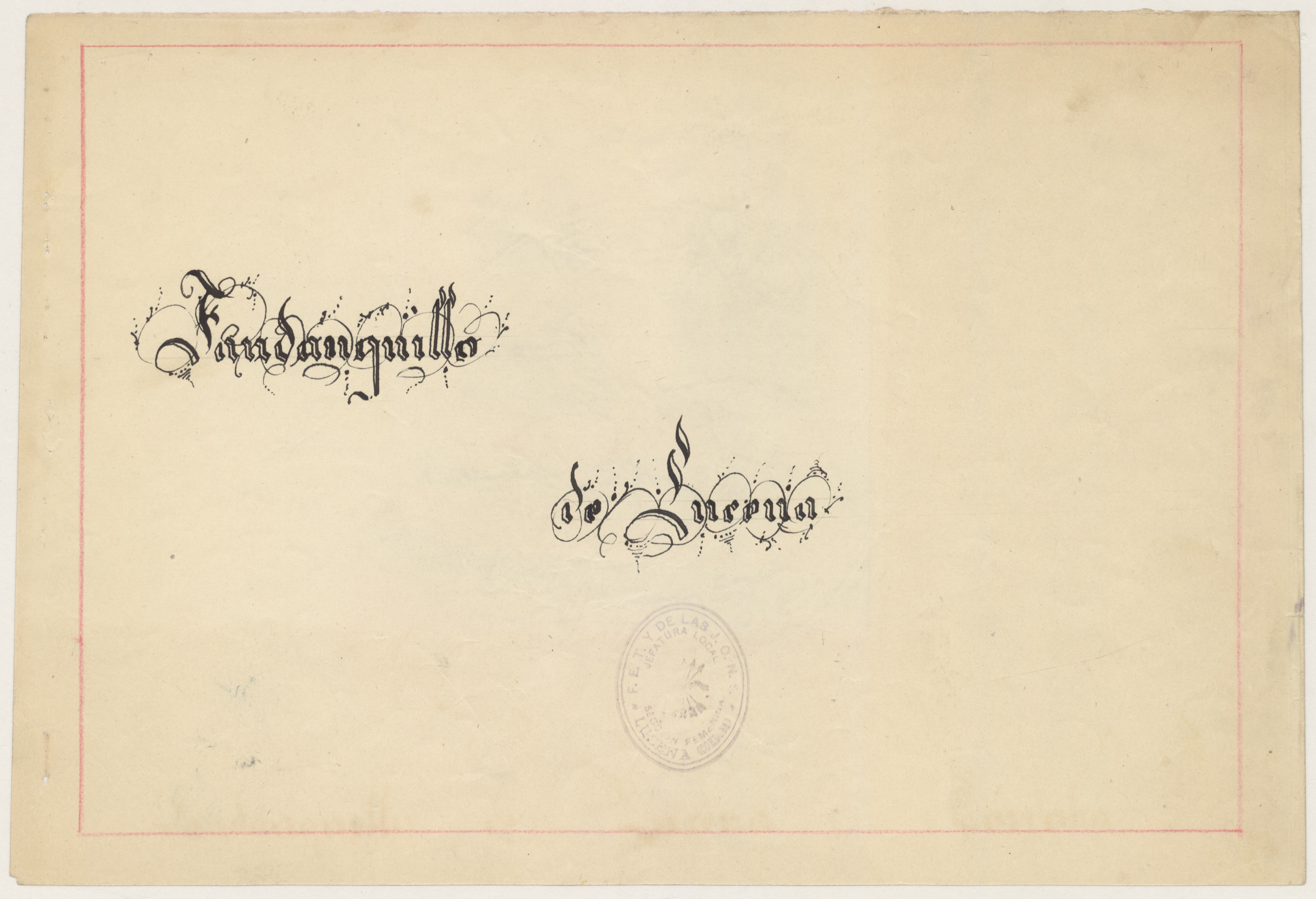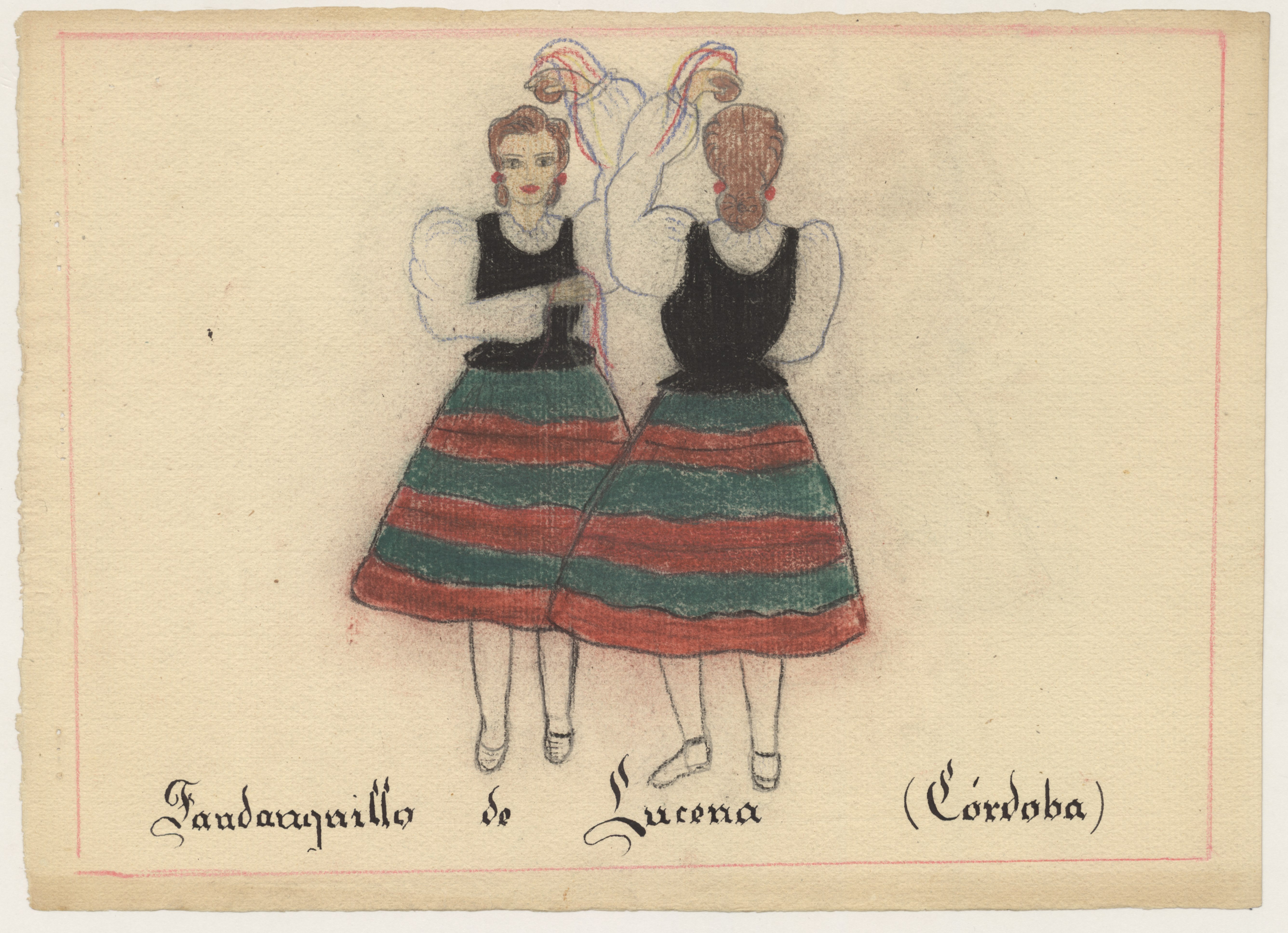 Dibujo a color sobre papel grueso tamaño A3, sin firma, que representa a dos mujeres bailando fandanguillo, según se indica al margen y en la portadilla que lo acompaña y que contiene el sello de Falange Española Tradicionalista y de las JONS, Jefatura Local de la Sección Femenina en Lucena.