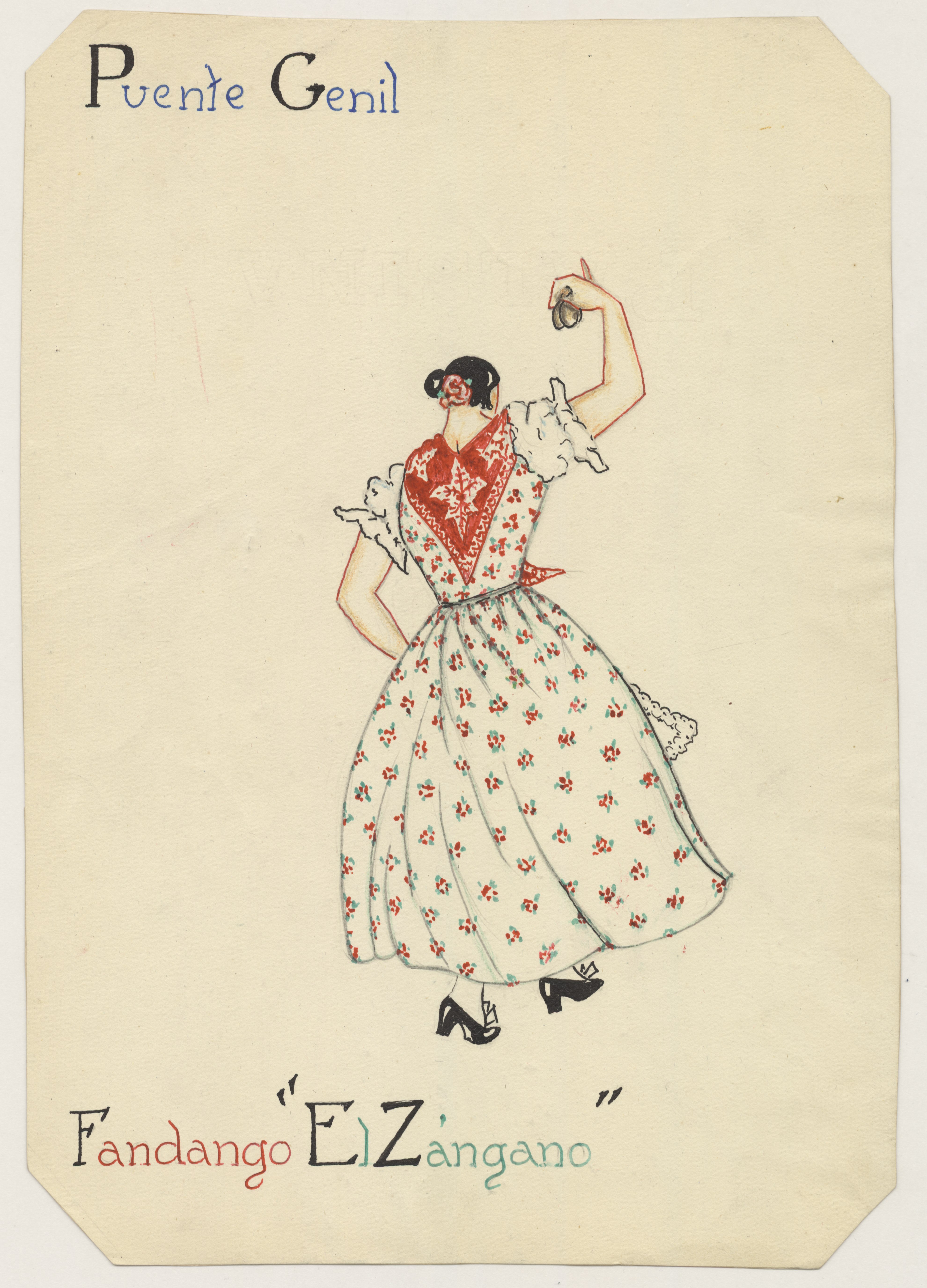 Los dibujos, presentados en una carpetilla con el título de la localidad, están realizados en color sobre cartulina tamaño folio y representan a mujeres bailando: uno de ellos, vista trasera de mujer bailando el fandango "El Zángano", y el otro, vista delantera de mujer bailando sevillanas, según se indica en los títulos de las ilustraciones.