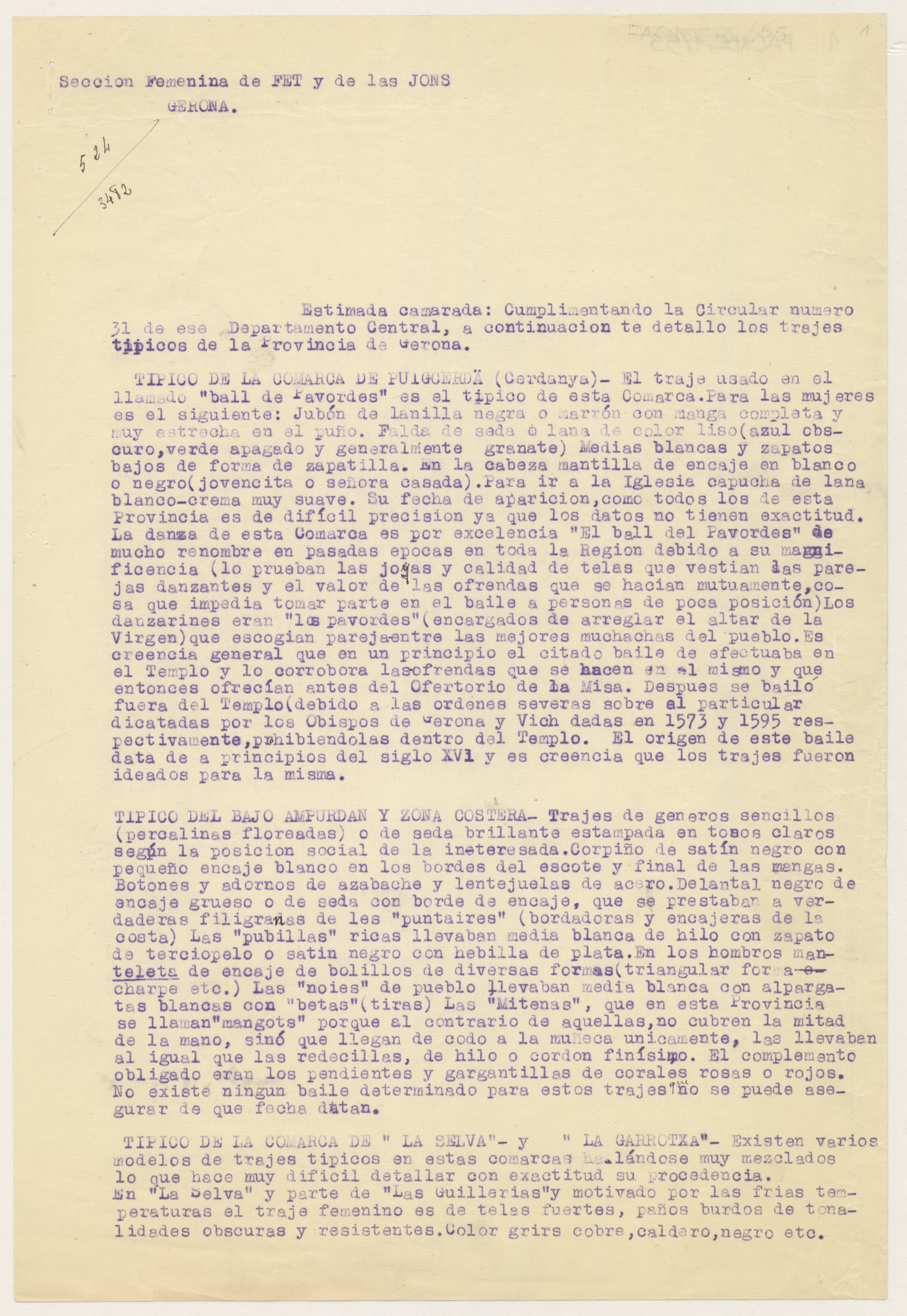Carta de la Regidora Provincial de Cultura y la Delegada Provincial de la Sección Femenina en Gerona a la Regidora Central de Cultura informando sobre los trajes típicos de la provincia de Gerona.
