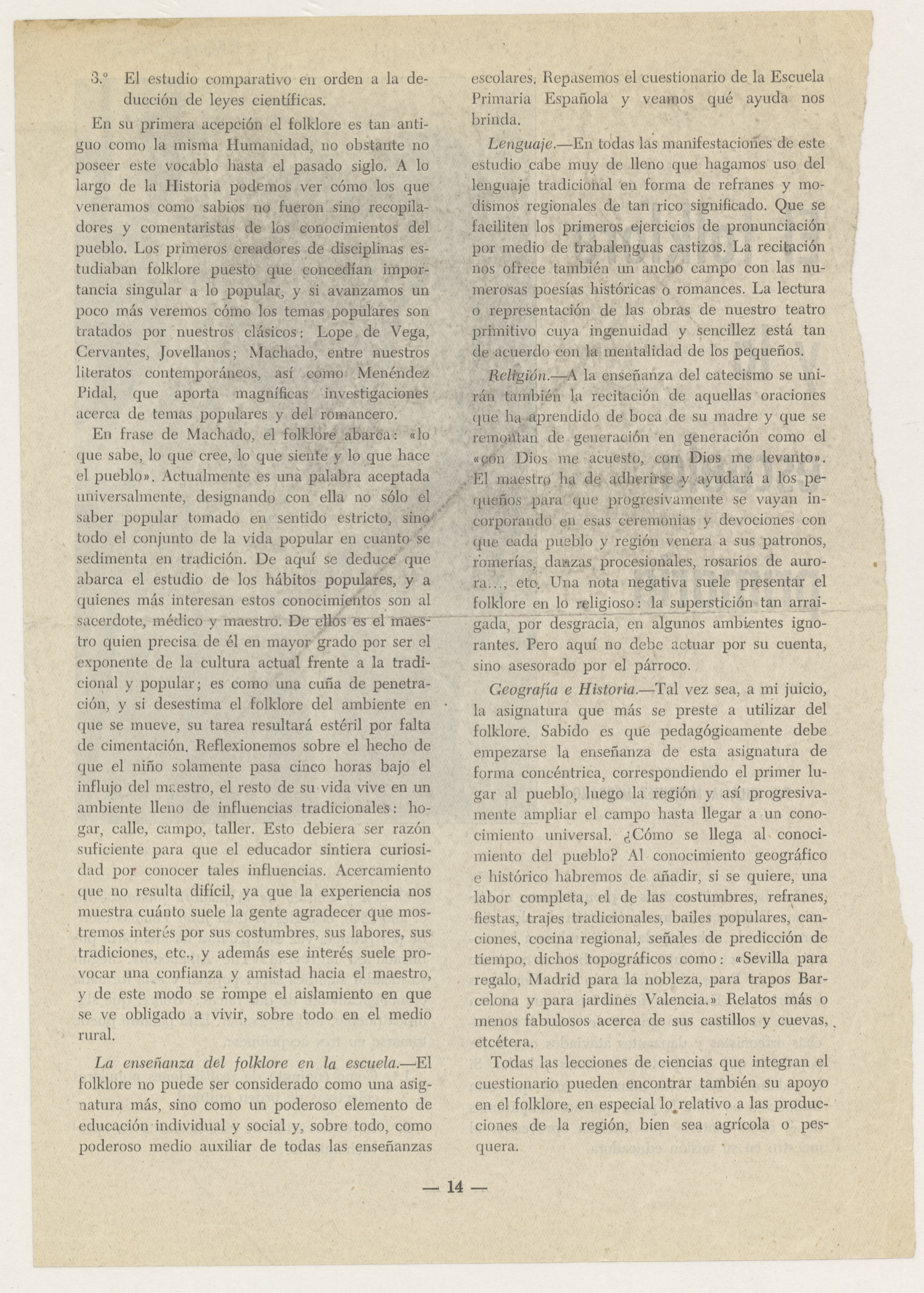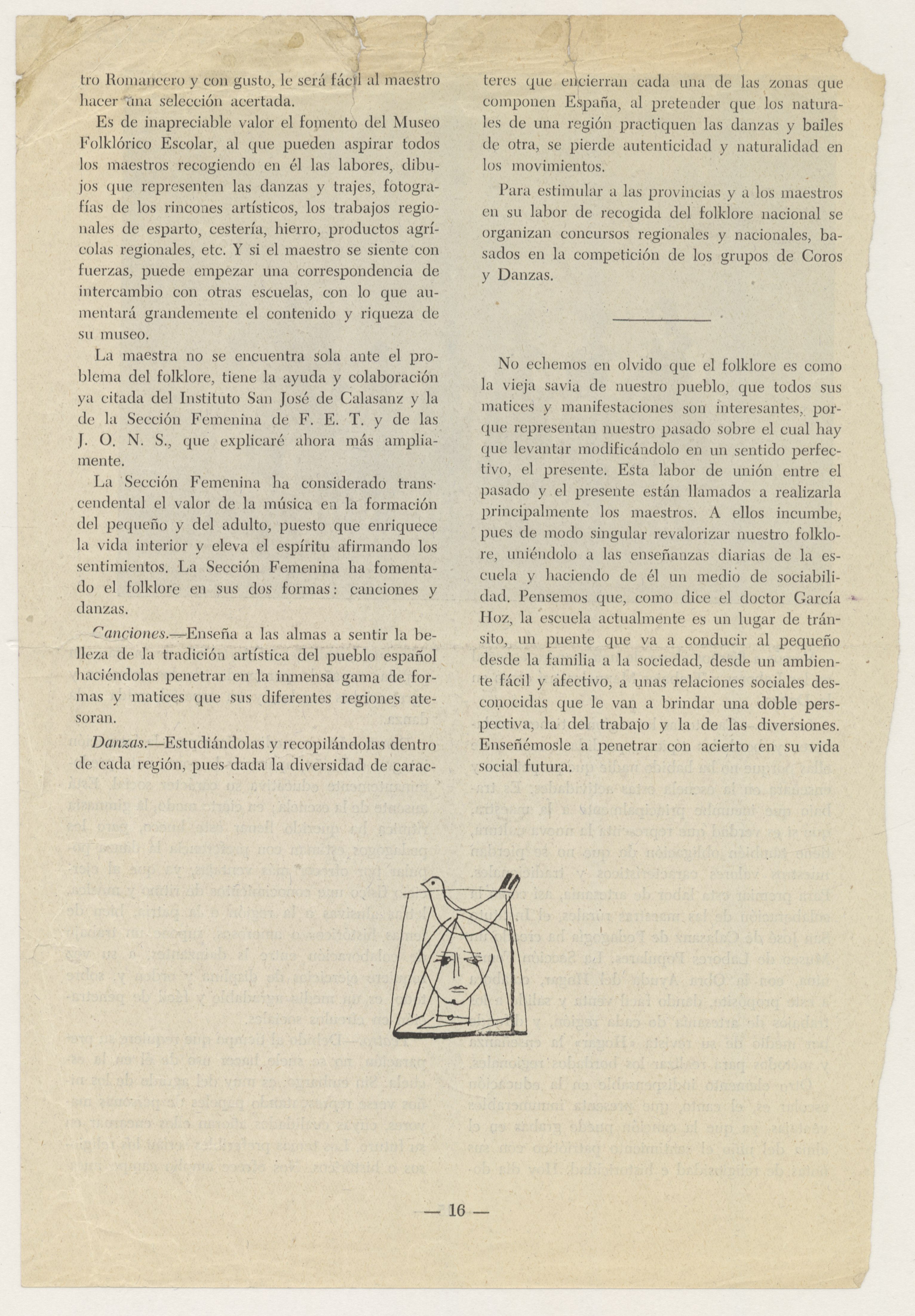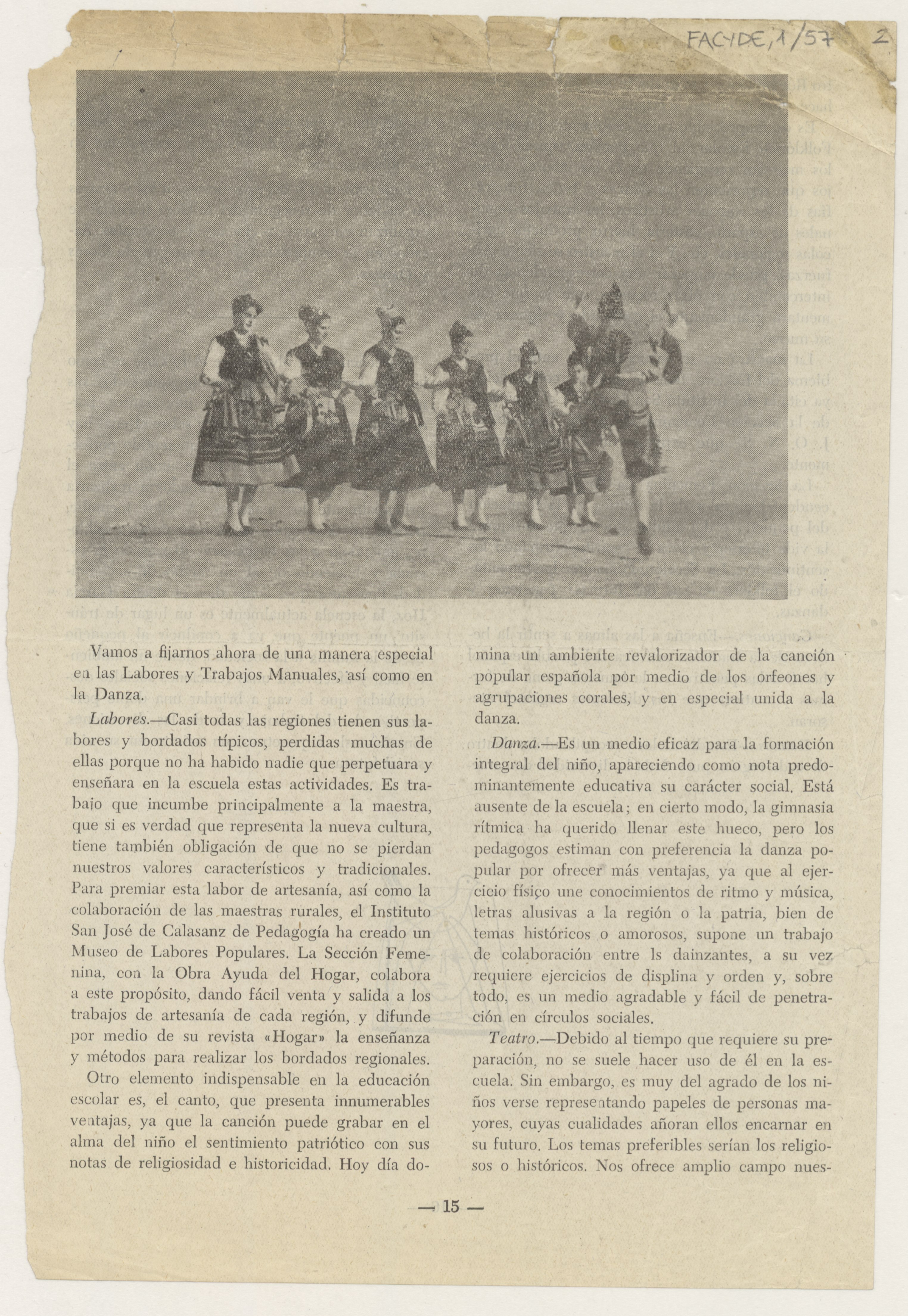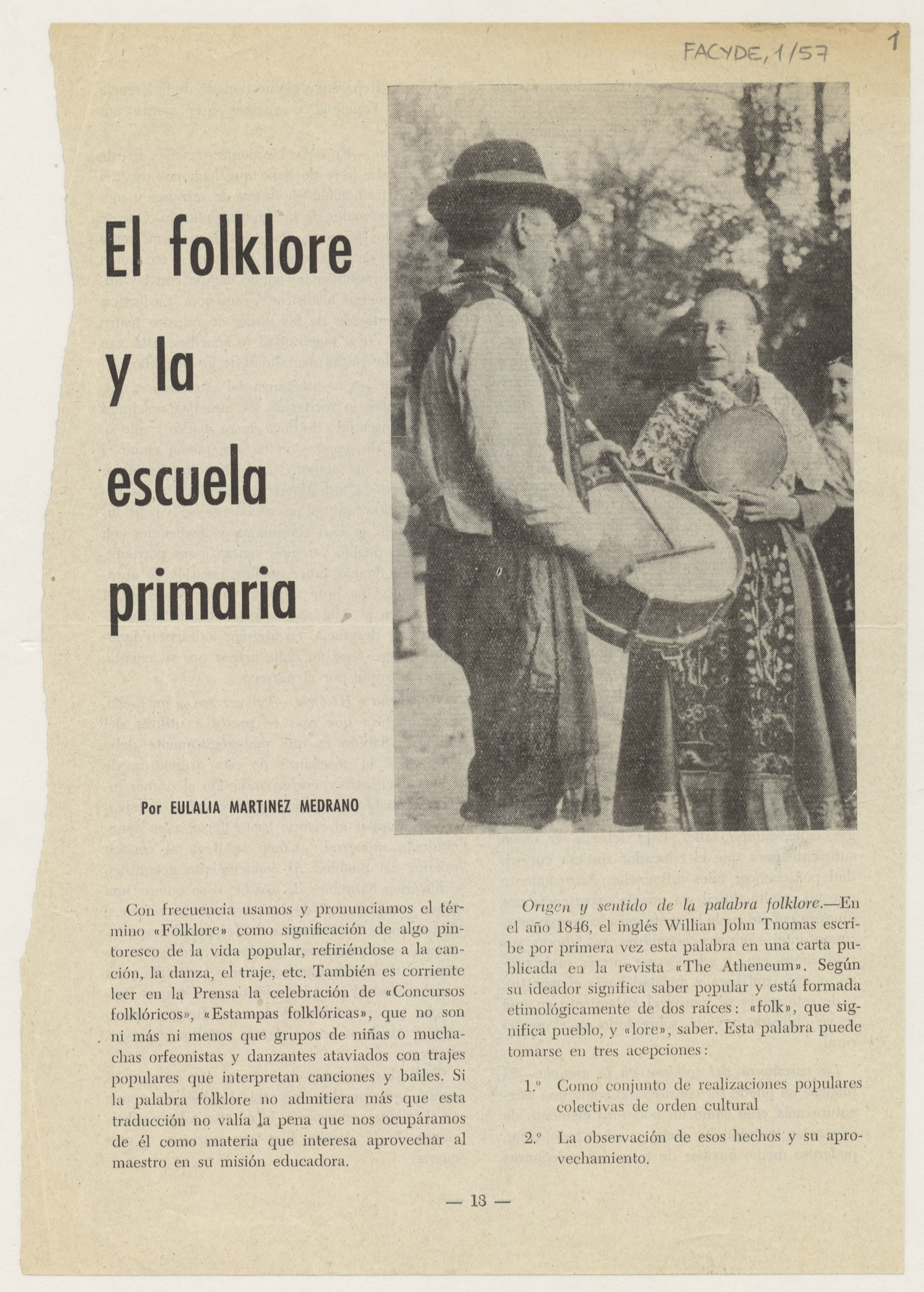 Se trata de cuatro páginas de papel impreso, de la 13 a la 16, con dos fotografías en blanco y negro de músicos y danzantes vestidos con trajes regionales, cortadas de un libro donde Eulalia Martínez Medrano colabora con este artículo titulado: "El folklore y la escuela primaria".