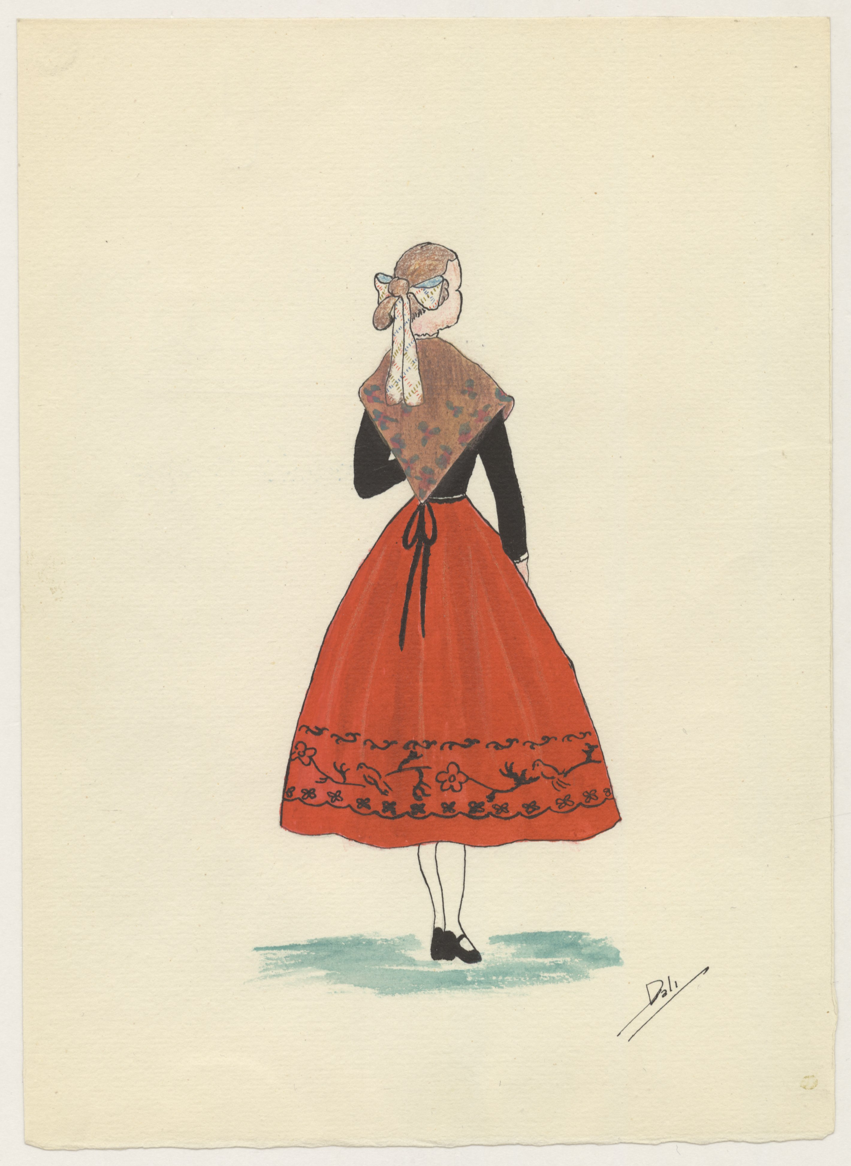 Dibujos a color, firmados y rubricados, realizados sobre papel grueso tamaño cuartilla: dos de ellos, representando las vistas delantera y trasera de un vestido femenino, otros dos, a una bailarina del paloteo y otro, pintado con acuarela, la vista delantera de un traje masculino.