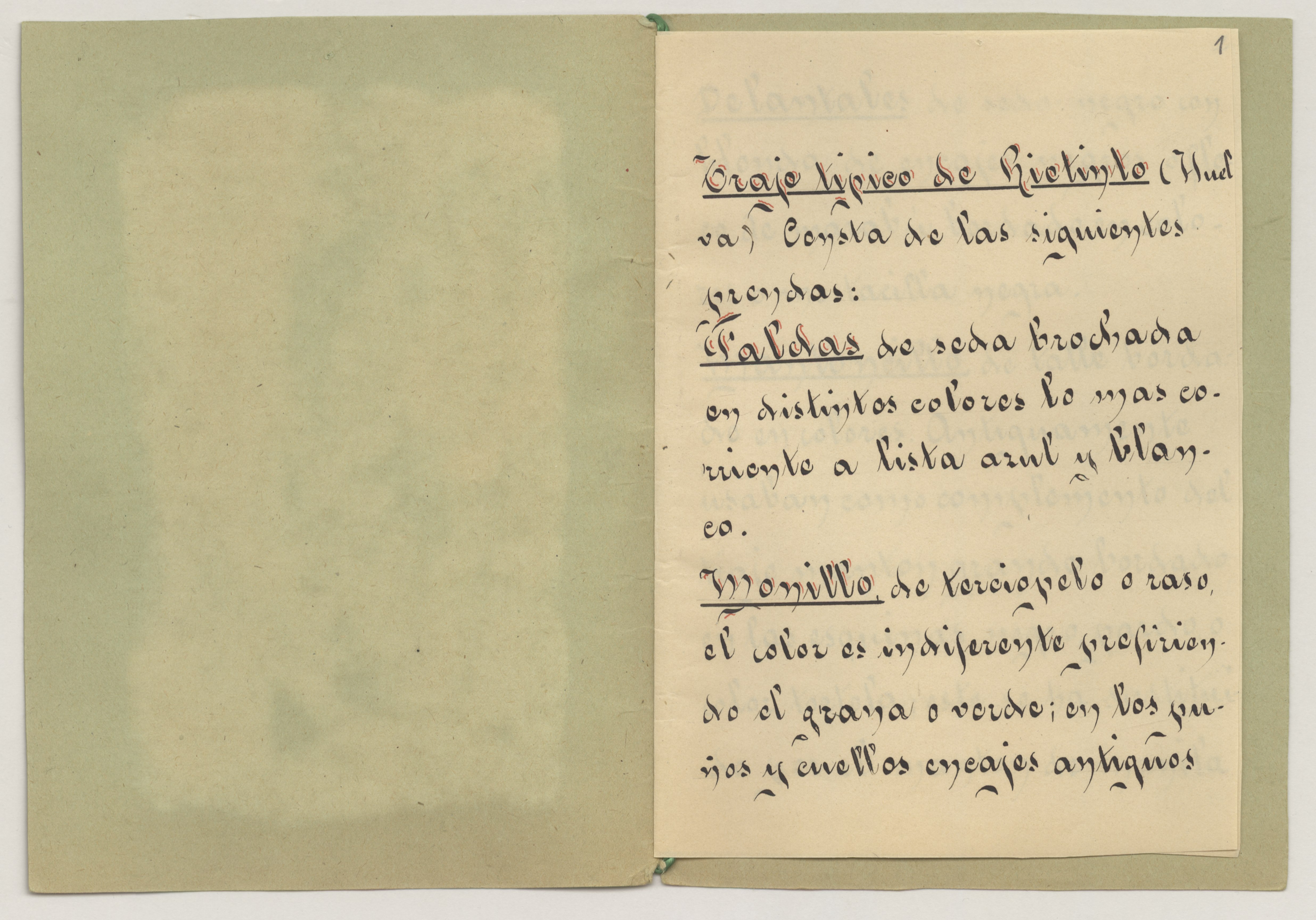 Cuadernillo de cuatro hojas escritas por una página, sin numerar, en papel tamaño A6, con tapa de cartulina y sujetas por cordón verde de seda. El texto está realizado con una caligrafía muy adornada y sin firma. La tapa está ilustrada con el dibujo a color de un traje típico femenino, sin firmar.