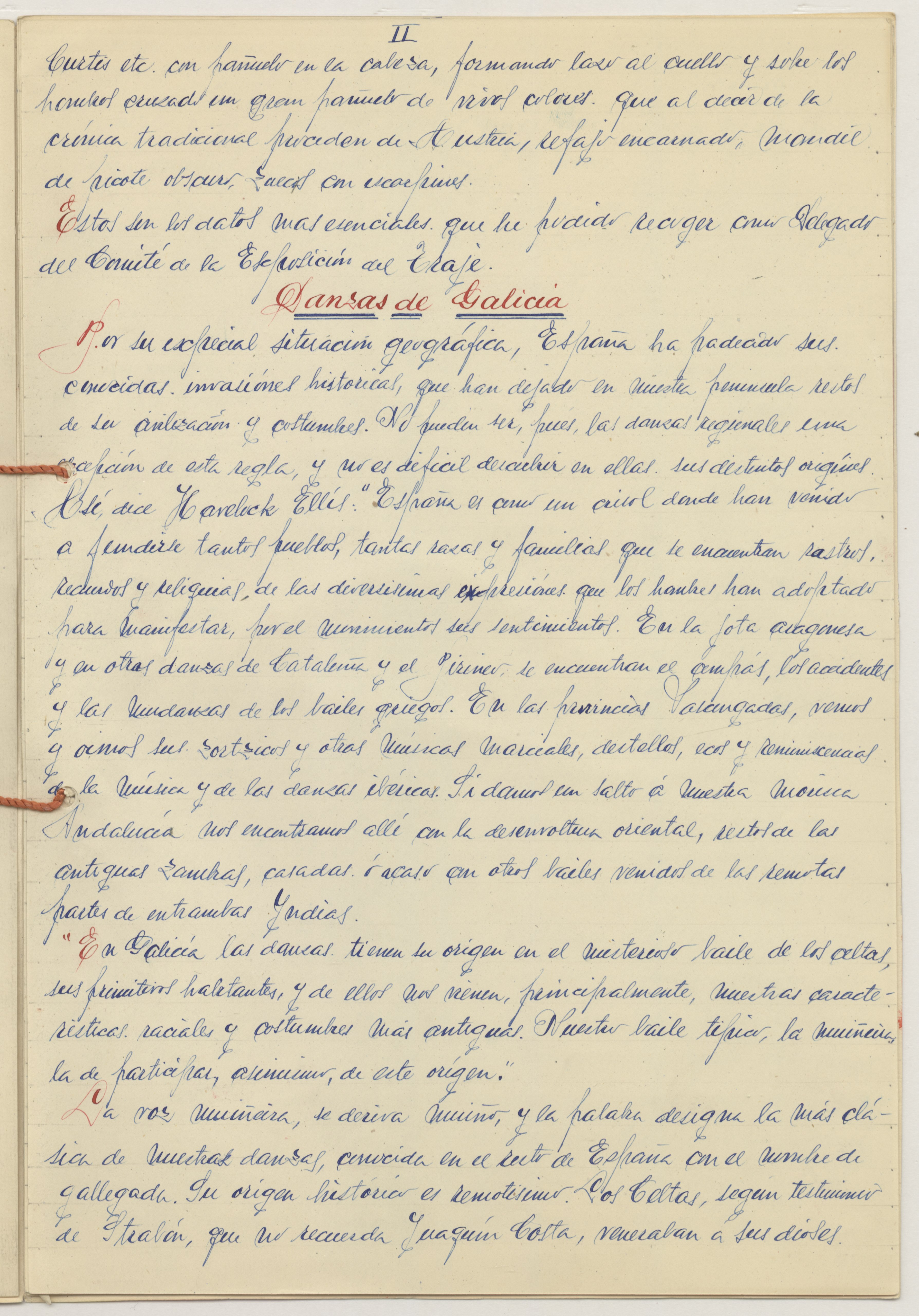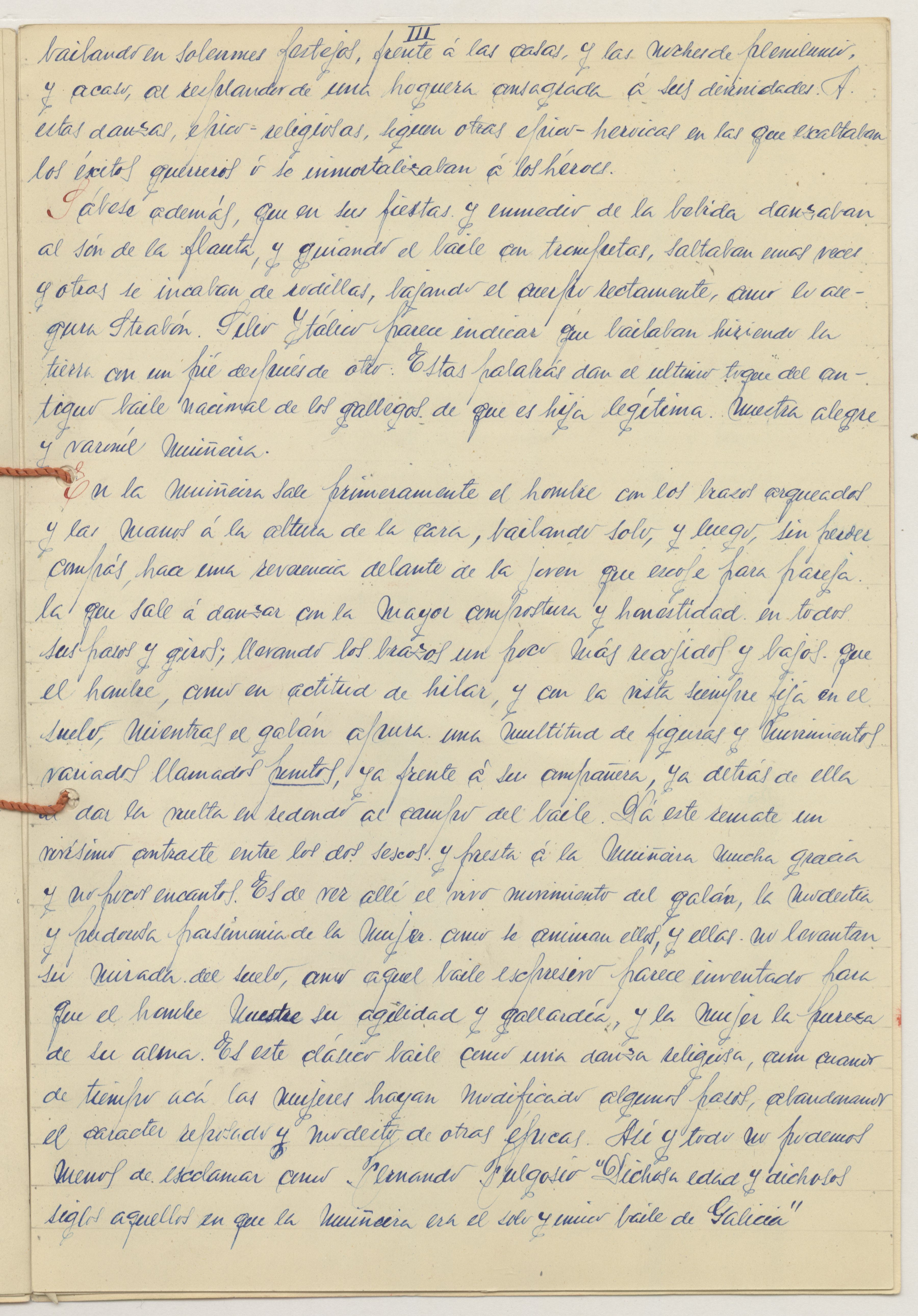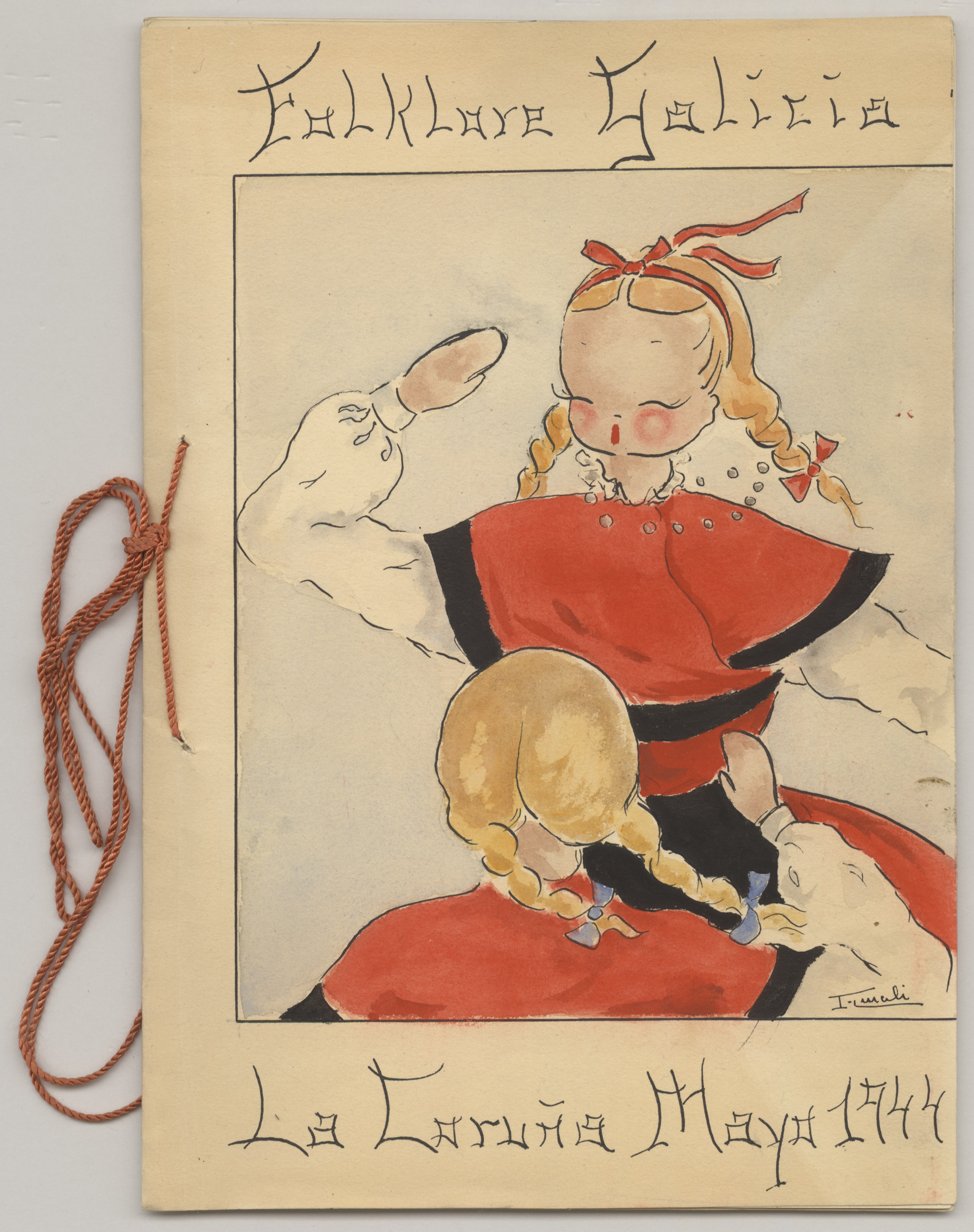 Texto presentado en forma de cuadernillo cerrado con cordón, escrito a mano sobre cartulinas tamaño folio. Portada con dibujo de niñas bailando, vestidas con el traje típico y firmado y rubricado.
