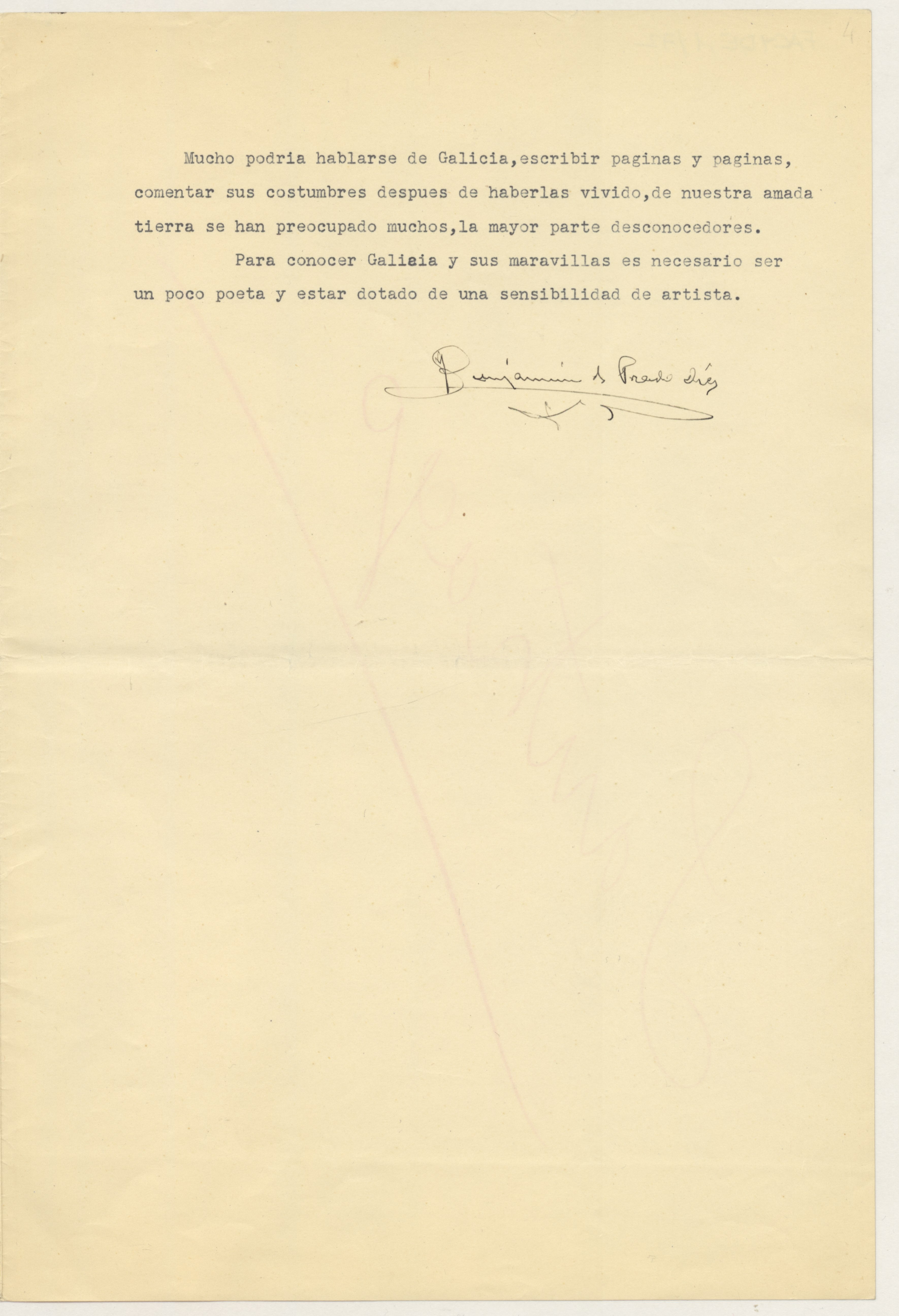 Informe sobre el folklore gallego firmado y rubricado por Benjamín Prado Díez.