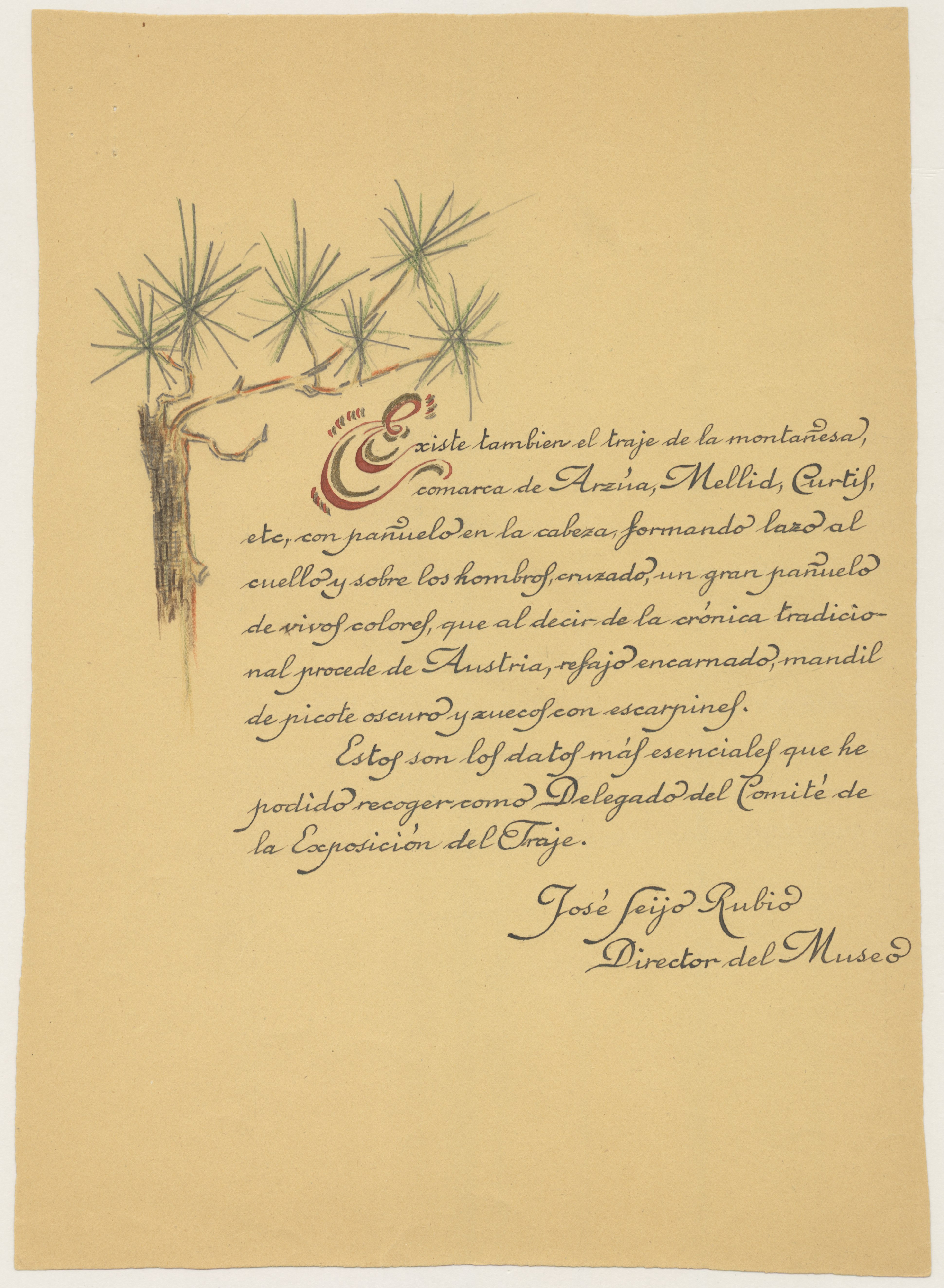 Texto escrito con caligrafía muy decorada, sobre papel grueso tamaño folio, firmado por José Feijó Rubio.