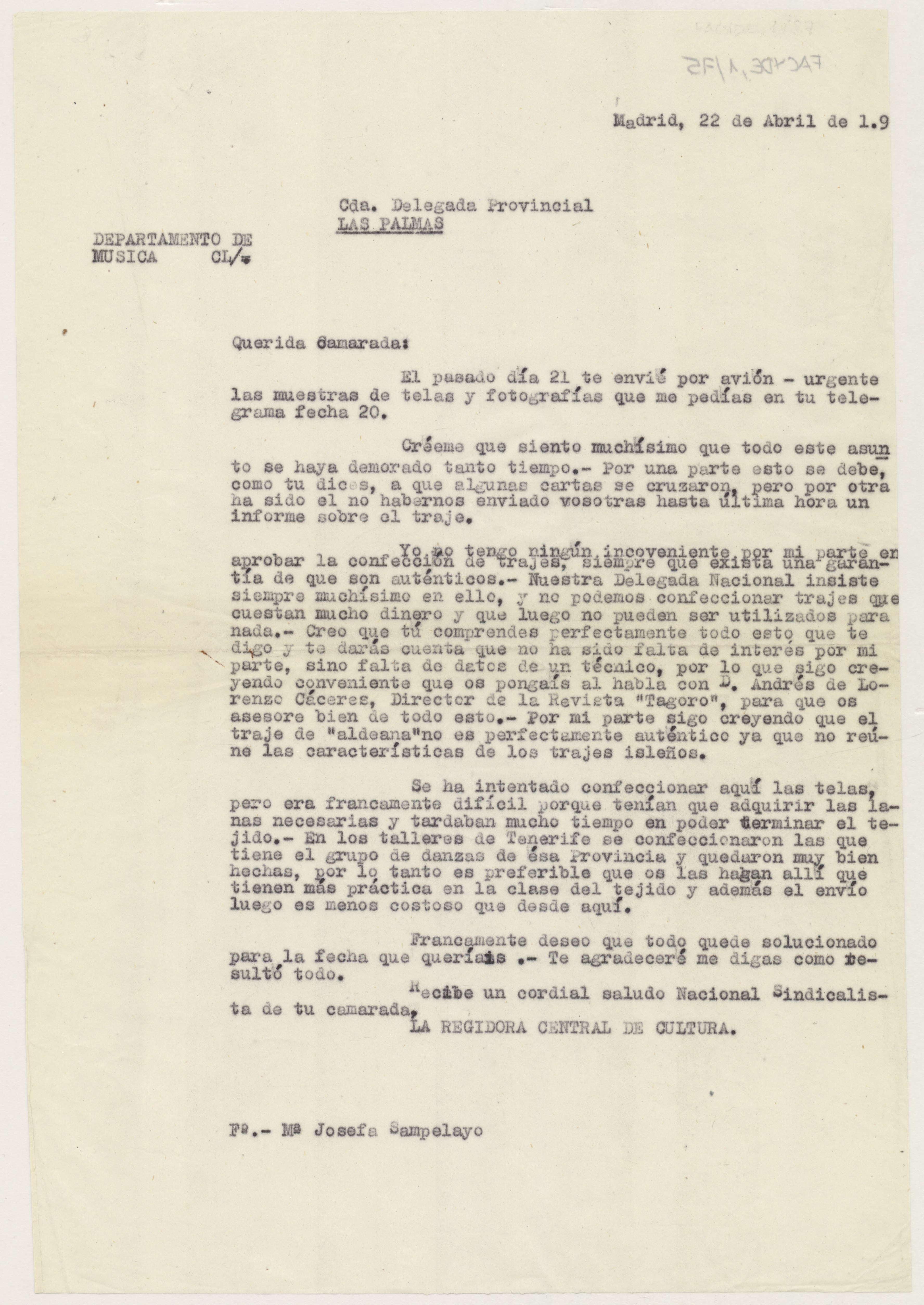 Copia de una carta enviada por María Josefa Sampelayo, regidora central de Cultura de la Sección Femenina, a la Delegada Provincial en Las Palmas relativa a la confección de varios trajes regionales de Canarias.