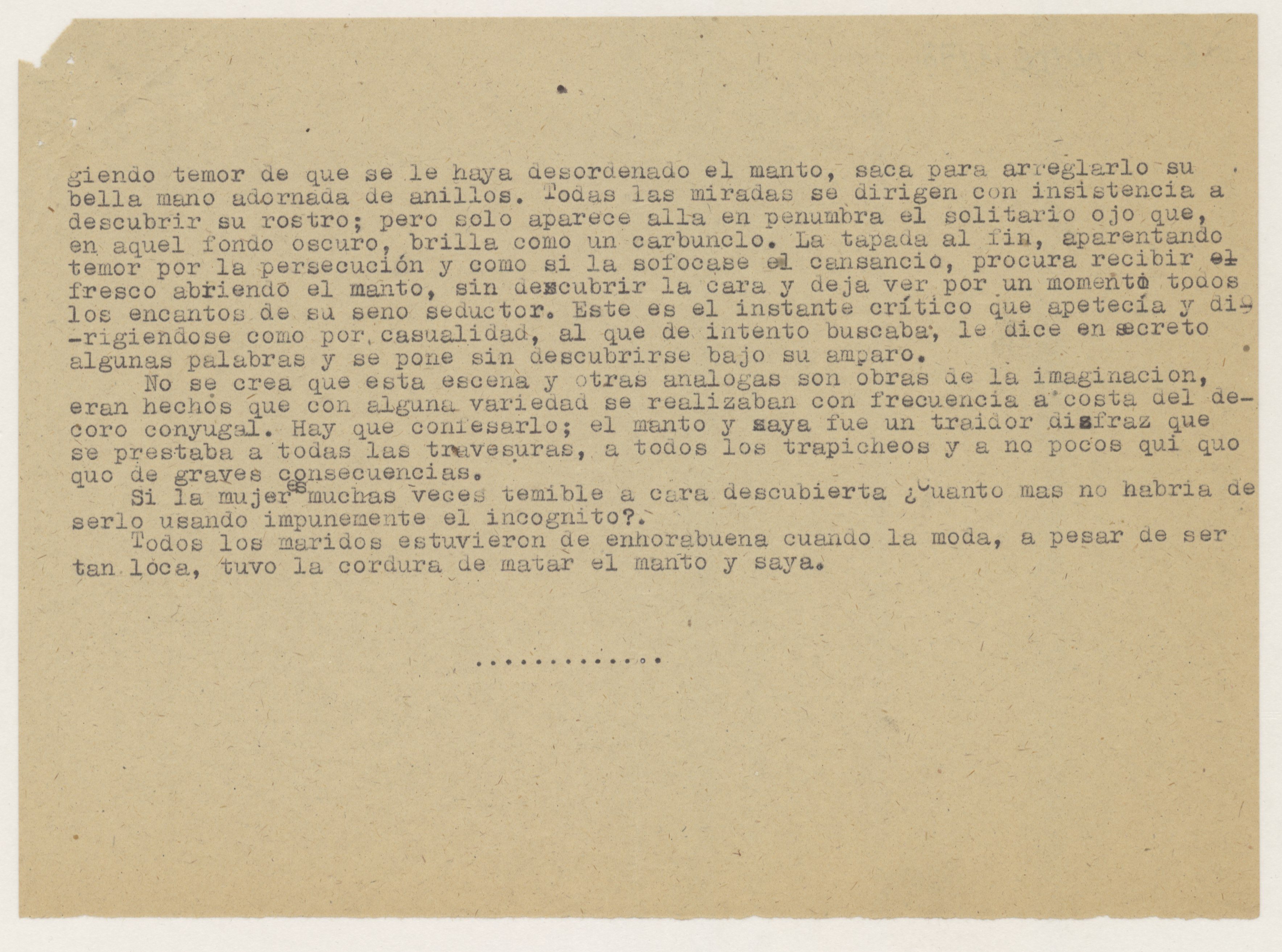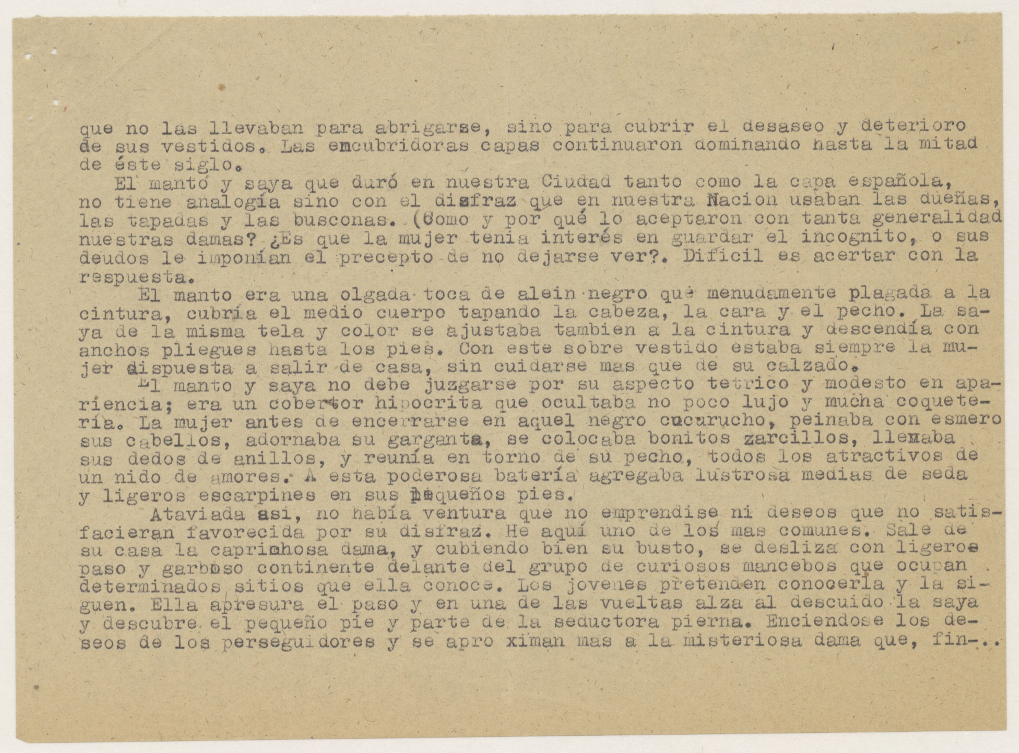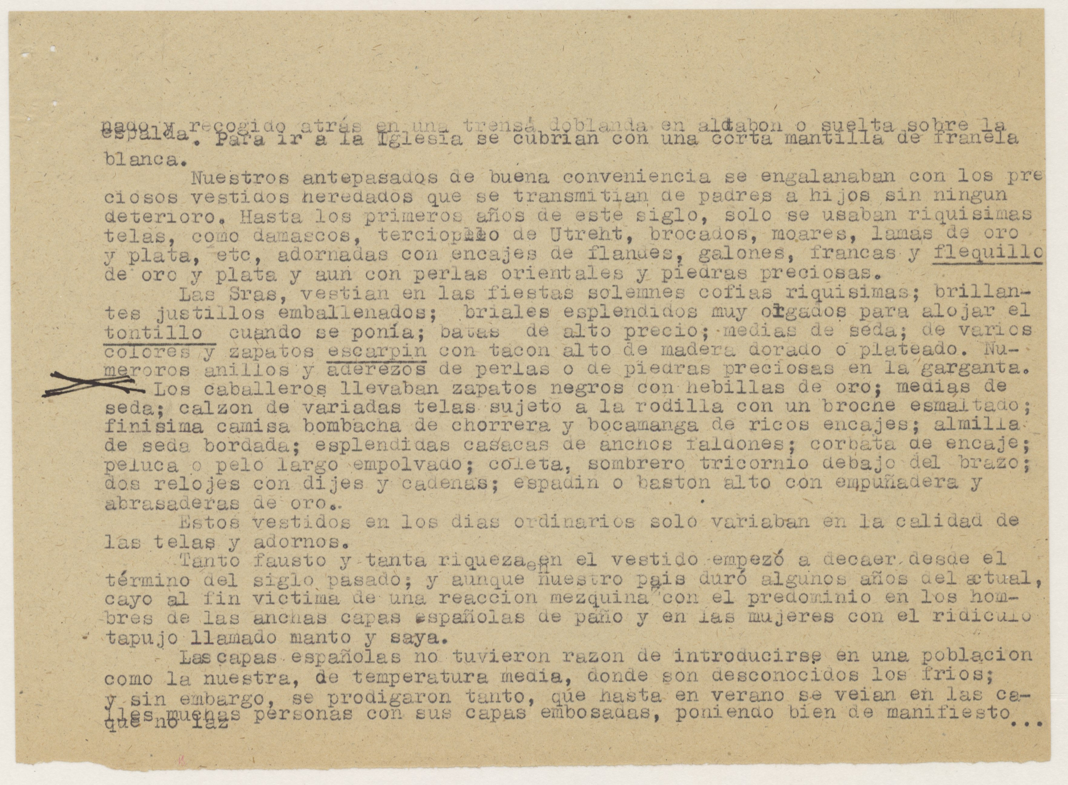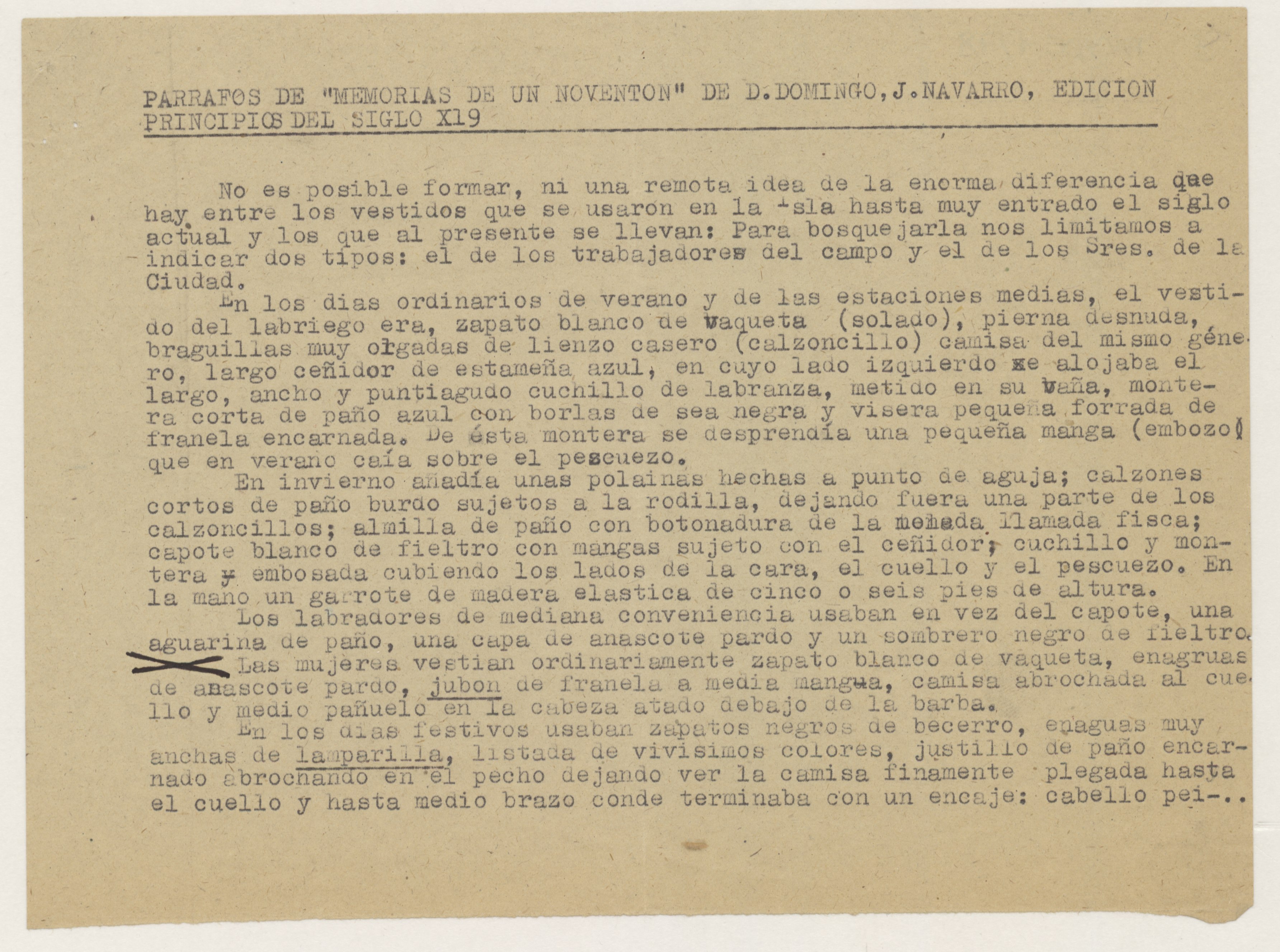Carta escrita, en las dos páginas de la primera hoja de las dos que ocupa, en papel tamaño folio con membrete y logotipo de Falange Española Tradicionalista y de las JONS, firmado y rubricado por la remitente, con sello ilegible, probablemente de su Delegación. El texto de la carta es contestación a otra anterior descrita en FR,FACYDE,1/76 y en él, se describen los trajes de señora y de aldeana. Adjunta informe de cuatro hojas escritas por una cara en papel tamaño cuartilla, cuyo texto se basa en varios párrafos del libro "Memorias de un noventón", de Domingo José Navarro, según la referencia. El título correcto del libro referido es "Recuerdos de un noventón: memorias de lo que fue la ciudad de Las Palmas de Gran Canaria a principios de siglo y de los usos y costumbres de sus habitantes", editado en 1895.