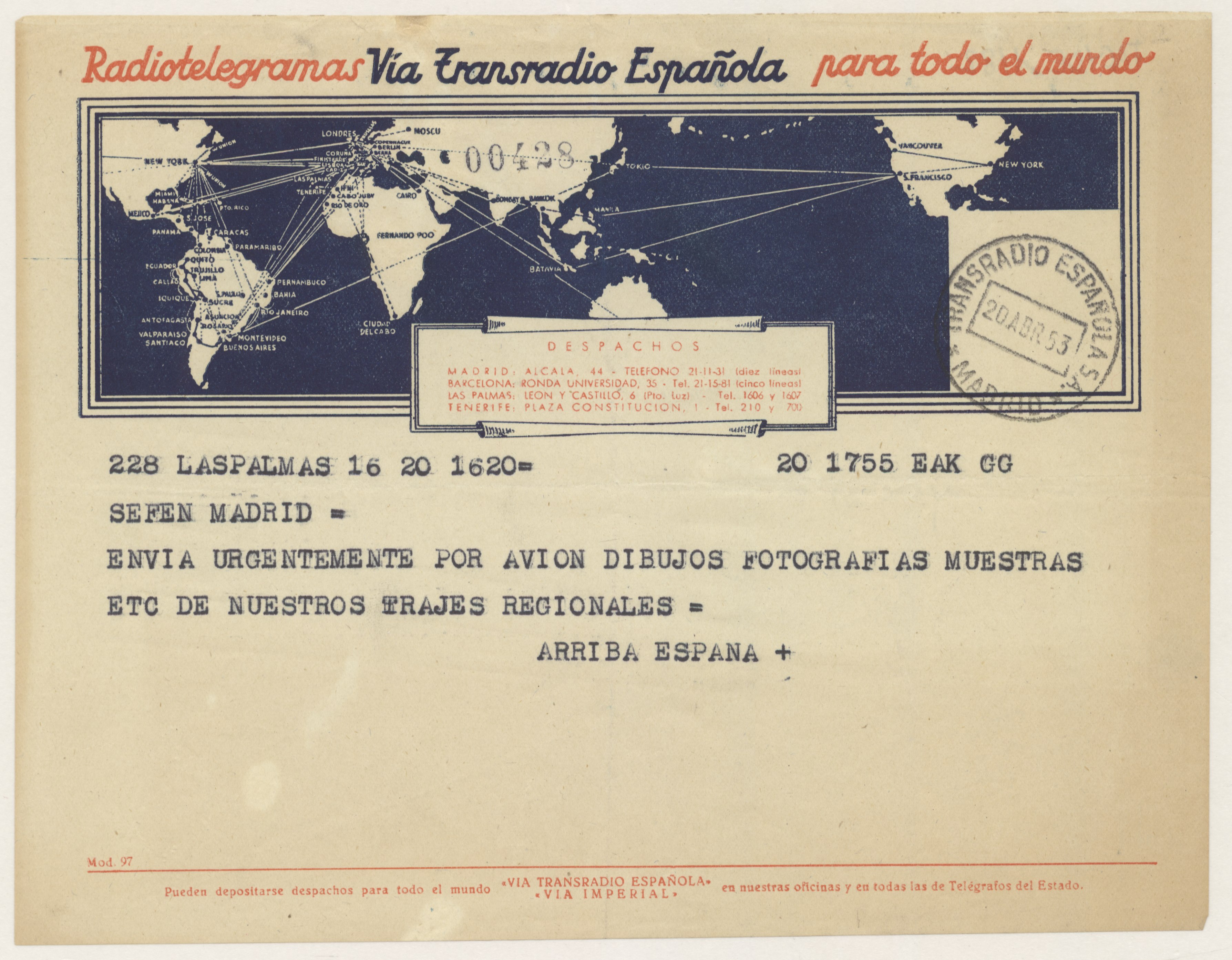 Radiotelegrama solicitando información sobre los trajes regionales de Canarias.