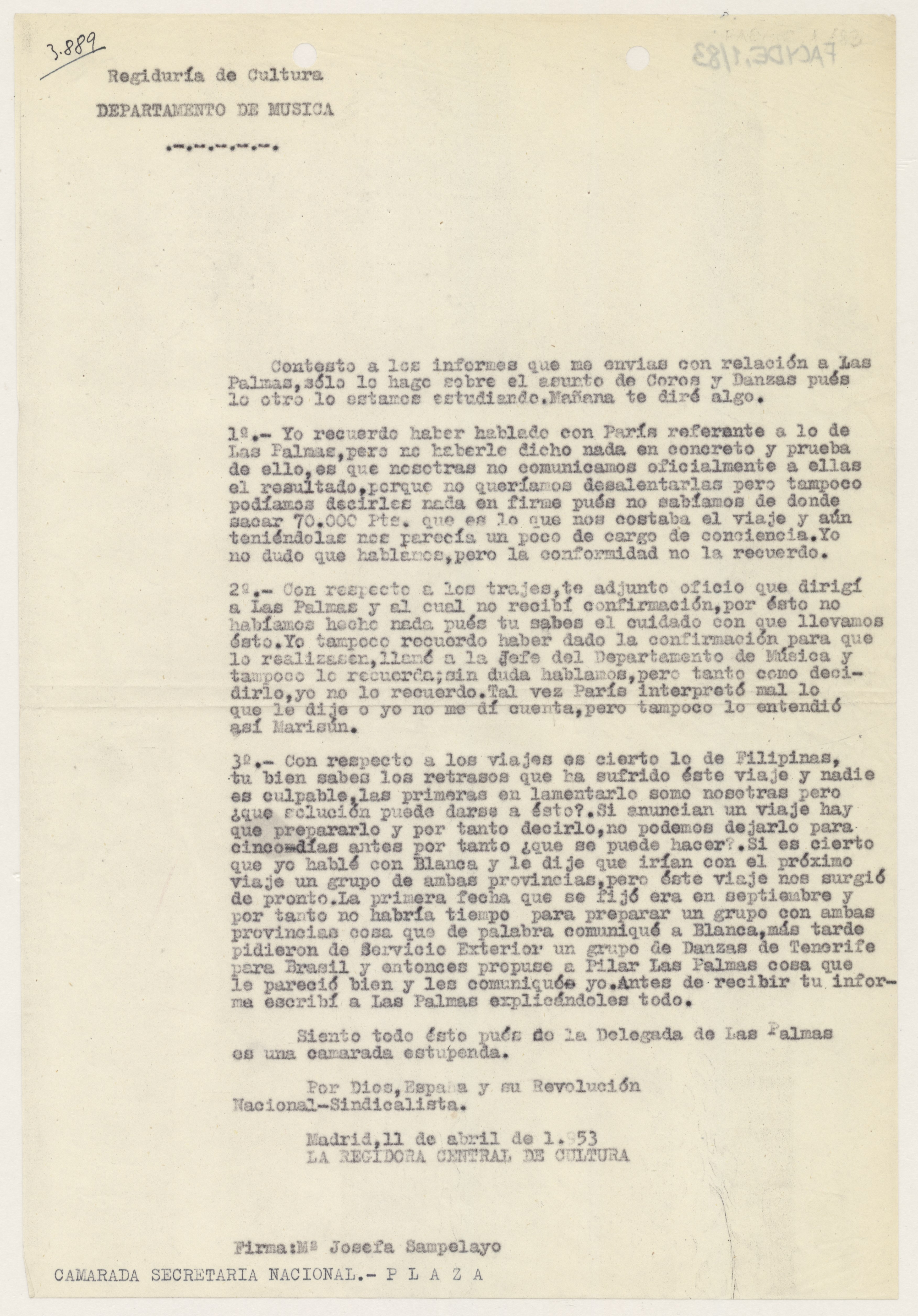 Copia de la carta enviada por María Josefa Sampelayo, regidora central de Cultura de la Sección Femenina, a la Secretaria Nacional sobre varios temas relacionados con la Delegación Provincial en Las Palmas.
