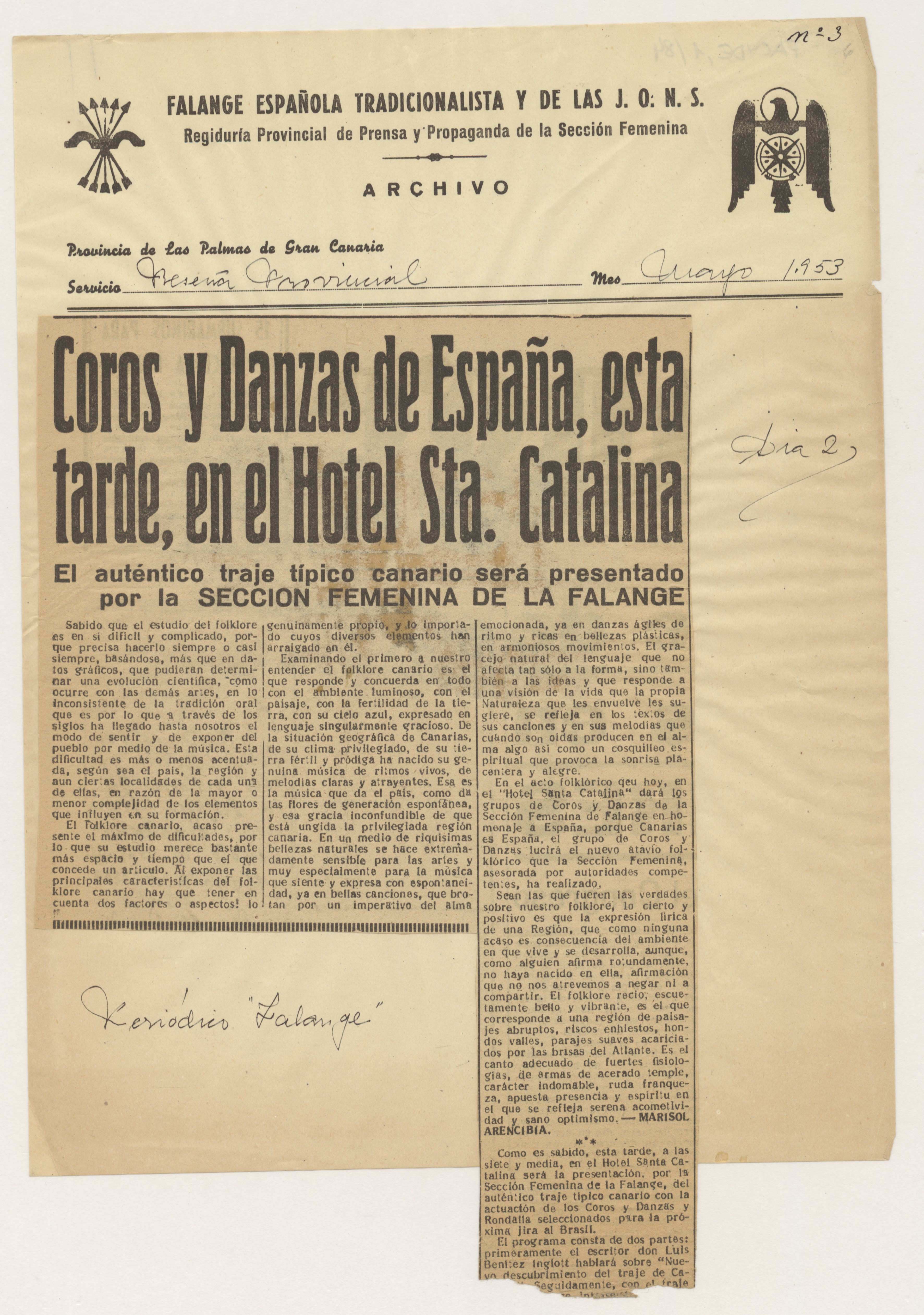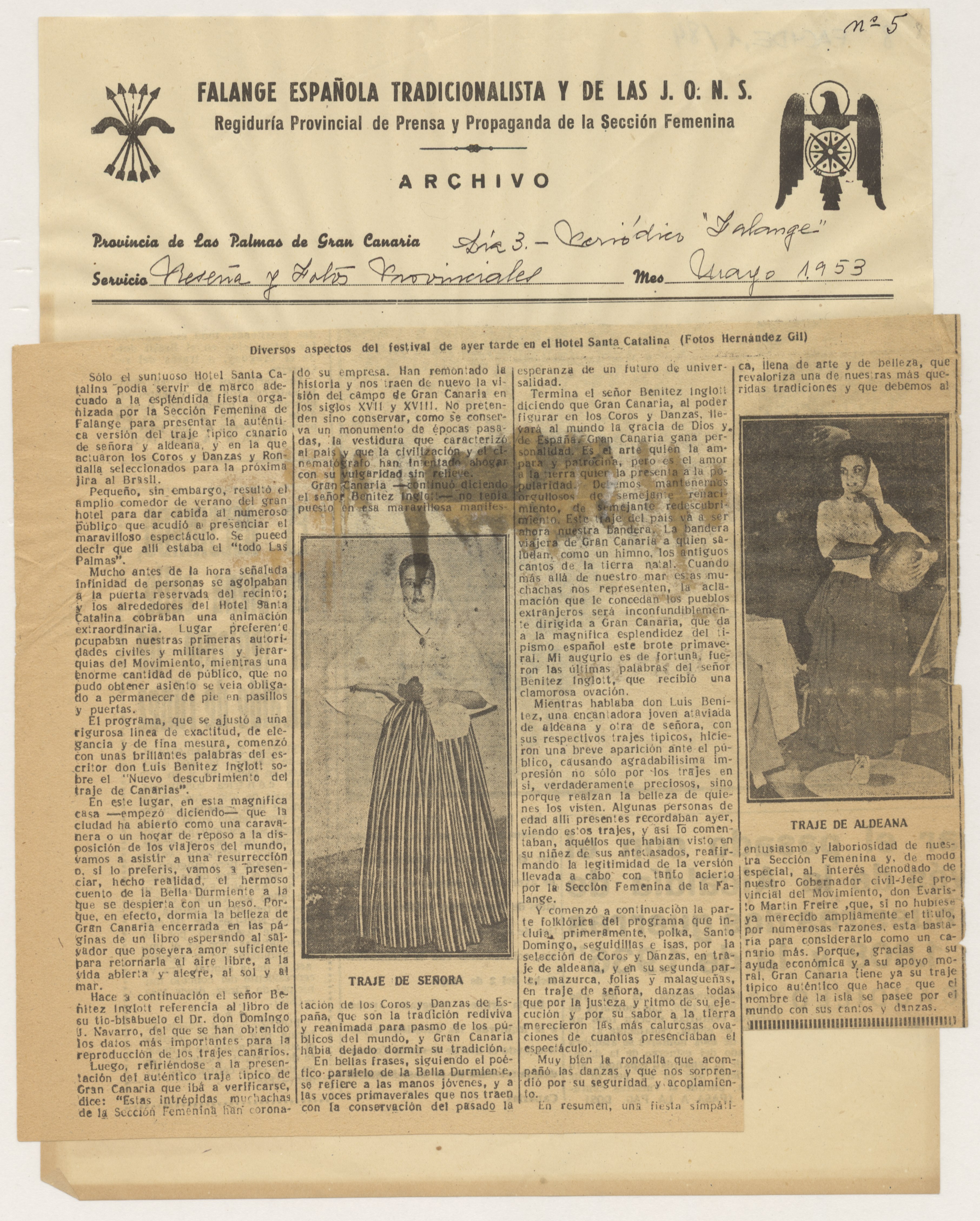 Carta escrita en papel tamaño cuartilla con membrete y logotipo de Falange Española Tradicionalista y de las JONS, Delegación Provincial de la Sección Femenina en Las Palmas. Sobre las firmas y rúbricas de las remitentes, lleva sellos de los departamentos que representan. Adjunta informe, sin firma, redactado en papel tamaño folio, sobre el festival celebrado en el Hotel Santa Catalina con motivo de la presentación del auténtico traje regional. Adjunta, además, once hojas con membrete de la Regiduría Provincial de Prensa y Propaganda de la Sección Femenina, numeradas y fechadas, con recortes de prensa pegados que tratan el tema de la fiesta de presentación del traje.