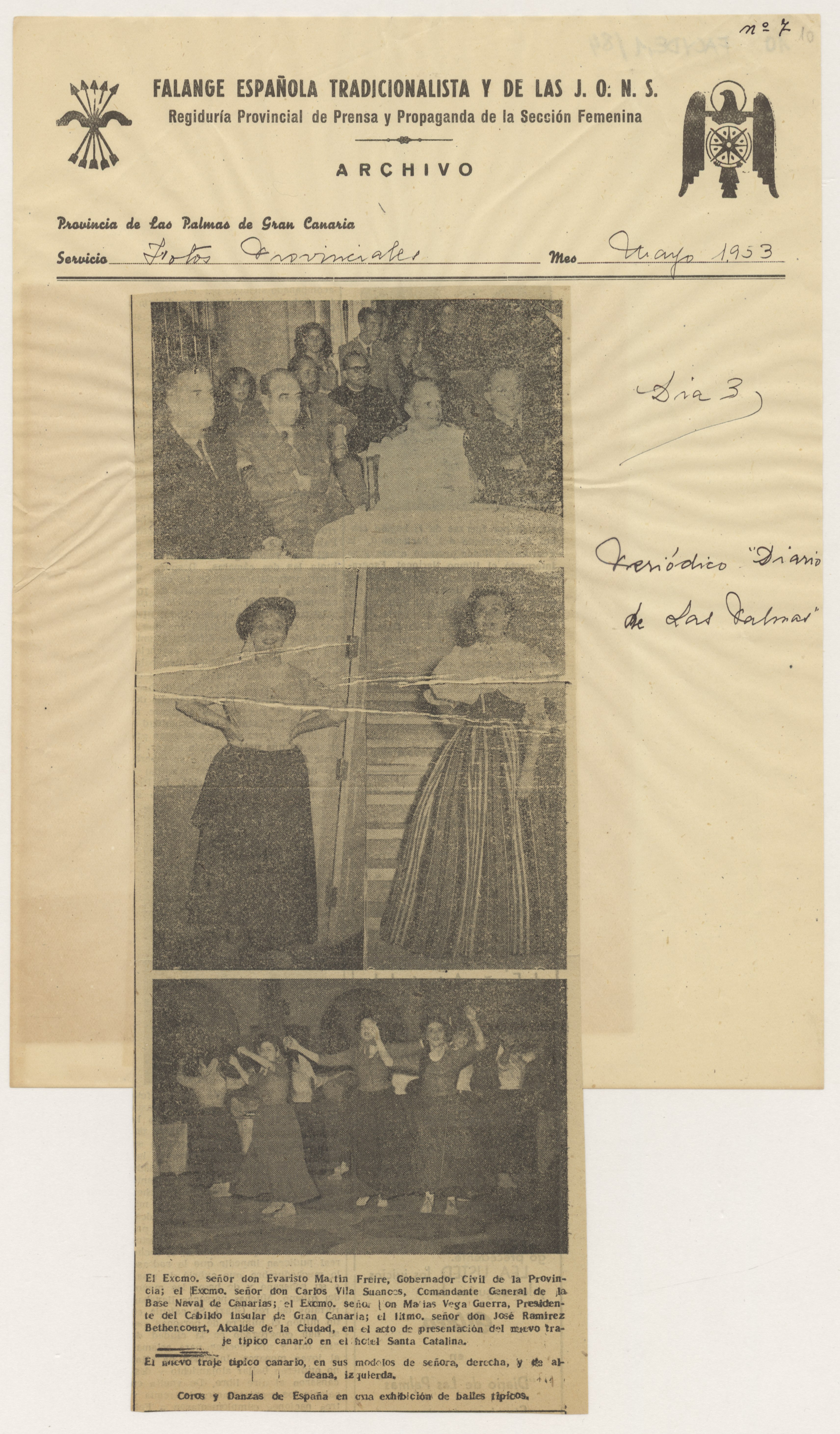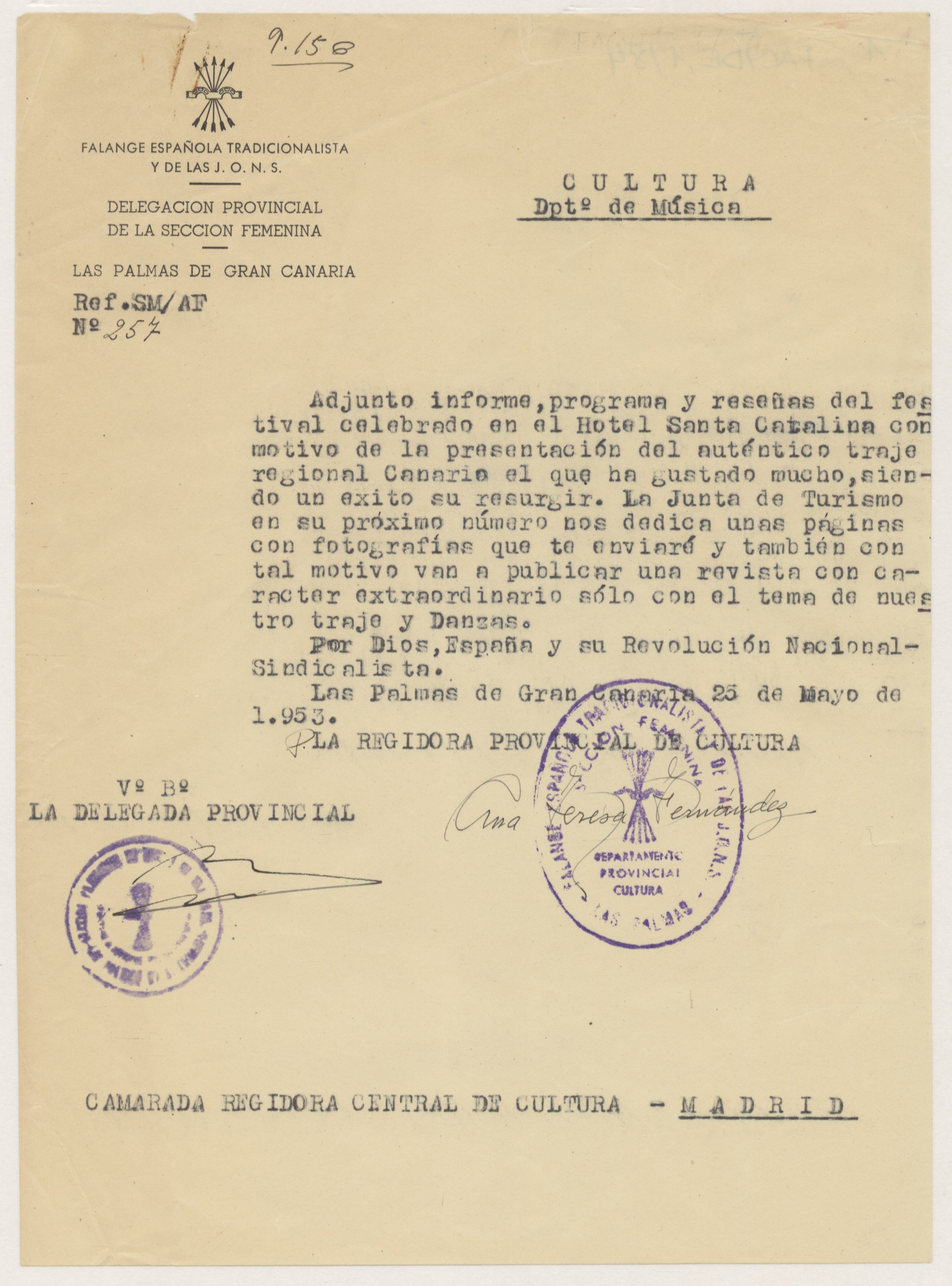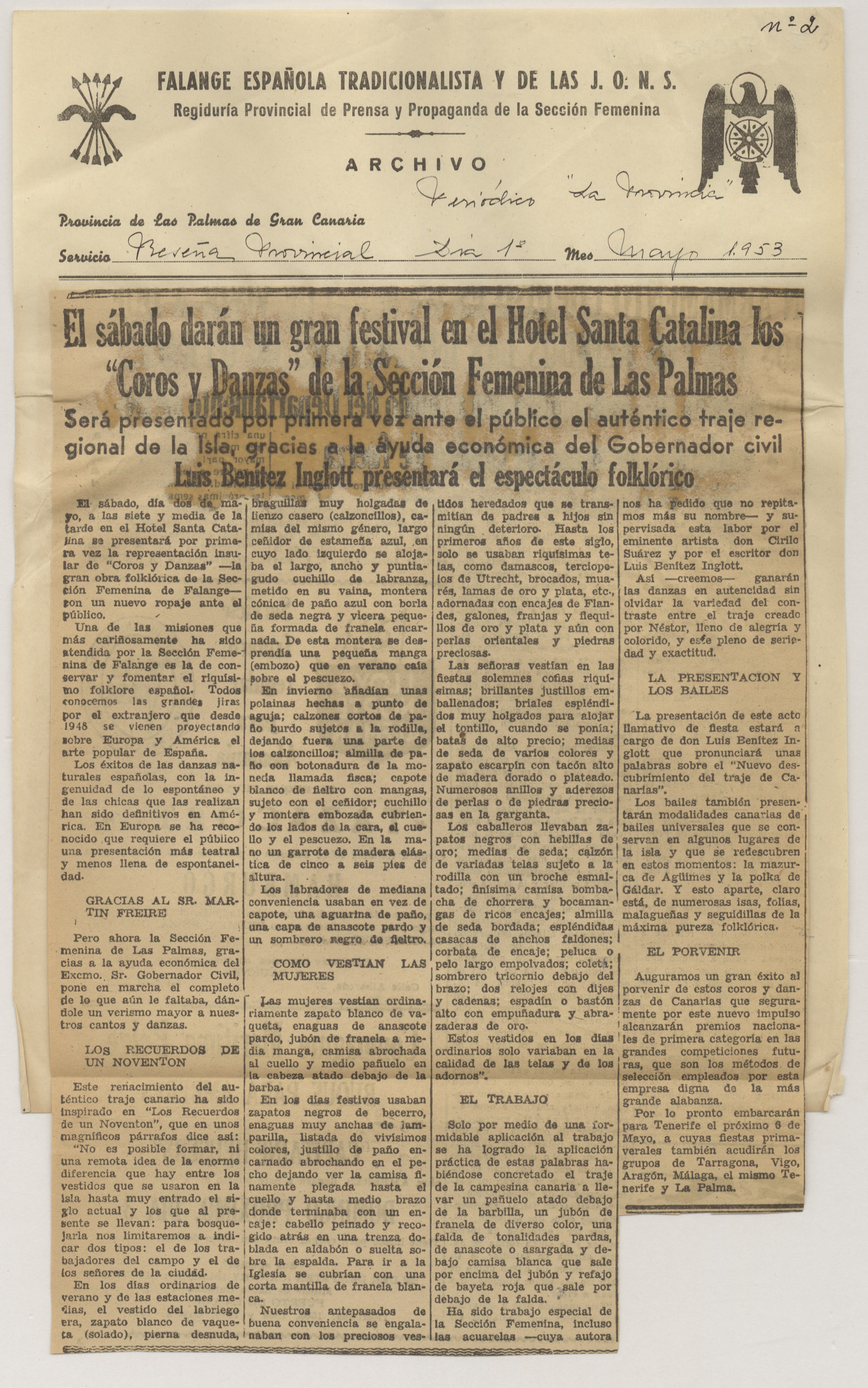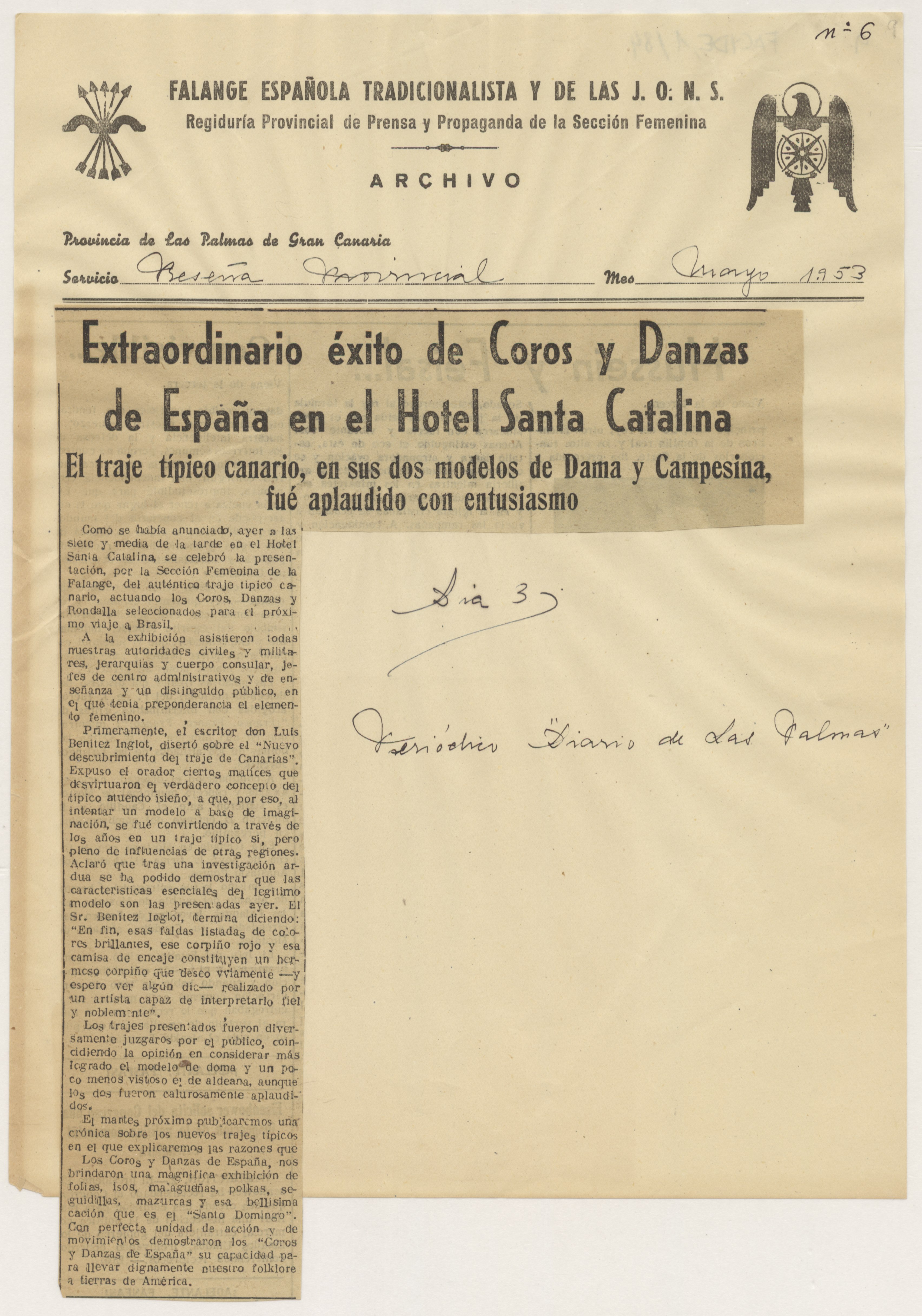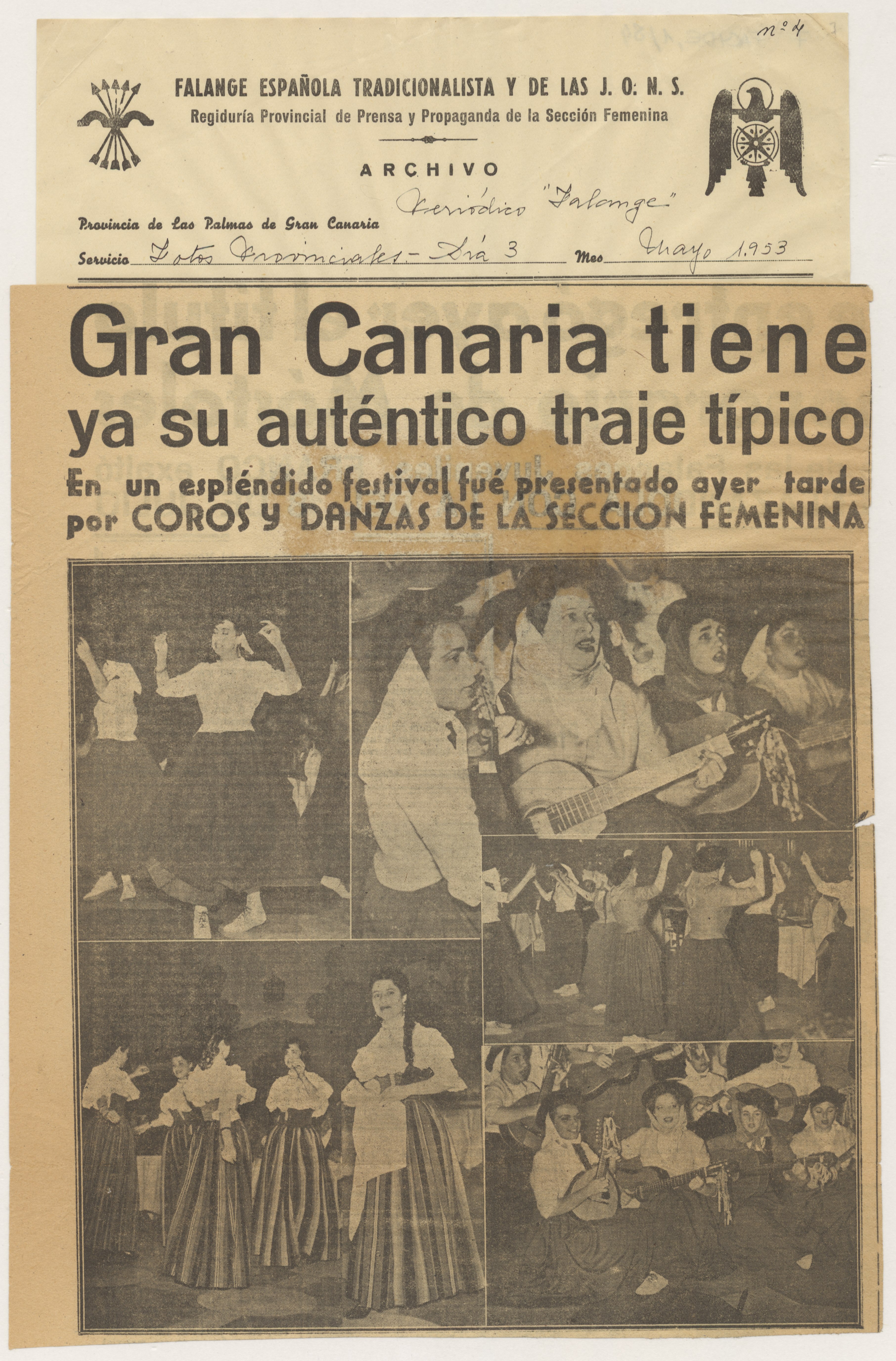 Carta escrita en papel tamaño cuartilla con membrete y logotipo de Falange Española Tradicionalista y de las JONS, Delegación Provincial de la Sección Femenina en Las Palmas. Sobre las firmas y rúbricas de las remitentes, lleva sellos de los departamentos que representan. Adjunta informe, sin firma, redactado en papel tamaño folio, sobre el festival celebrado en el Hotel Santa Catalina con motivo de la presentación del auténtico traje regional. Adjunta, además, once hojas con membrete de la Regiduría Provincial de Prensa y Propaganda de la Sección Femenina, numeradas y fechadas, con recortes de prensa pegados que tratan el tema de la fiesta de presentación del traje.