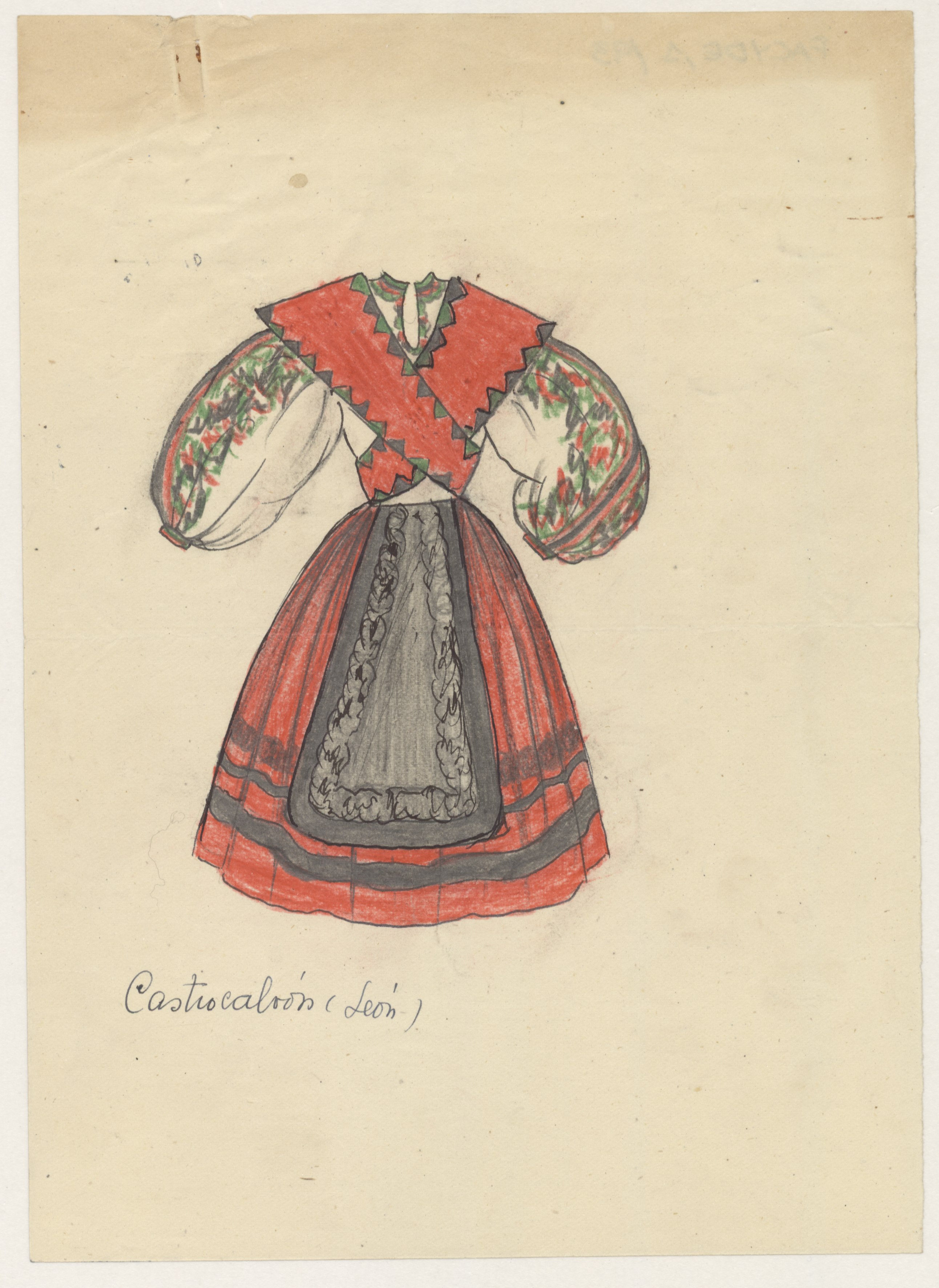 Dibujo a color sobre papel tamaño cuartilla. Imagen de vestido femenino, sin firma.