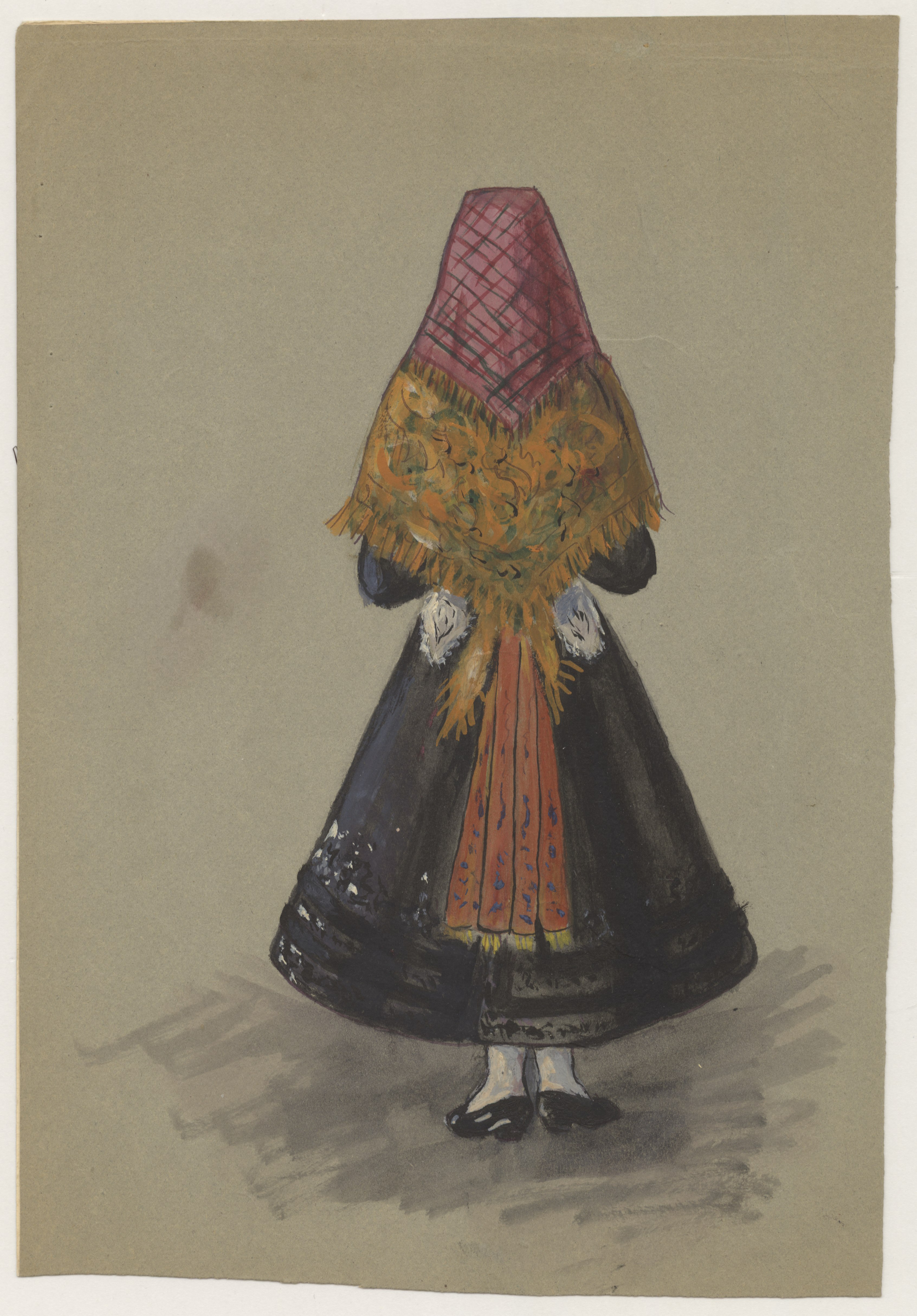 Dibujos a color realizados en cartón tamaño folio que muestran figuras de mujer vestida con traje regional, vista de frente, uno de ellos, y de espaldas, el otro. Sin firma. En una anotación manuscrita a lápiz en el reverso del primer dibujo se lee "Astorga".