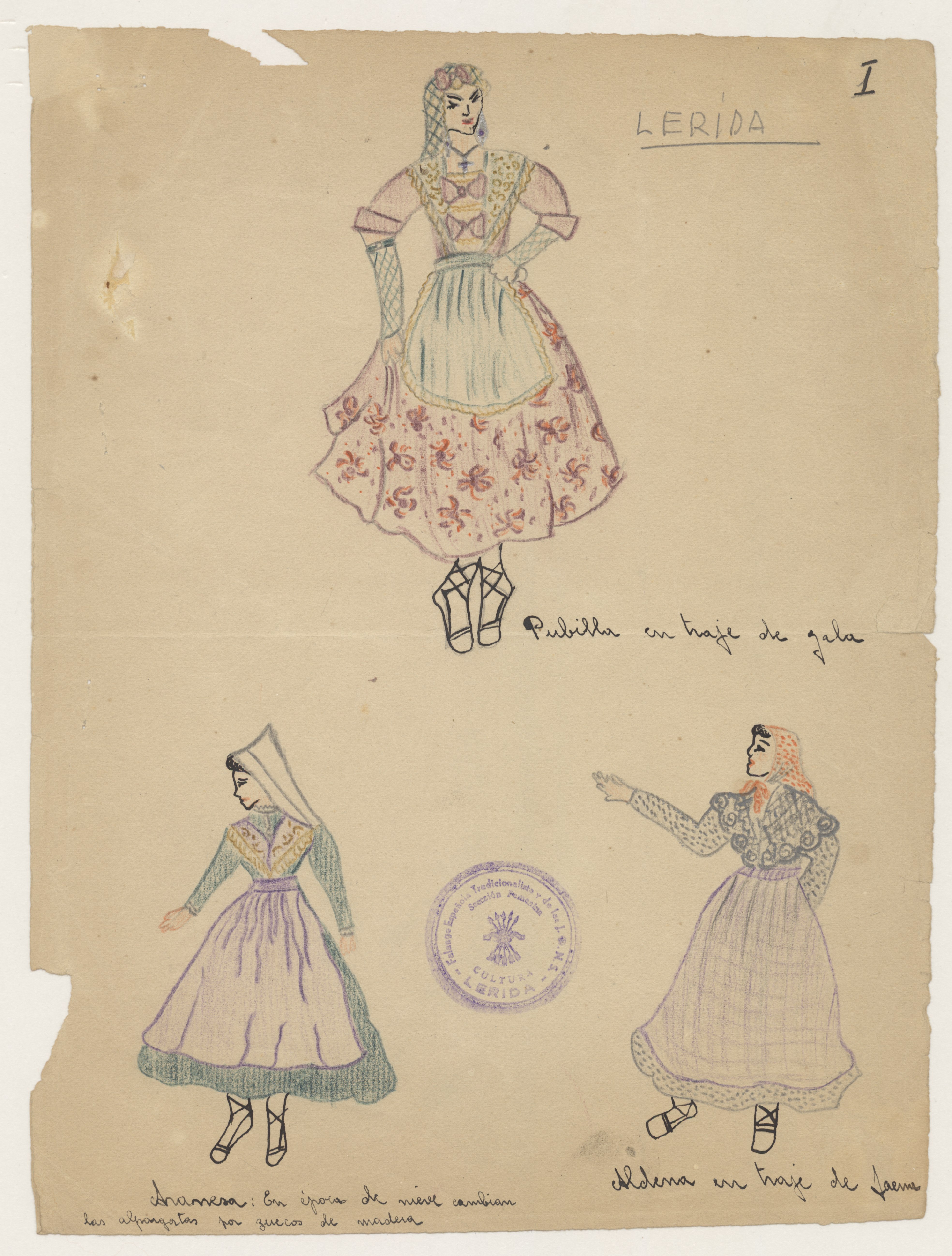 Dibujos de mujeres vestidas con trajes típicos regionales de Lérida.