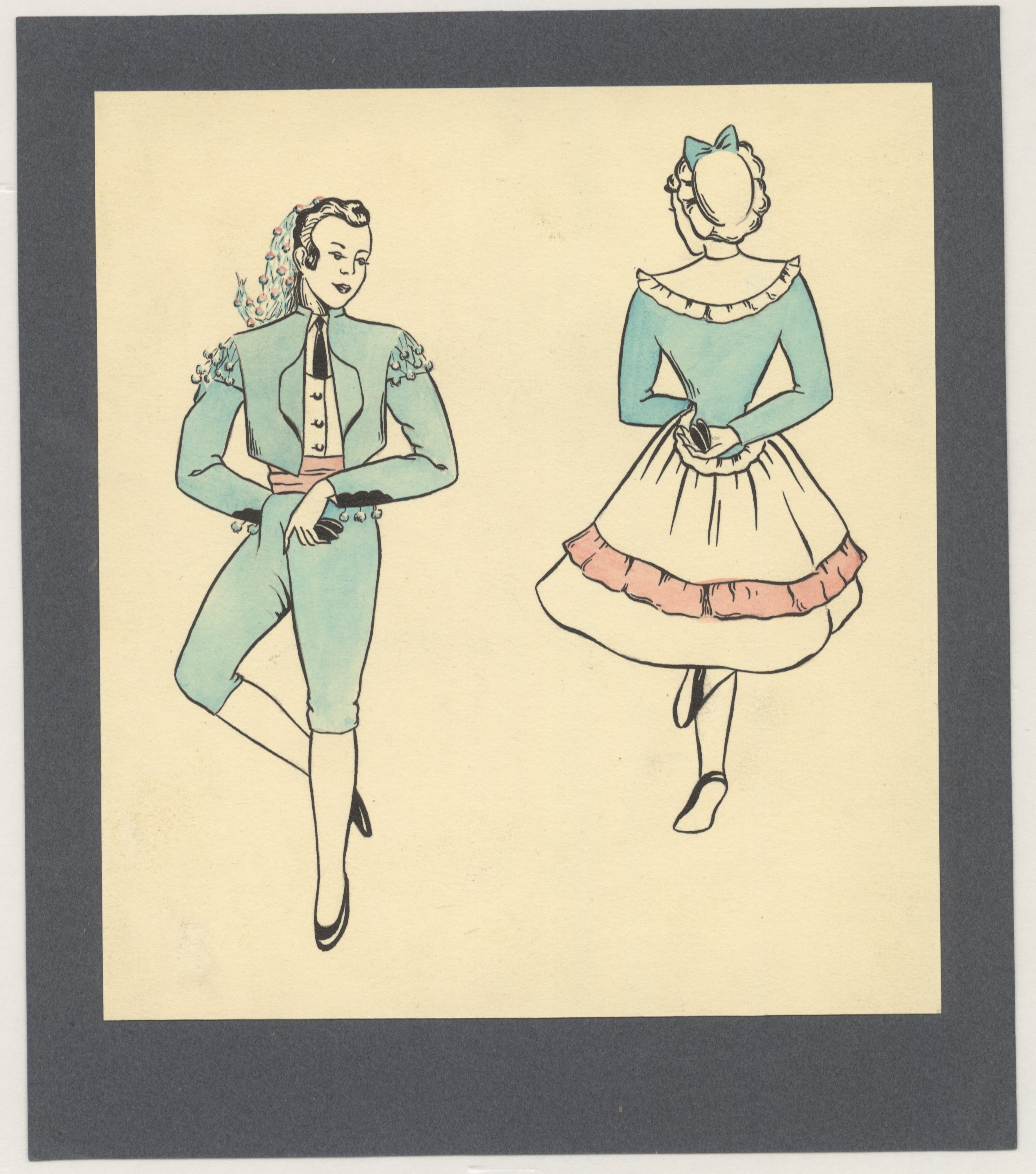 Dibujos de una pareja bailando, vestida con los trajes típicos regionales.