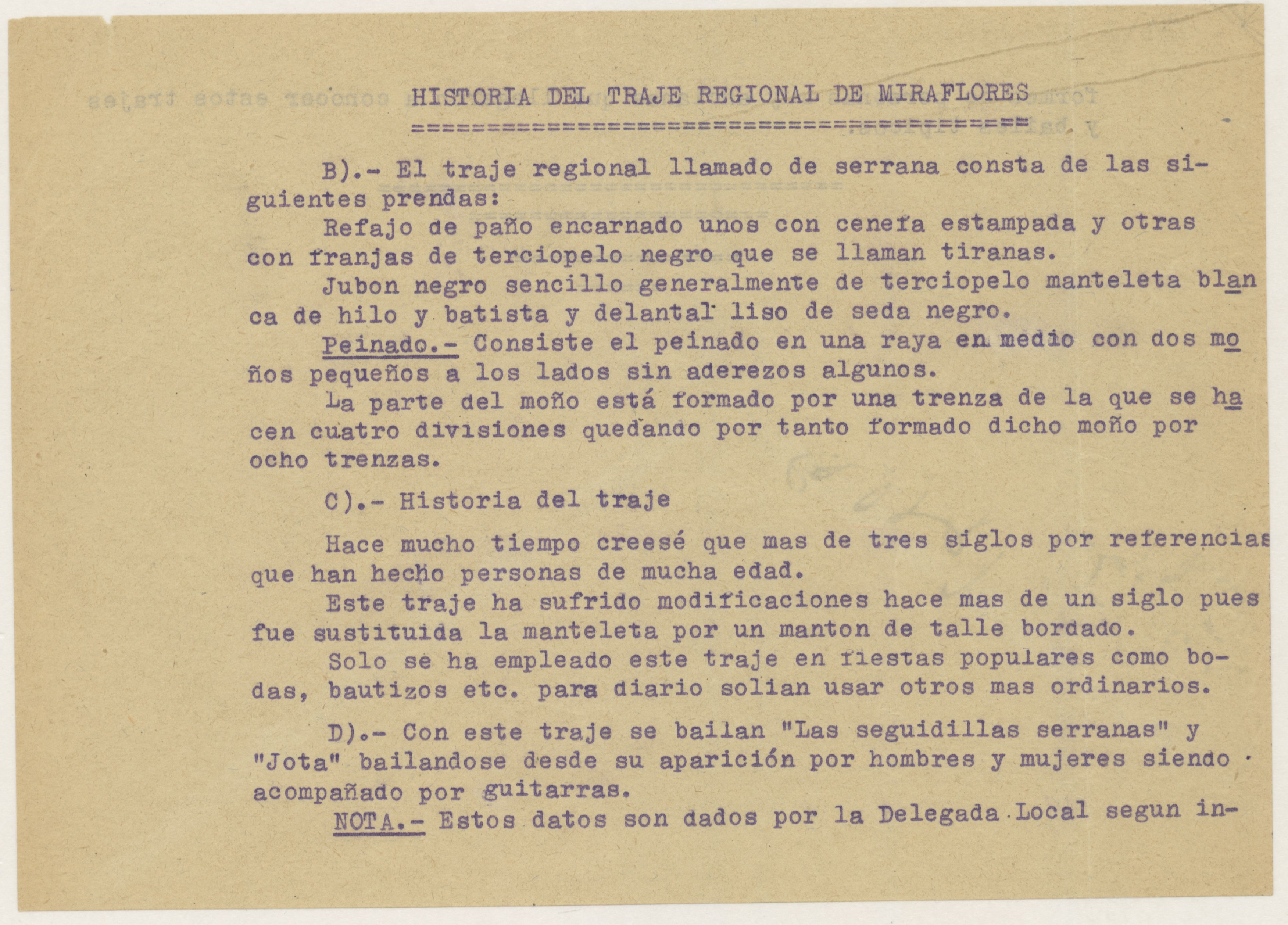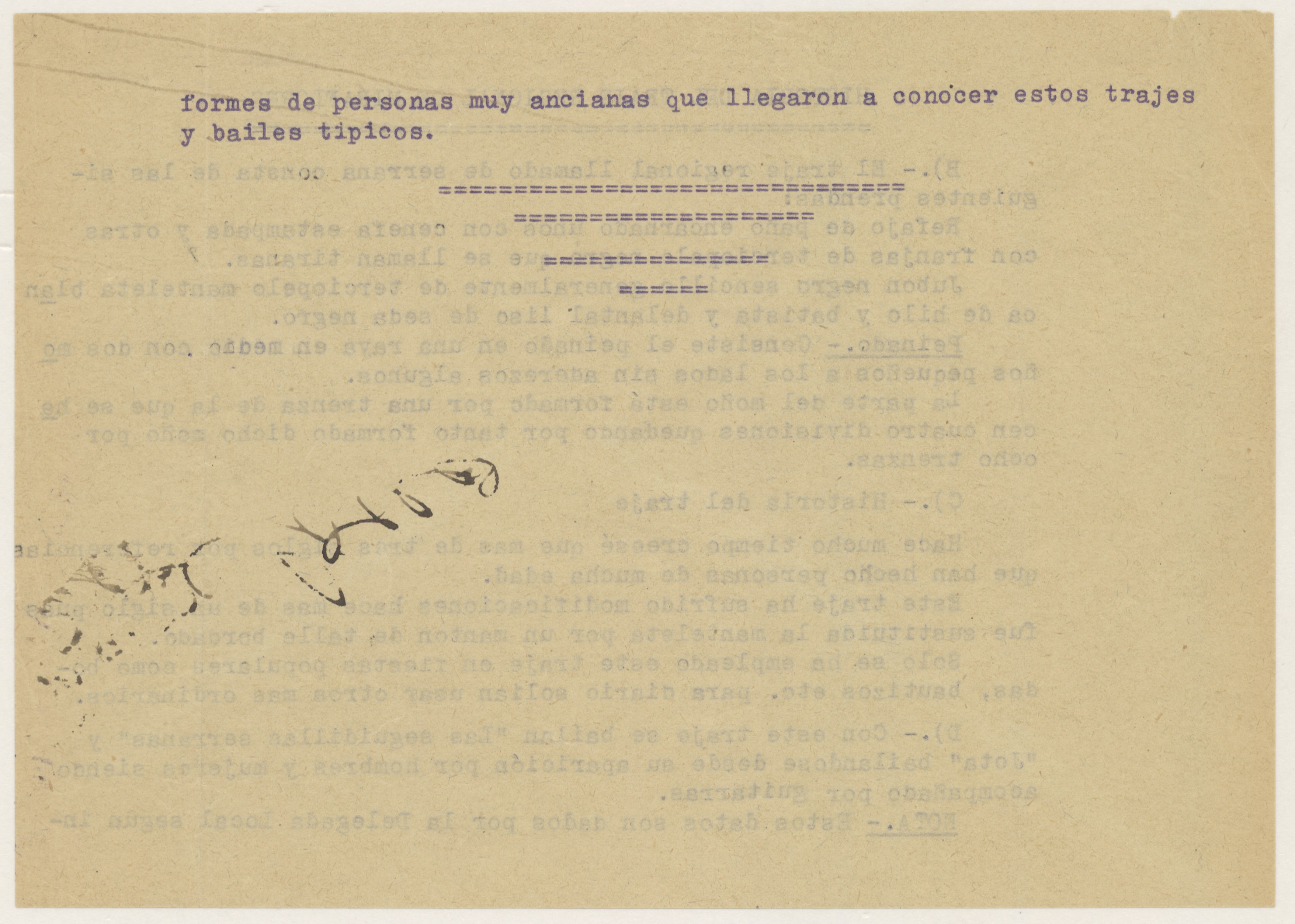 Informe redactado en papel tamaño cuartilla, sin firma, sobre el traje regional llamado de serrana.