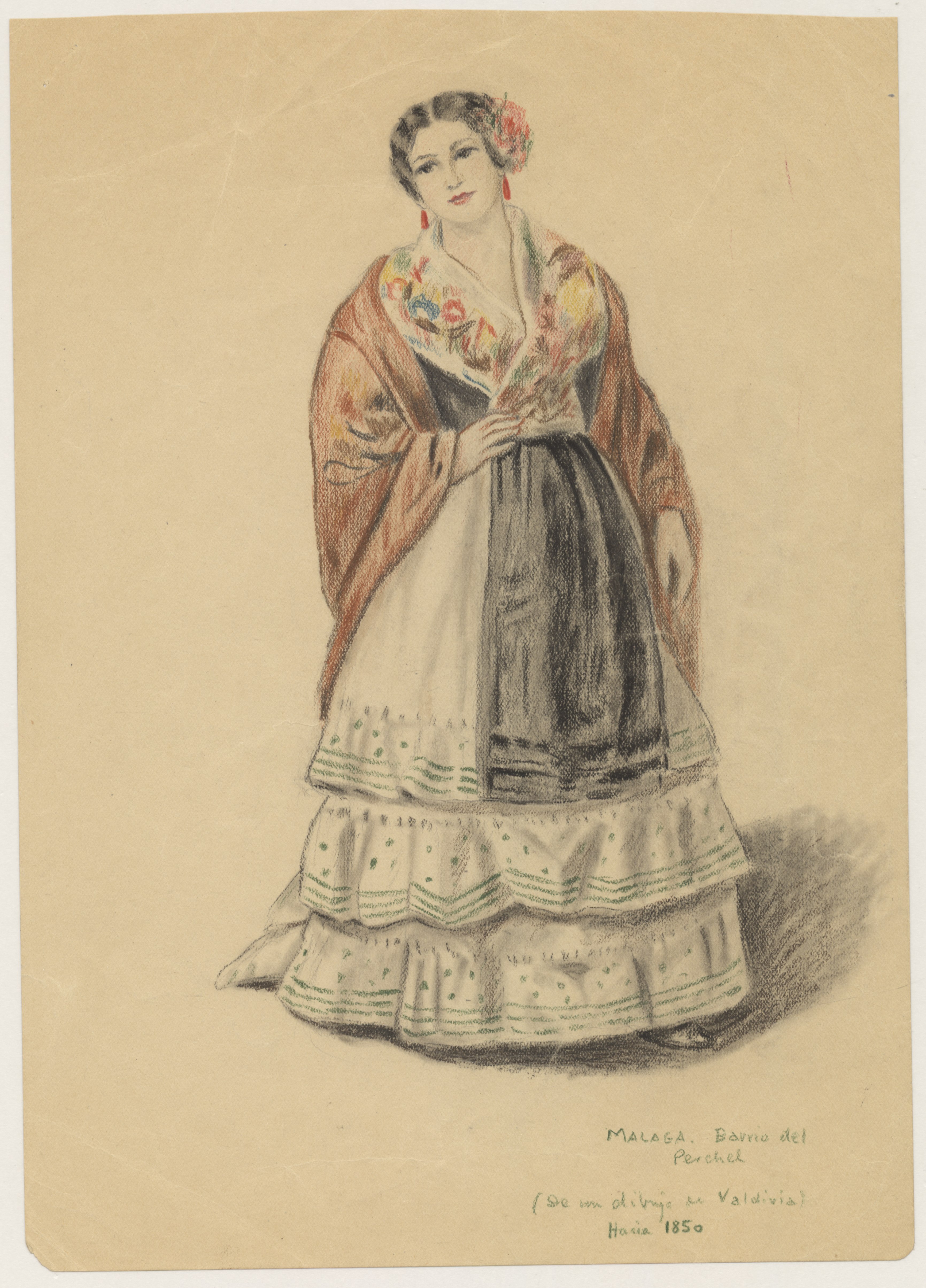 Carta redactada en papel tamaño cuartilla, con logotipo y membrete de Falange Española Tradicionalista y de las JONS, Sección Femenina, Jefatura Provincial de Málaga. Lleva sello de Registro de salida número 912 y, sobre las firmas y rúbricas de las remitentes, el sello de esa Delegación. Dibujo a color realizado en papel grueso tamaño folio, sin firma, representando la figura de una mujer, vista de frente, vestida con un traje típico del Barrio del Perchel, basado en un dibujo de Valdivia, hacia 1850, según anotaciones al margen.