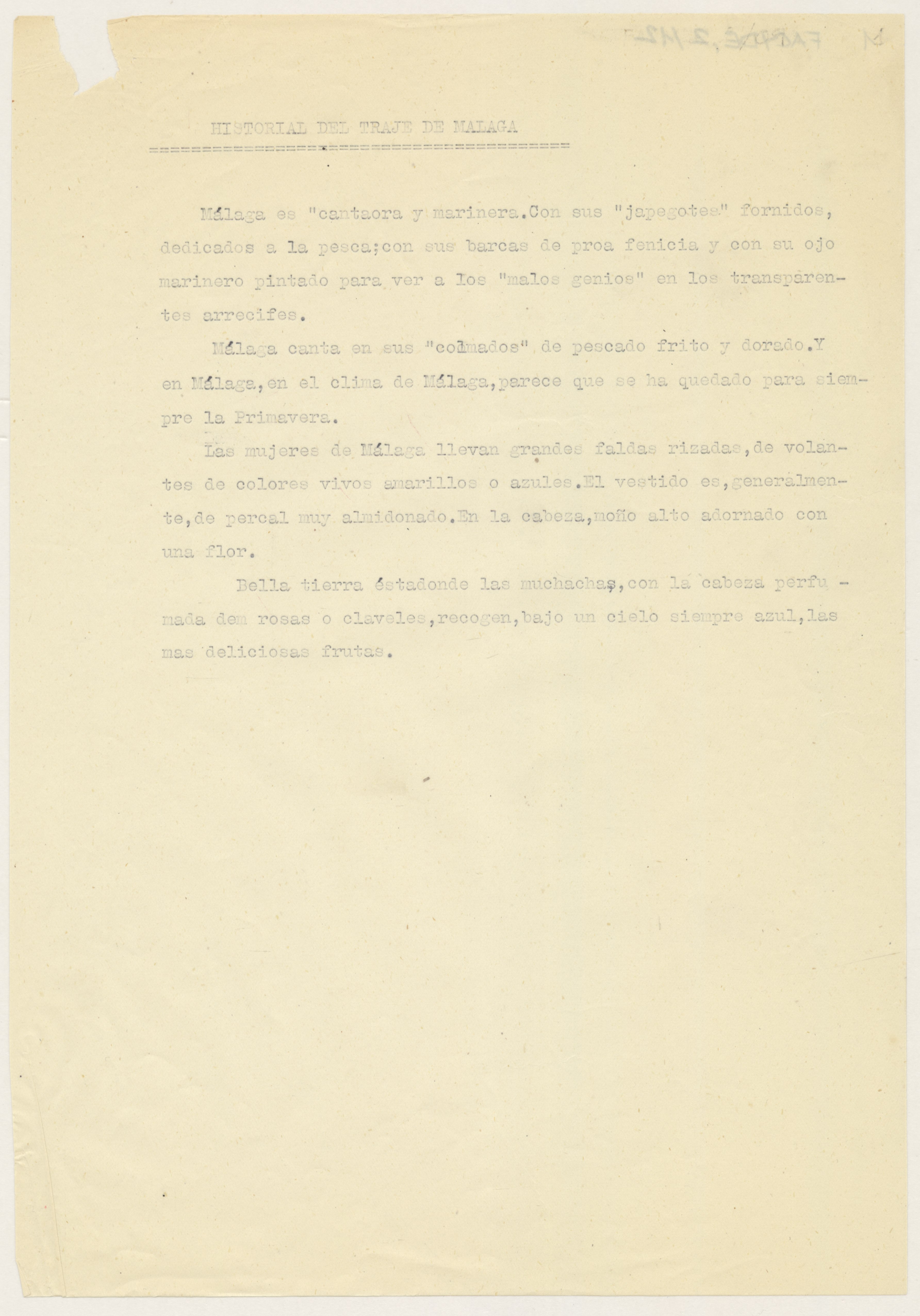 Informe sobre historia del traje de Málaga, con descripción del de malagueña de lujo y del de gitana.
