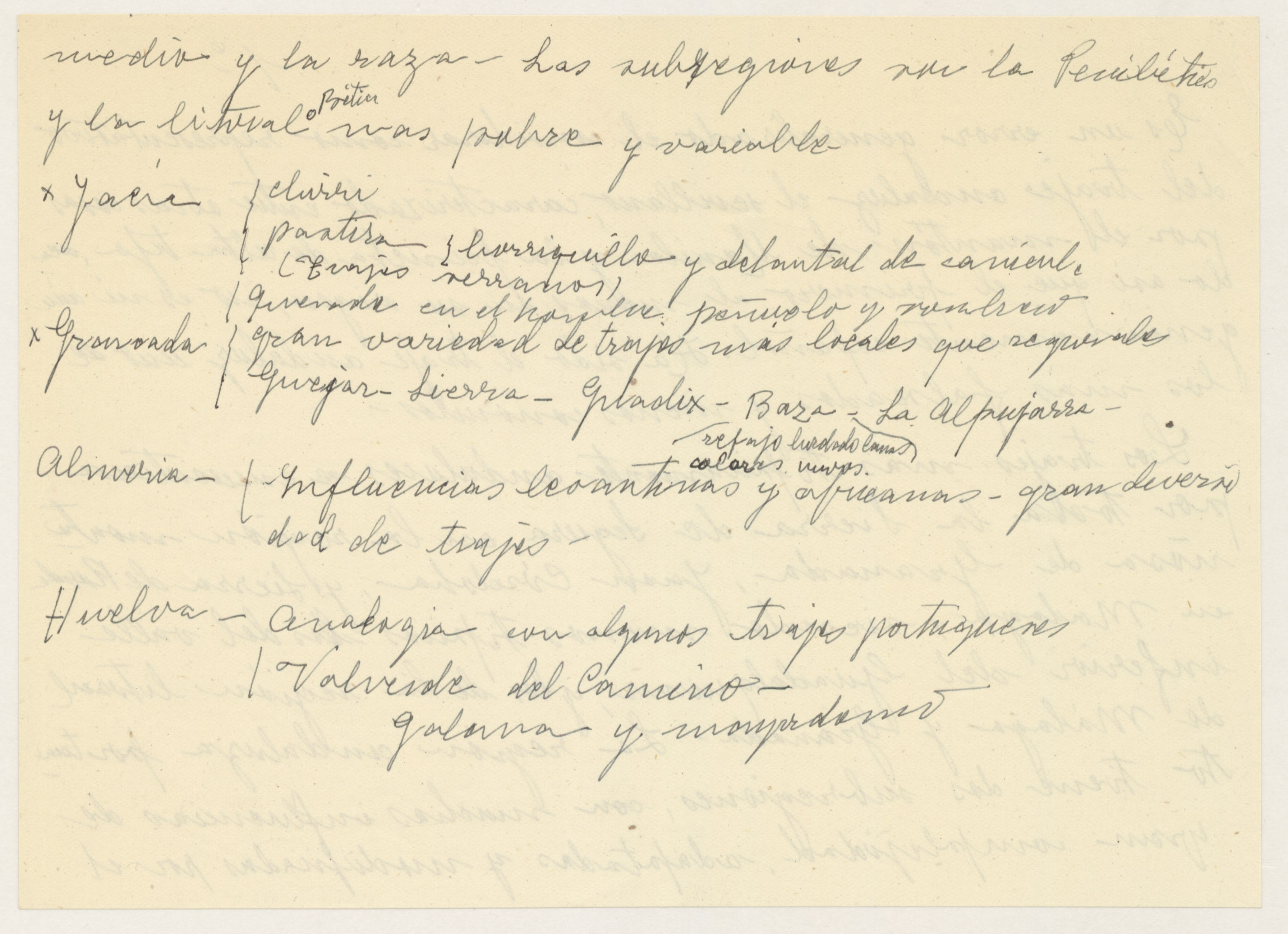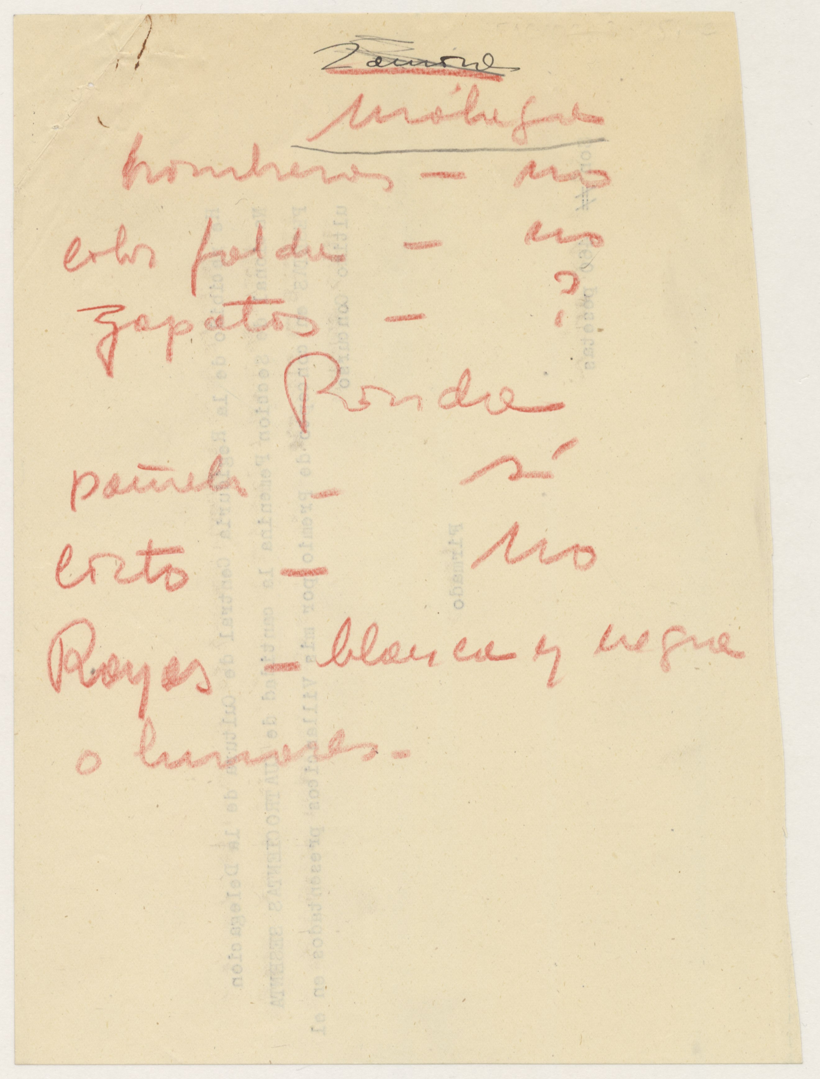 Borrador de informe redactado en papel tamaño cuartilla, manuscrito, sin firma, más una hoja suelta con anotaciones sobre detalles de los trajes.