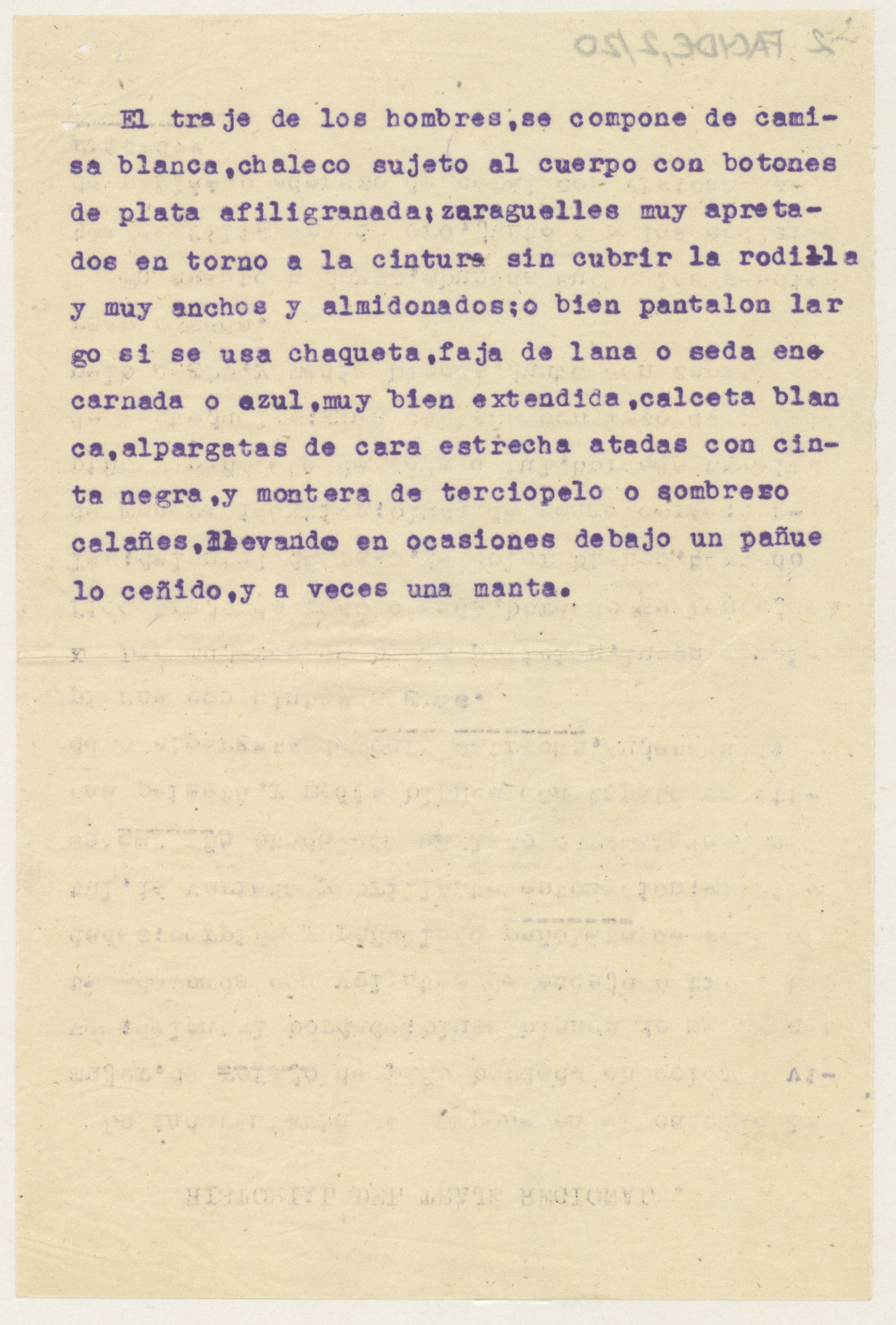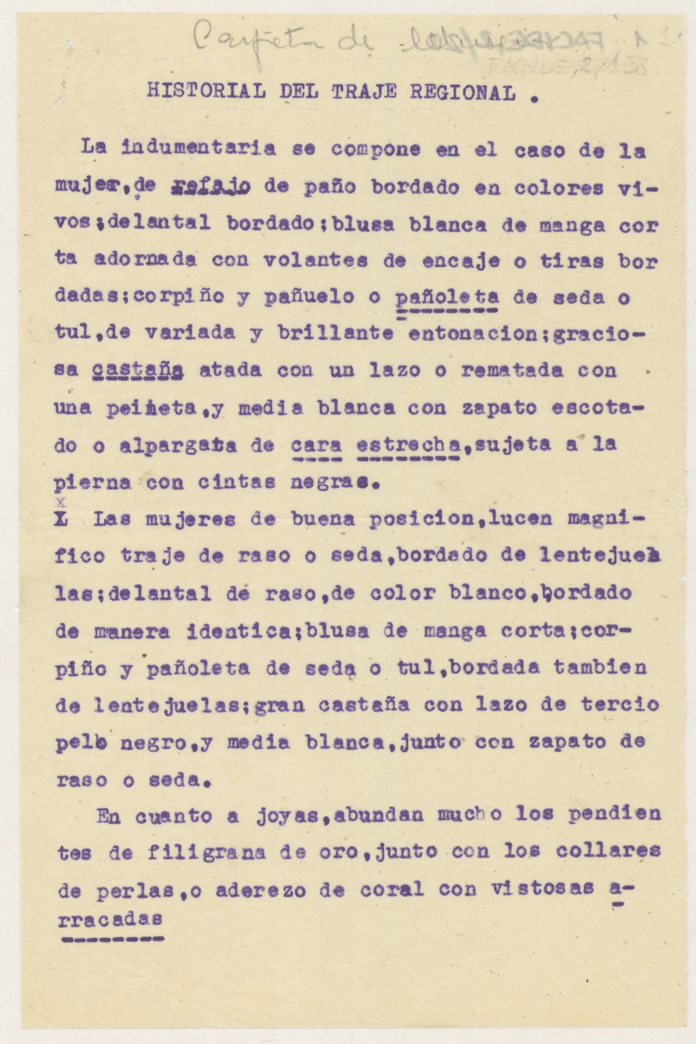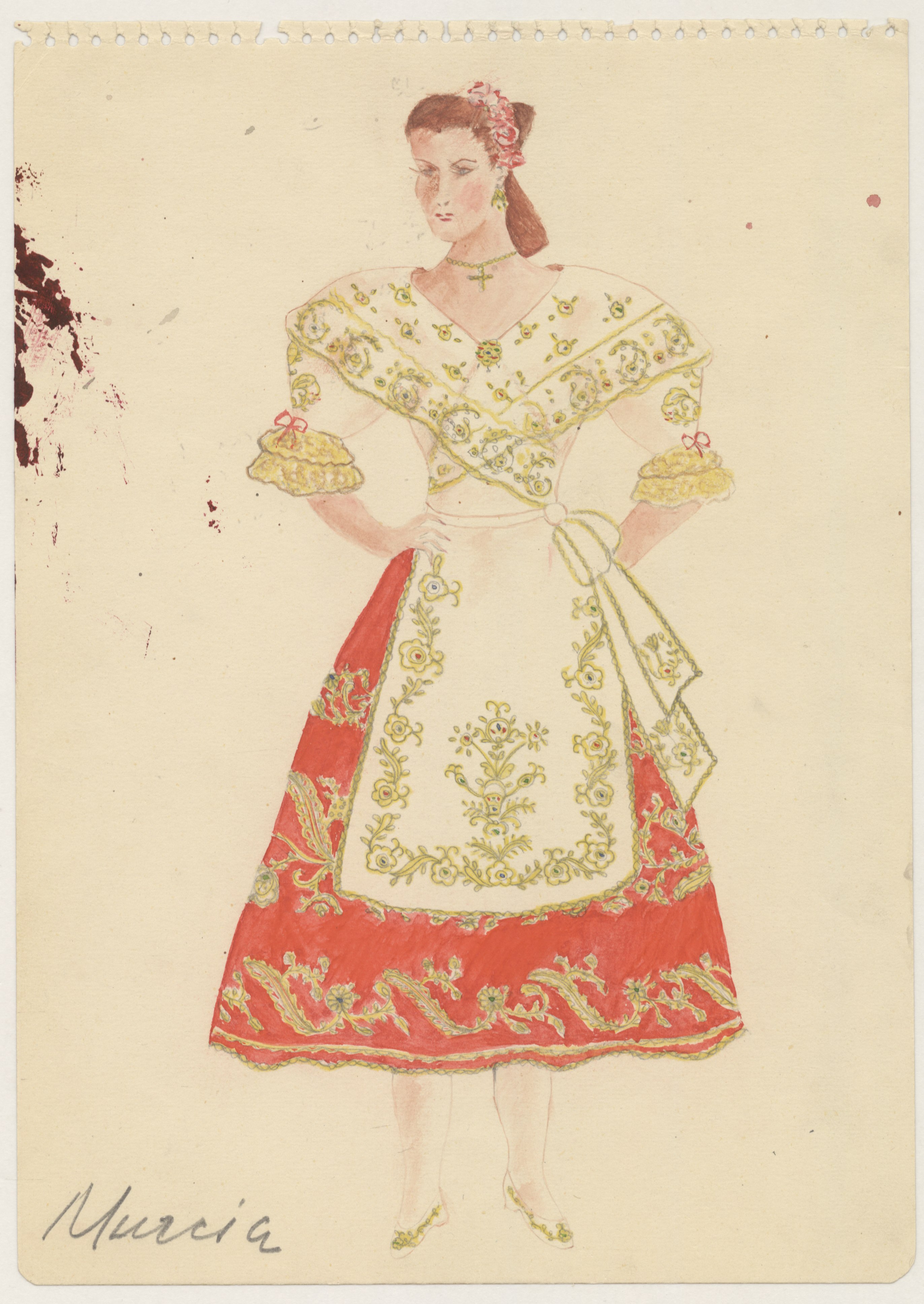 Informe redactado en papel tamaño cuartilla, sin firma, con sello de la Sección de Formación y Jerarquía de la Sección Femenina en Murcia, sobre el traje femenino y el masculino. Dibujo realizado en hoja de cuaderno, a color, representando una figura femenina vestida con el traje típico, vista de frente.