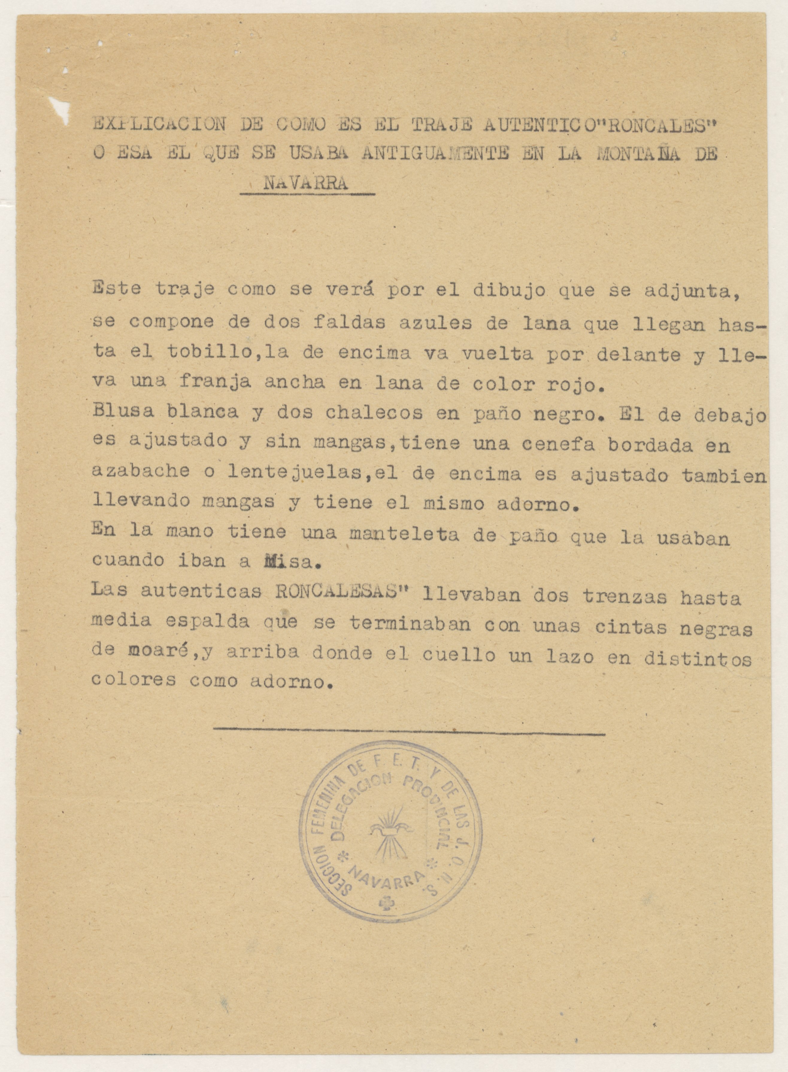Informe sobre el traje típico regional denominado Roncalés.